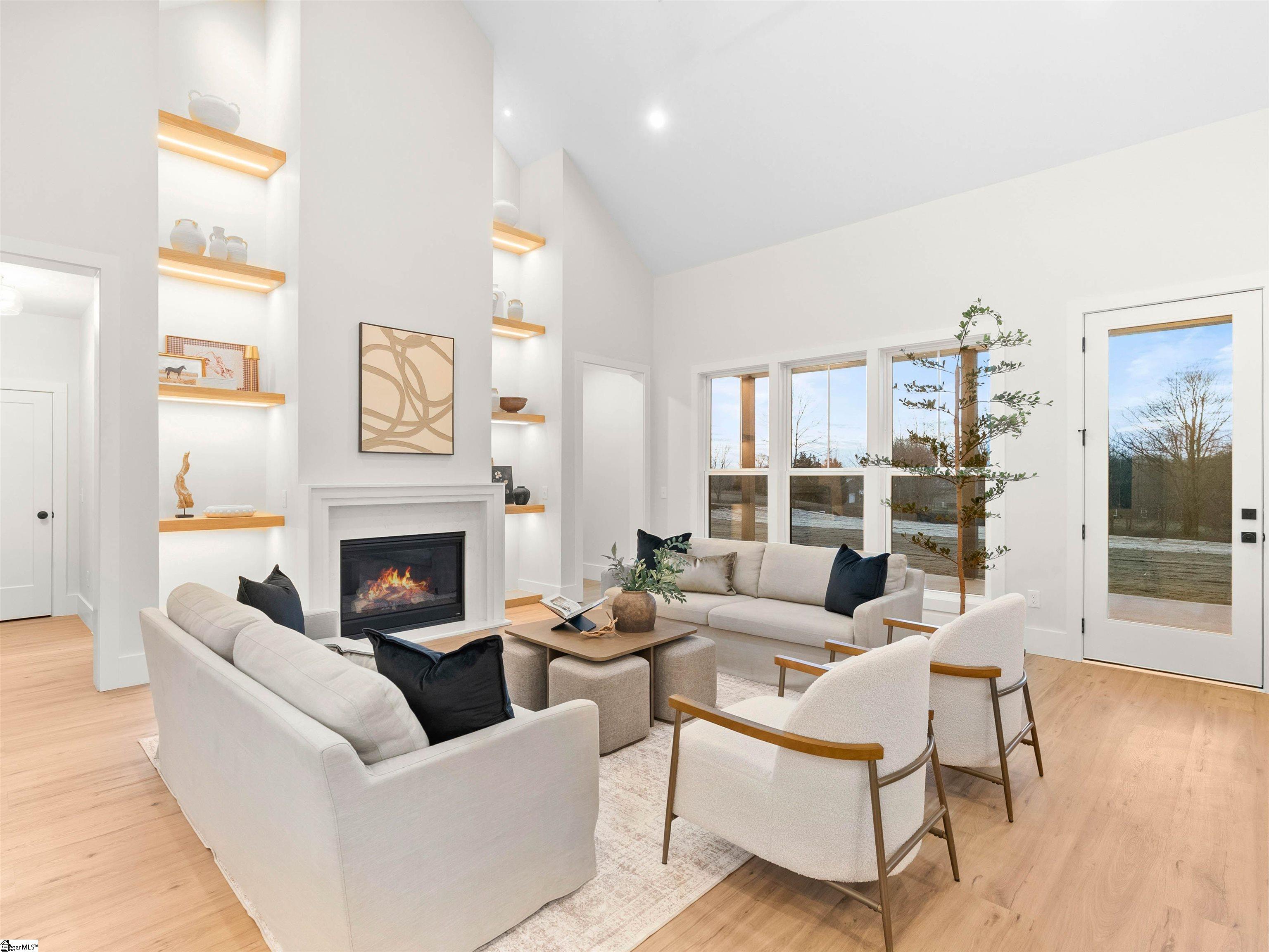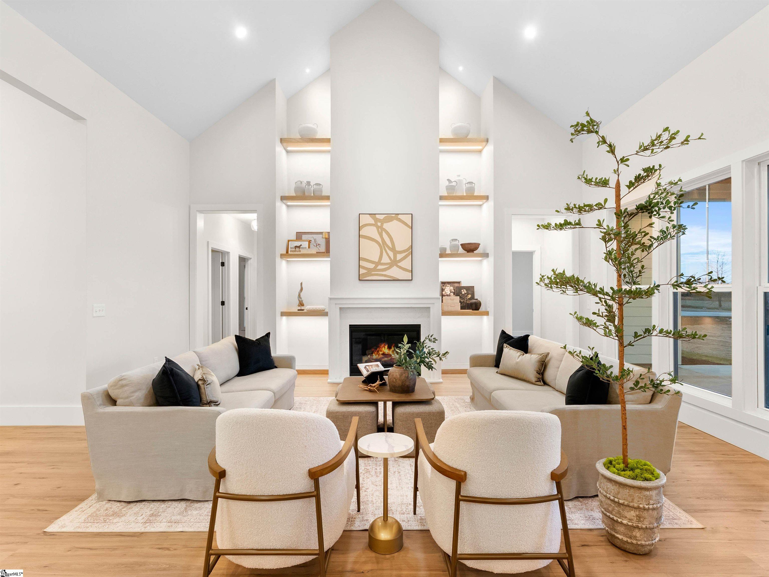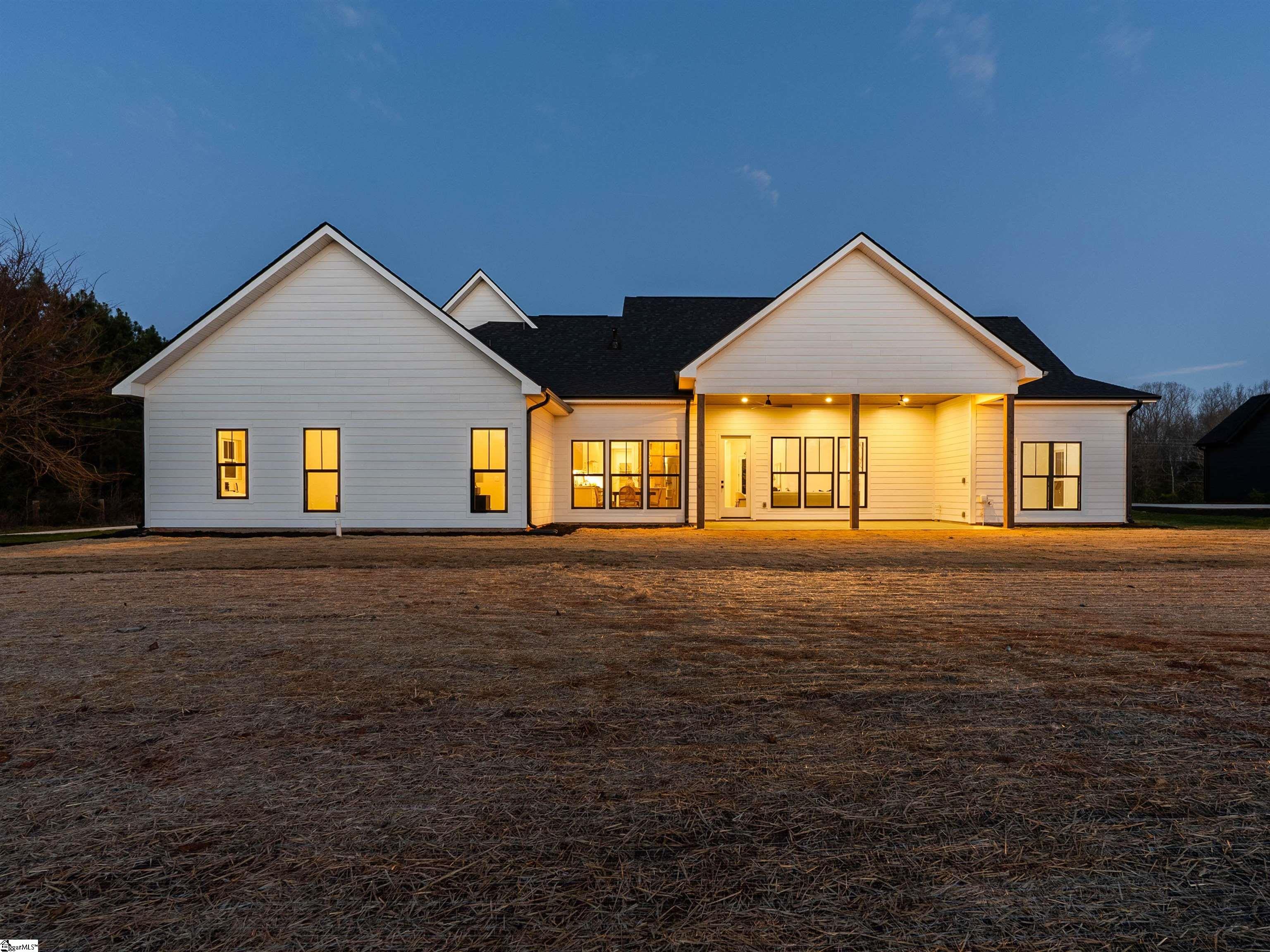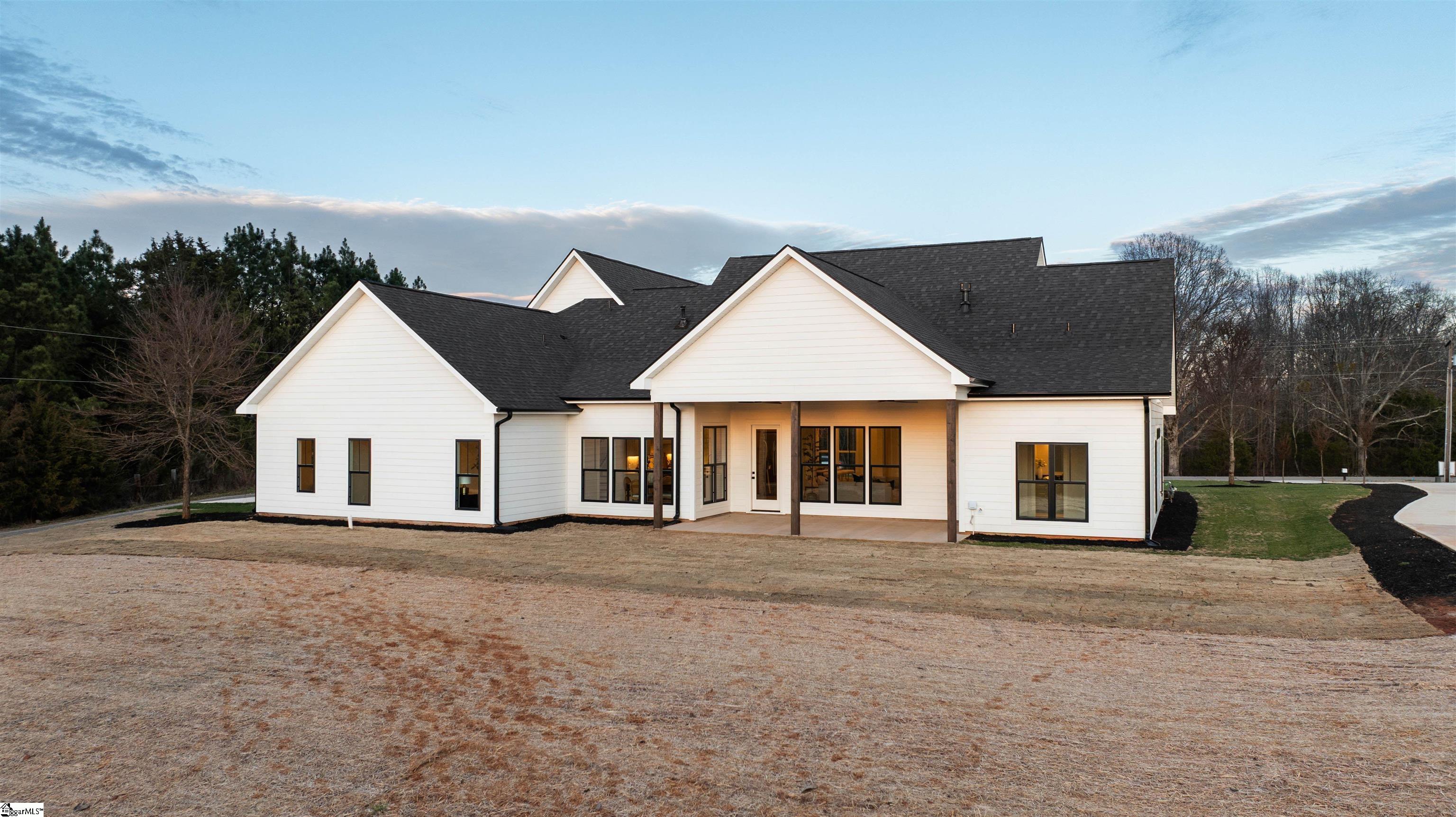 Welcome home to Sunset Acres, a residence that brings multiple generations together. This newly crafted farmhouse stands tall as you pull in to the long paved driveway, occupying 2 acres. Drawing near the entrance, a deep stained tongue and groove patio with a copper gas lantern ushers your arrival. Inside, a foyer draws you into a layout that lives mostly on one level, where movement feels natural and unhurried. Coffered ceilings at twelve feet create a subtle frame for the formal dining. A great room opens wide with vaulted ceilings climbing up to twenty feet. A fireplace lined with custom shelves holds books or treasures under soft, integrated lighting. The kitchen stands as the heart, centered around a quartz island and wrapped in two-tone cabinetry. A built-in refrigerator and concealed microwave hide seamlessly, while a large hood hangs over a ZLINE 8 burner range, a double oven, and a pot filler, ready for any recipe. A café bar with prep sink ready for quick pours in the morning and afternoon pick-me-ups. Beyond, a scullery tucks away everyday messes, keeping the rhythm smooth in the kitchen. Four bedrooms anchor the main floor, including one ensuite for added seclusion. The primary bedroom echoes the home’s airy feel with its own vaulted ceiling and a built-in closet system that organizes life neatly. A discreet closet door connects directly to the laundry room, simplyfing daily flow. After a long day, the primary bath offers a sancuary esape with a freestanding tub and a cascading rainfall shower. A dedicated makeup station built into the vanity with an adjoining linen storage is practical for everyday life. Upstairs, a fifth bedroom transforms into a self-contained retreat. Ideal for an elder, guest or returning family member, with its own kitchenette and full bath, fostering independence. This setup nurtures a multigenerational concept, creating a household that feels both united and respectful of individual needs. Out back, a dark stained tongue-and-groove ceiling hovers over a 24×14 patio, ready for an outdoor kitchen. This 2 acre parcel allows for a variety of recreational hobbies, a garden bed turning soil to blooms, or even a pool to bring the family together for summer BBQs. As day fades, the backyard turns westward, where sunsets unfold in the horizon. Minutes away, Fountain Inn and Simpsonville shops and restaurants add convenience without crowding the peace. Equestrian centers, recently renovated gyms, and local farmer boutiques create an organic lifestyle. At Sunset Acres, your story is yet to be written.