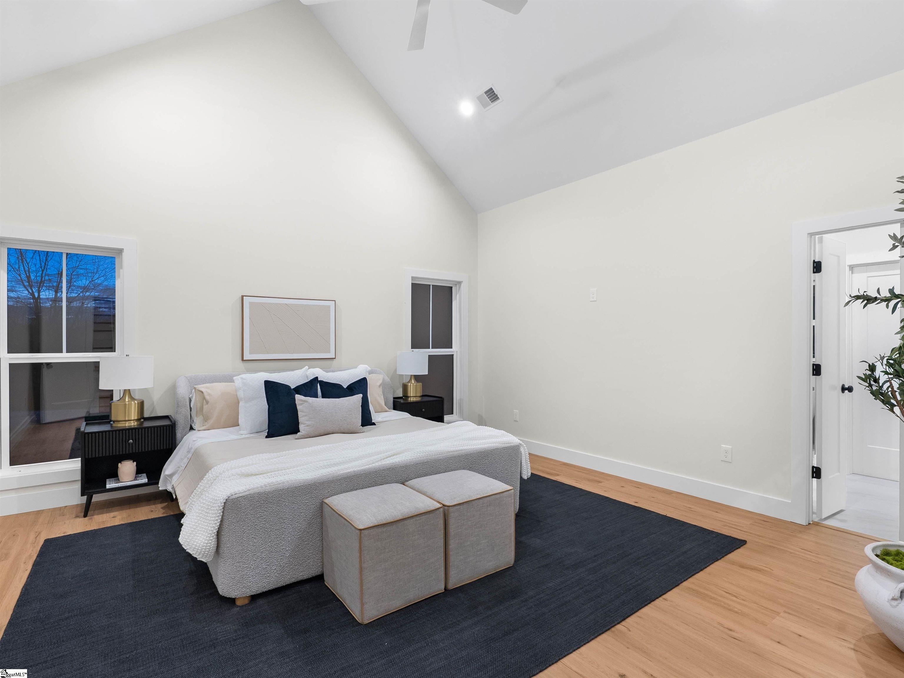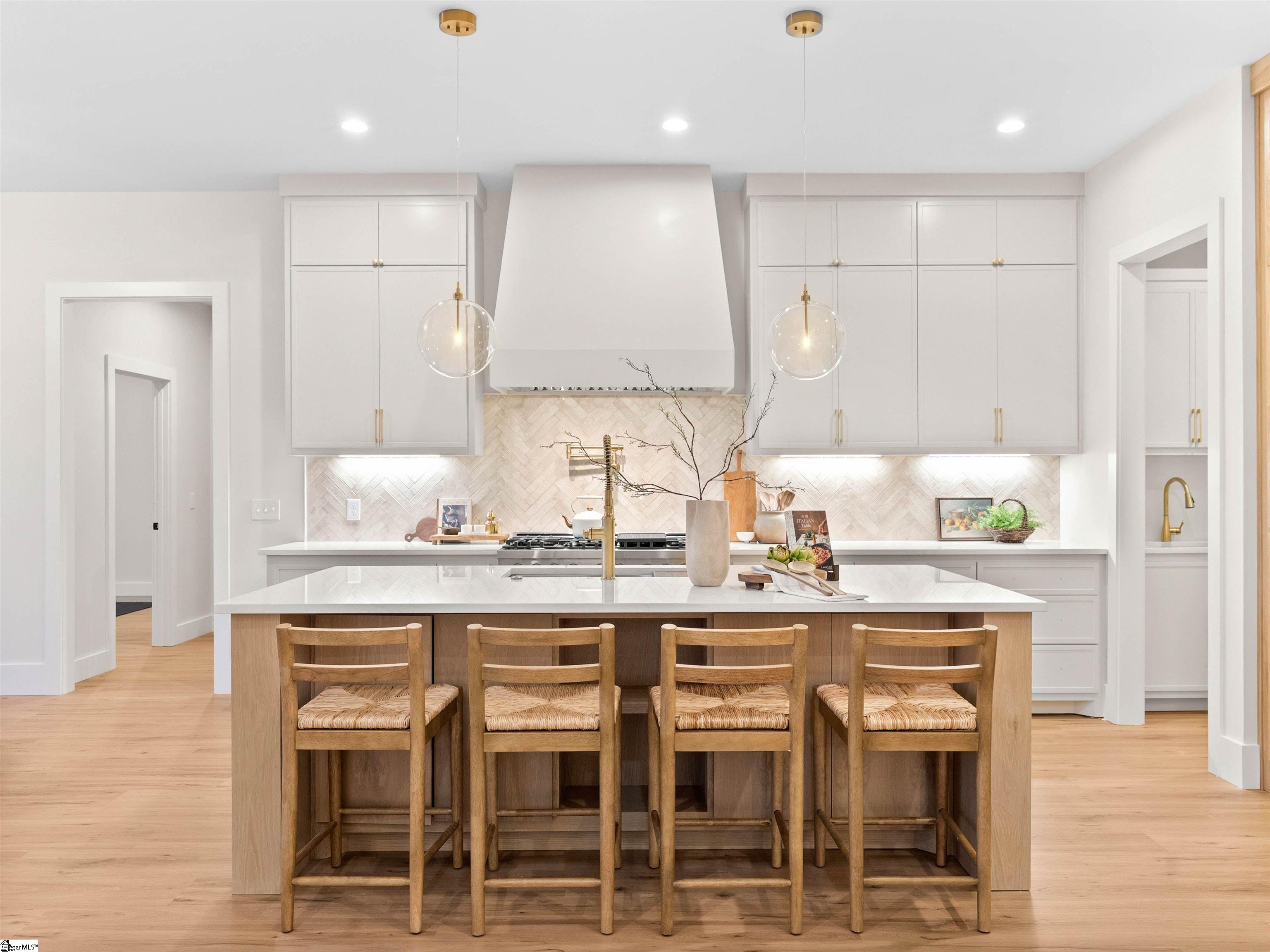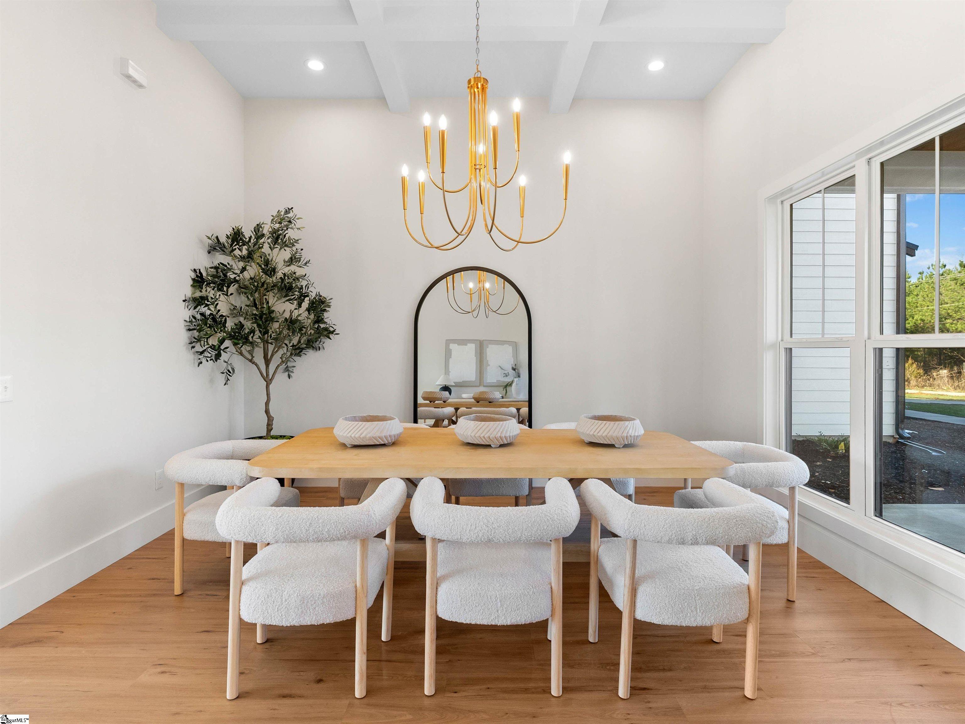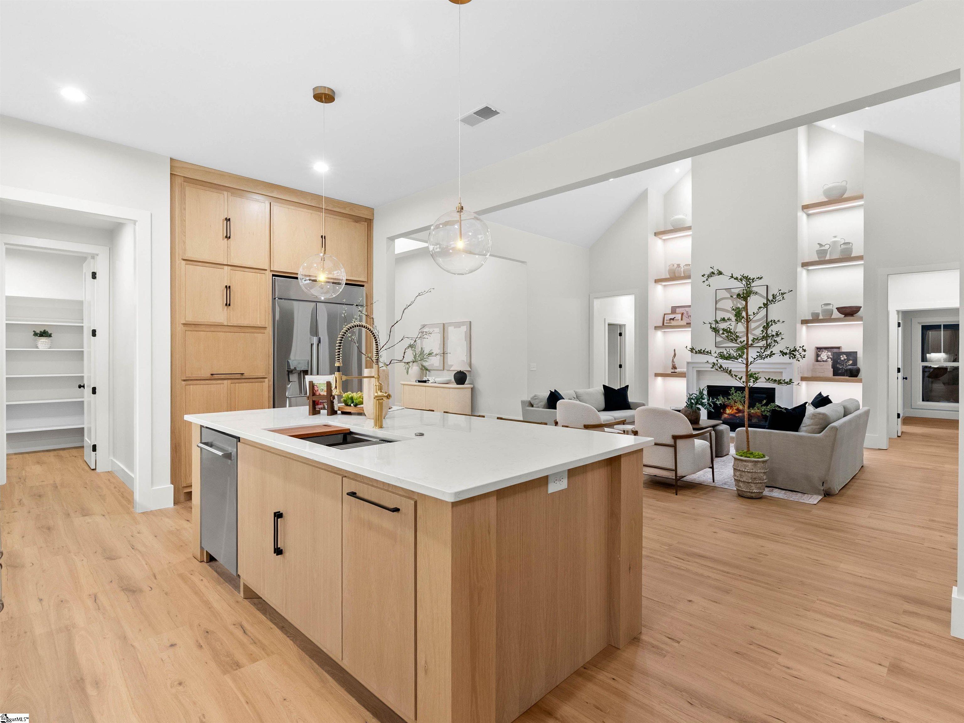 Welcome home to Sunset Acres, a residence that brings multiple generations together. This newly crafted farmhouse stands tall as you pull in to the long paved driveway, occupying 2 acres. Drawing near the entrance, a deep stained tongue and groove patio with a copper gas lantern ushers your arrival. Inside, a foyer draws you into a layout that lives mostly on one level, where movement feels natural and unhurried. Coffered ceilings at twelve feet create a subtle frame for the formal dining. A great room opens wide with vaulted ceilings climbing up to twenty feet. A fireplace lined with custom shelves holds books or treasures under soft, integrated lighting. The kitchen stands as the heart, centered around a quartz island and wrapped in two-tone cabinetry. A built-in refrigerator and concealed microwave hide seamlessly, while a large hood hangs over a ZLINE 8 burner range, a double oven, and a pot filler, ready for any recipe. A café bar with prep sink ready for quick pours in the morning and afternoon pick-me-ups. Beyond, a scullery tucks away everyday messes, keeping the rhythm smooth in the kitchen. Four bedrooms anchor the main floor, including one ensuite for added seclusion. The primary bedroom echoes the home’s airy feel with its own vaulted ceiling and a built-in closet system that organizes life neatly. A discreet closet door connects directly to the laundry room, simplyfing daily flow. After a long day, the primary bath offers a sancuary esape with a freestanding tub and a cascading rainfall shower. A dedicated makeup station built into the vanity with an adjoining linen storage is practical for everyday life. Upstairs, a fifth bedroom transforms into a self-contained retreat. Ideal for an elder, guest or returning family member, with its own kitchenette and full bath, fostering independence. This setup nurtures a multigenerational concept, creating a household that feels both united and respectful of individual needs. Out back, a dark stained tongue-and-groove ceiling hovers over a 24×14 patio, ready for an outdoor kitchen. This 2 acre parcel allows for a variety of recreational hobbies, a garden bed turning soil to blooms, or even a pool to bring the family together for summer BBQs. As day fades, the backyard turns westward, where sunsets unfold in the horizon. Minutes away, Fountain Inn and Simpsonville shops and restaurants add convenience without crowding the peace. Equestrian centers, recently renovated gyms, and local farmer boutiques create an organic lifestyle. At Sunset Acres, your story is yet to be written.