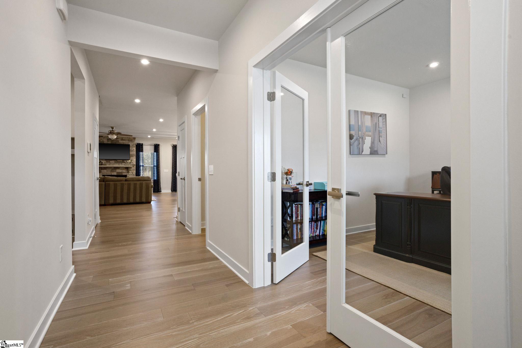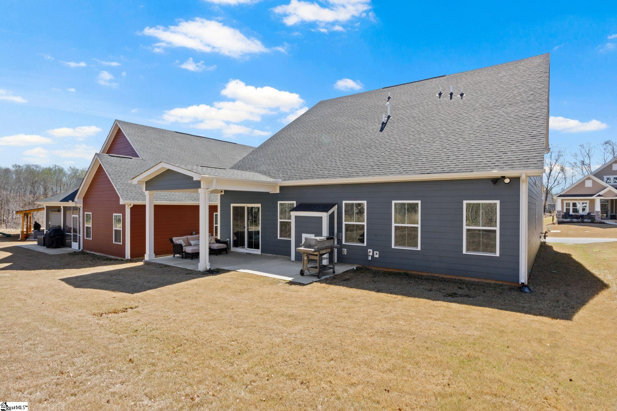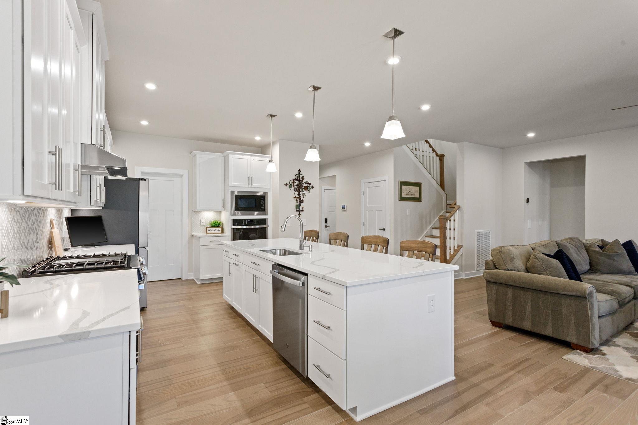 You arrive at 356 Hollythrope Lane and immediately notice something special. Tucked against the quiet green space of the neighborhood, the setting feels private and peaceful, with no backyard neighbors and room to breathe. Step inside and the home welcomes you with intention. Just off the entry, a bright flex room sits behind French doors, perfect for a home office, reading space, or quiet retreat. The flooring flows seamlessly, guiding you into the heart of the home. The main living area opens up in a way that feels both spacious and inviting. The kitchen, dining, and living spaces come together effortlessly, creating a natural place to gather. Whether it’s a busy weekday morning or a weekend with friends, everything feels connected. The kitchen is designed to impress and function at the same time. Quartz countertops with a custom finish catch the light, while the herringbone backsplash adds texture and style. A gas range, built-in microwave, second oven, and walk-in pantry make everyday living easy. The oversized island becomes the center of it all, perfect for casual meals or hosting. Just beyond, the living room offers a cozy place to unwind, anchored by a gas fireplace that makes the space feel warm and welcoming. The dining area sits nearby, ready for everything from simple dinners to holiday gatherings. One of the most desirable features of this home is found on the main level. The primary suite is thoughtfully placed for comfort and privacy, something rarely offered in this community. Inside, a trey ceiling adds dimension, while the ensuite bath creates a spa-like feel with a tiled shower, double sinks, and a comfort-height vanity topped with quartz. Upstairs, the home continues to offer flexibility. A spacious loft can become a second living area, game room, or creative space. Three additional bedrooms provide plenty of room, including one with its own private bath. Two full bathrooms and a walk-in attic with generous storage complete the upper level. Step outside and you’ll understand what makes this home truly stand out. The covered patio invites you to slow down and enjoy the view of the open green space behind you. It’s the kind of setting that’s hard to find and easy to love. Thoughtful upgrades, including a central vacuum system, add convenience and value throughout the home. And the location makes daily life even easier: • 2.3 miles to Heritage Park and Amphitheater • 2.2 miles to Downtown Fountain Inn • 4 miles to Fairview Road shopping and dining • About 25 minutes to Downtown Greenville 356 Hollythrope Lane offers a rare combination of privacy, thoughtful design, and everyday comfort. It’s a home that truly lives as beautifully as it looks. Schedule your private showing and come experience it for yourself.