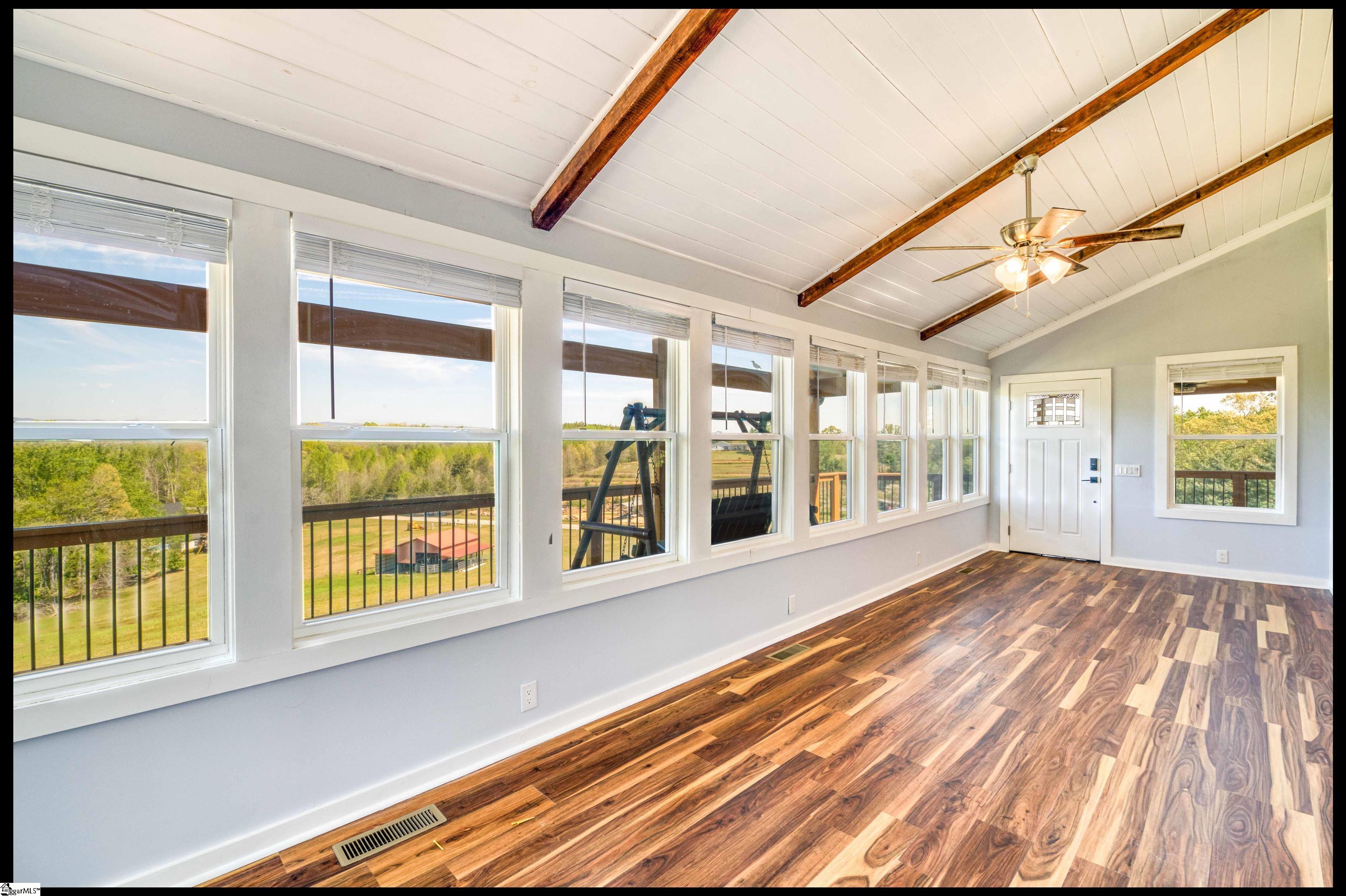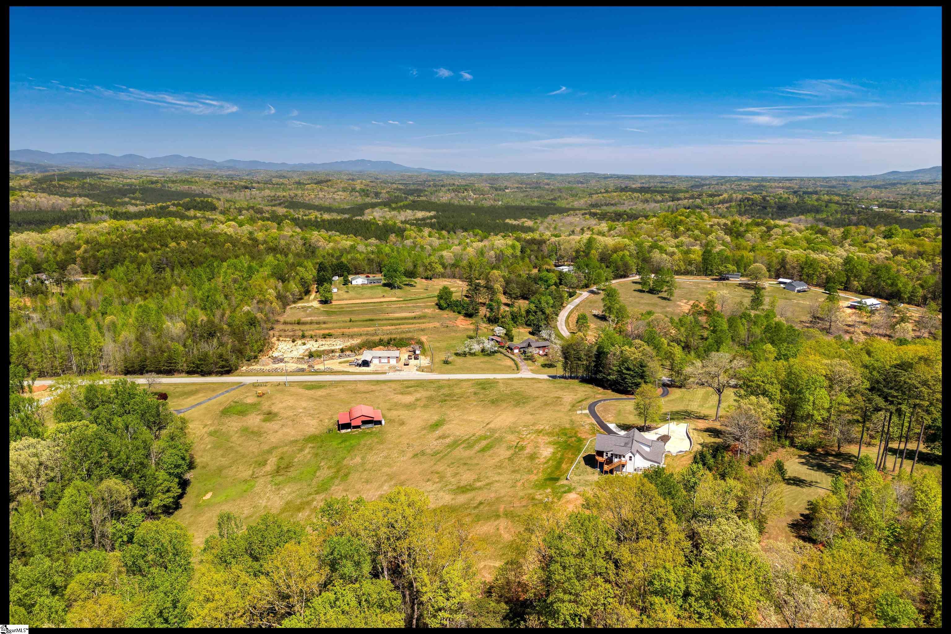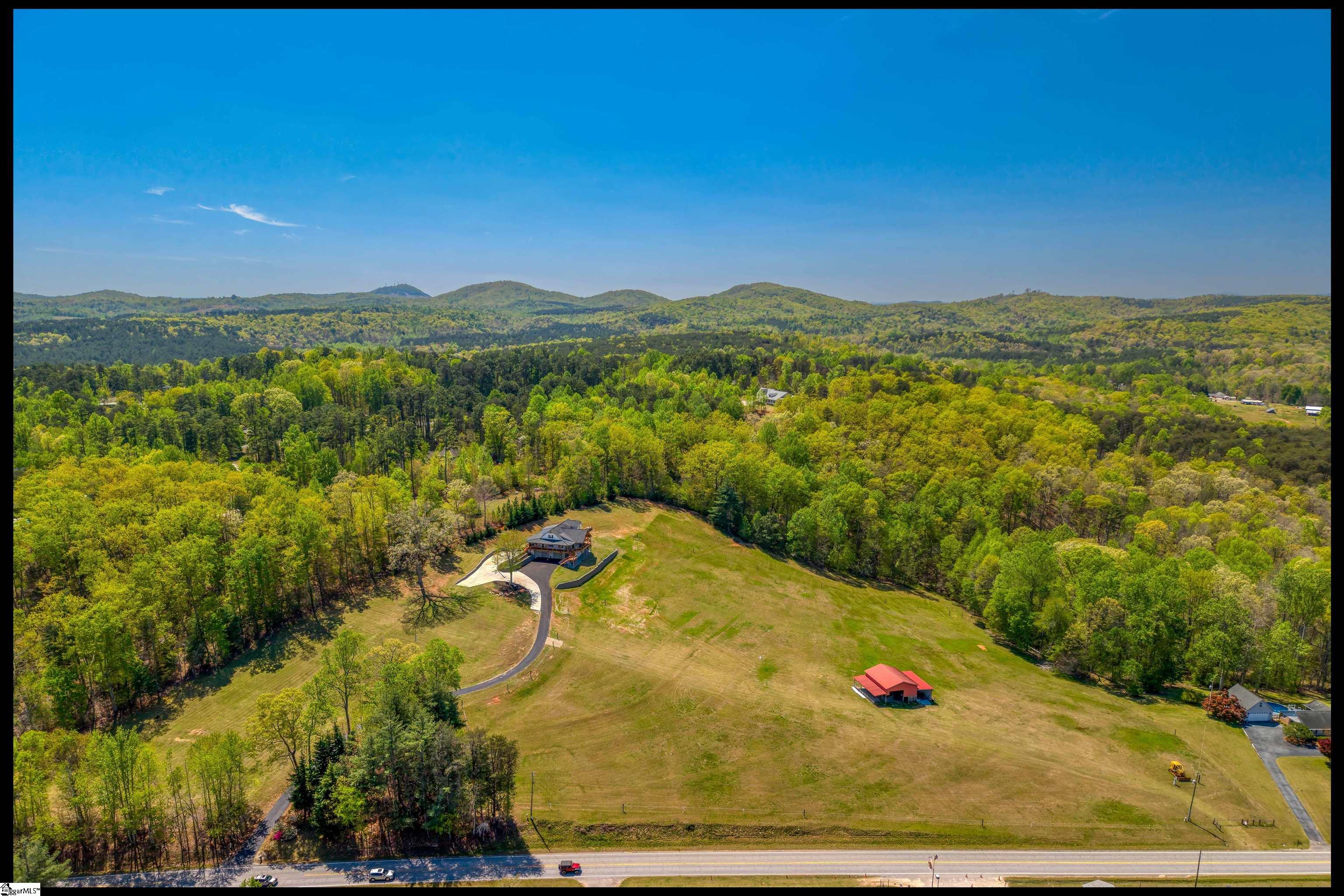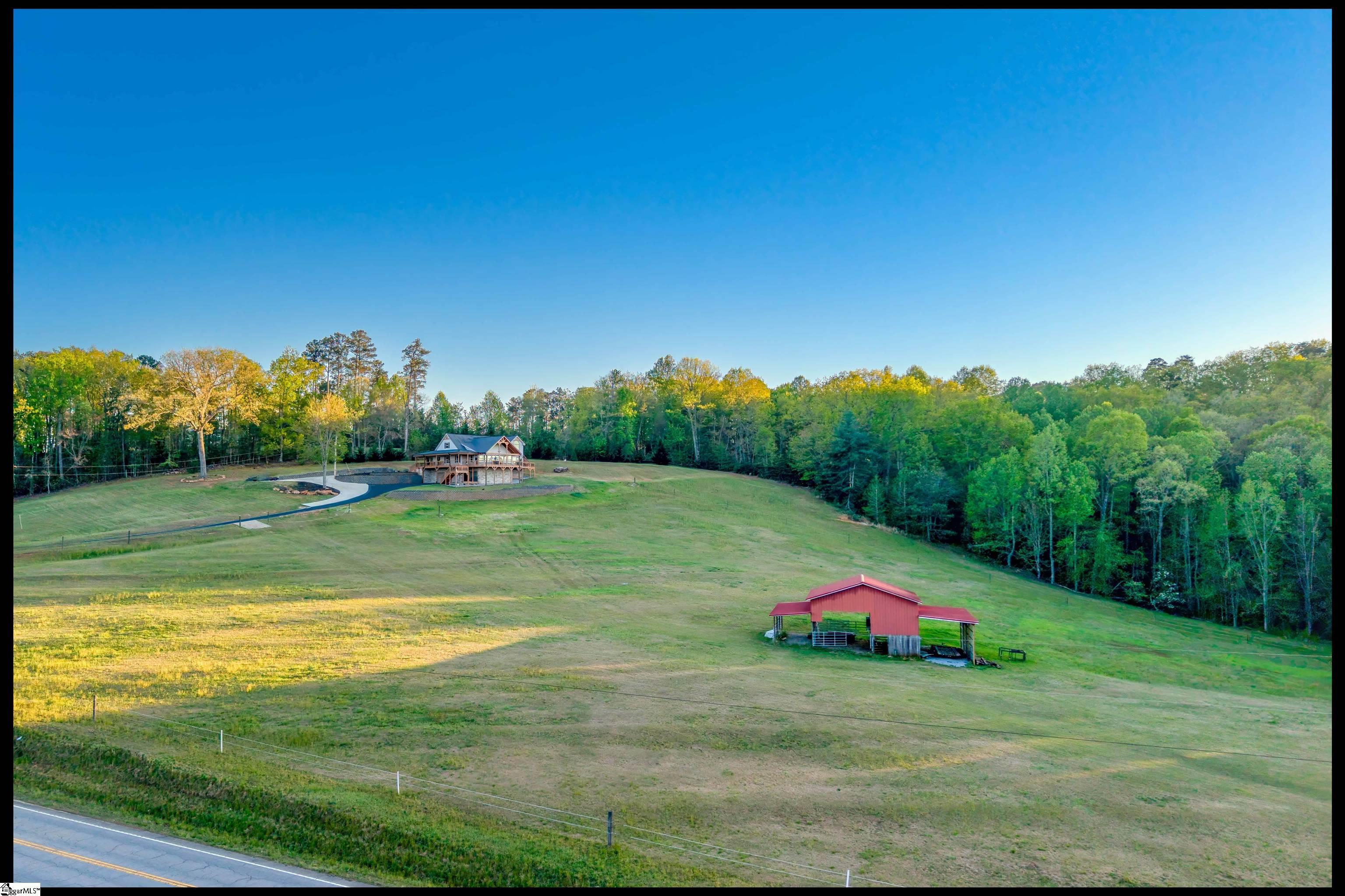 Welcome to 3803 Dacusville Highway, where rustic farmhouse charm meets modern comfort on approximately 11.2 acres of beautiful rolling pasture land in Easley, South Carolina. Perched atop a scenic hill, this thoughtfully remodeled home offers breathtaking mountain views, peaceful surroundings, and the perfect balance of privacy and functionality. A welcoming wraparound porch spans much of the home, providing the ideal setting to enjoy panoramic views of the mountains, pasture, and unforgettable sunsets. Inside, rich hardwood floors and abundant natural light create a warm and inviting atmosphere throughout the main level. The open concept living area features exposed wood beams, shiplap accents, and a gas stone fireplace that serves as a cozy focal point while seamlessly connecting the living, dining, and kitchen spaces. The kitchen is designed for both everyday living and entertaining, offering white cabinetry, granite countertops, built in appliances including a wall oven and microwave, a decorative tile backsplash, and a dedicated pantry for convenient storage. A bright sunroom filled with natural light showcases stunning views of the surrounding landscape and provides direct access to the porch, creating a peaceful space to relax and unwind. The main level primary suite offers a spacious retreat with hardwood flooring and private access to the sunroom. The luxurious en suite bathroom features dual vanities, marble style tile flooring, a frameless glass walk in rain shower with bench, a freestanding soaking tub, and two large walk in closets. An additional flex room on the main level provides versatility for a home office, nursery, or fitness space. Upstairs, you will find two additional bedrooms along with a full bathroom and a bonus room attached to one of the bedrooms, offering flexible space for a sitting area, office, or recreational use. The oversized garage is designed with both convenience and functionality in mind, providing space for up to four vehicles along with a half bath, sink, durable finished flooring, and ample electrical outlets. An electric lift offers easy access between the garage and main living area. Outside, the property features open pastureland and a spacious barn with loft, power, and water already in place, making it well suited for horses, livestock, or hobby farming. Portions of the pasture fencing are currently installed, and the owner is willing to consider an allowance for completion of fencing along the front of the property and driveway as illustrated in photos. Originally an older farmhouse, the home has been carefully expanded and updated while preserving elements of its historic character. The result is a unique property that combines timeless farmhouse style with modern amenities and comfortable living. With scenic views, functional acreage, and room to grow, 3803 Dacusville Highway offers a rare opportunity to enjoy peaceful country living just minutes from Easley, Greenville, and the natural beauty of the Upstate.