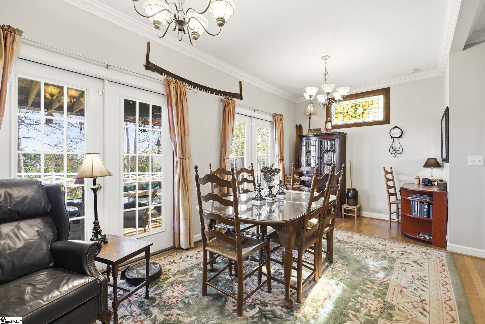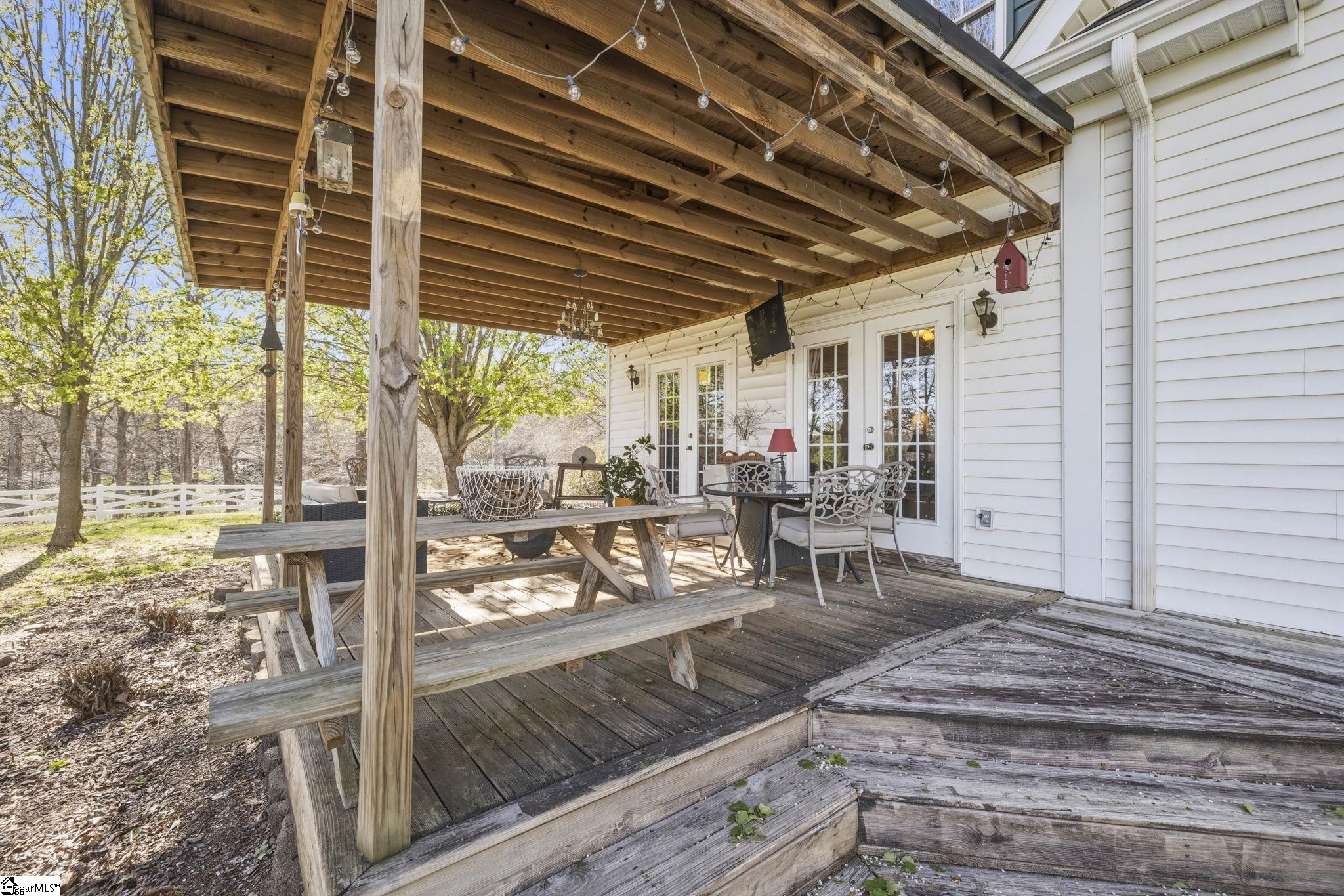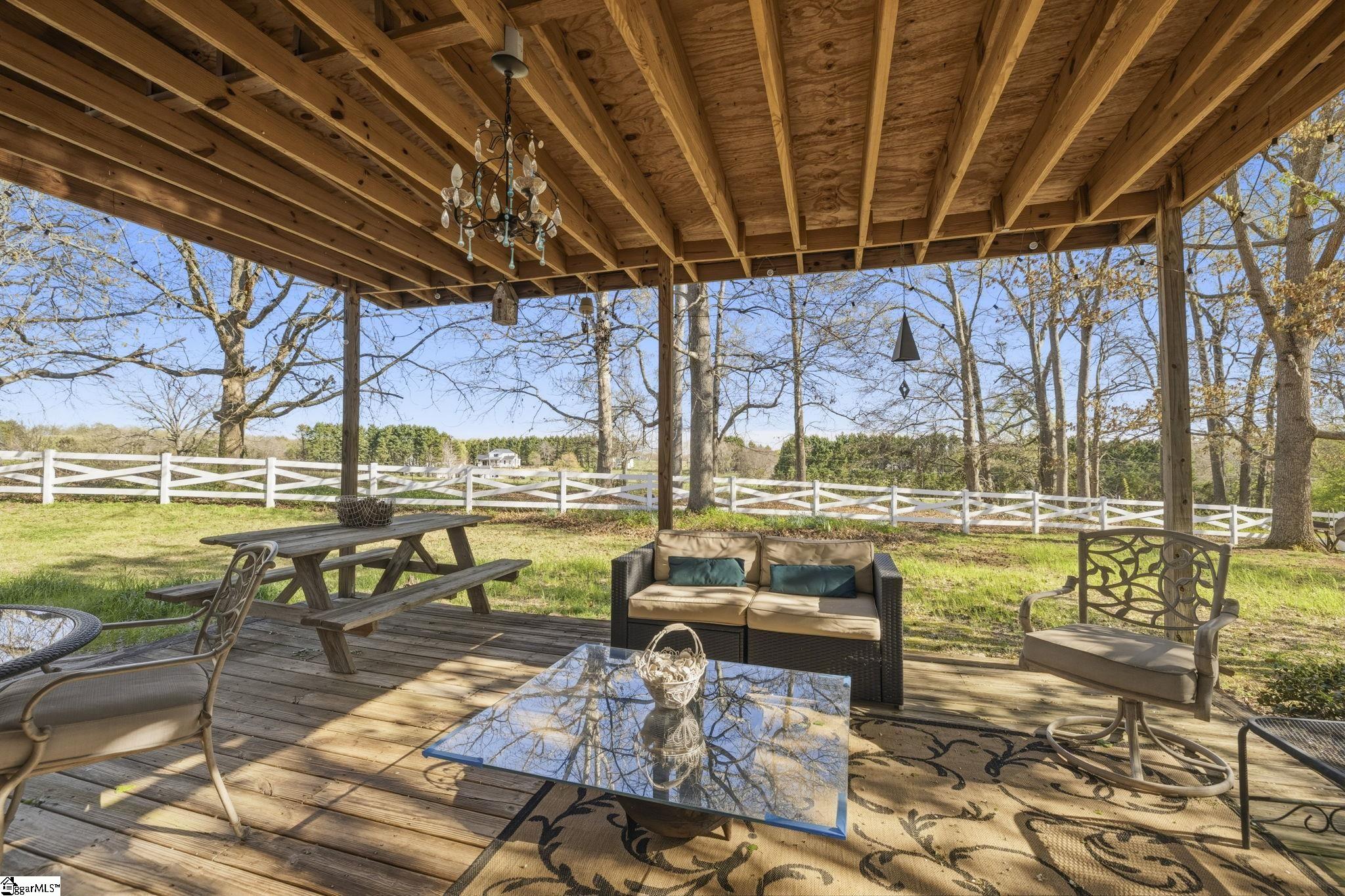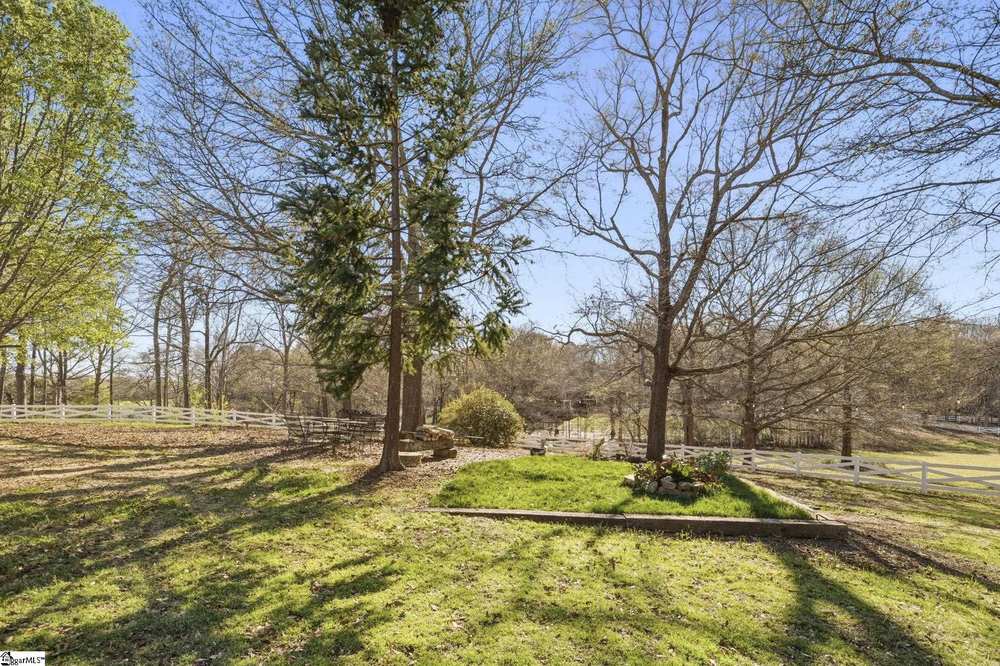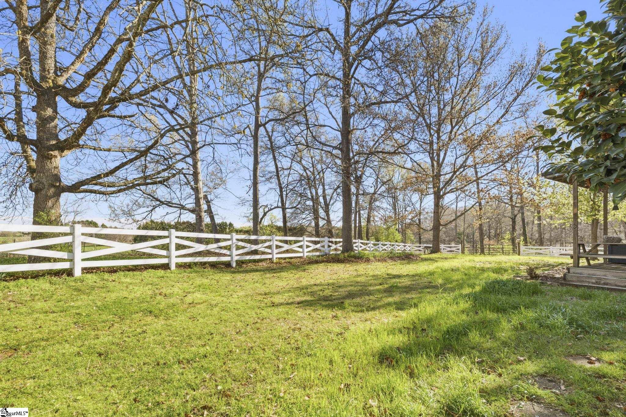 Gorgeous estate on over 8 acres featuring a pond, creek, and peaceful pastureland. Originally the site of Henderson’s Dairy Farm, this property blends history, privacy, and natural beauty. A long driveway flanked by white picket fencing leads you to the home, perfectly nestled among mature trees and lush landscaping with serene views of the pond and rolling pasture. A columned front porch welcomes you into the warm, spacious interior. The living room offers a cozy gas-log fireplace, while the large kitchen features quartz countertops, a full appliance package including a stove with warming drawer, walk in pantry with custom shelving, and abundant prep and storage space. The kitchen transitions easily into an expansive dining area—large enough to include a casual seating space—and highlights a stunning stained-glass window dating back over 100 years from England. Gorgeous hardwood floors flow throughout the main level. The dining area opens to a covered porch with ample room for grilling, dining, and relaxing. A generous laundry room includes storage, a sink, and outdoor access. A cleverly designed hidden door reveals under-stair storage, with the potential to add a second opening and create the perfect doggy den. A powder room rounds out the main floor. Access the second level via either the main staircase or the private back staircase. At the top of the back stairs, you’ll find the primary suite retreat, complete with a vaulted ceiling, sitting area, workspace nook, jetted tub, dual sinks, oversized tile-surround shower, and four walk-in closets—two ideal for storage, crafting, or even a small nursery. Using the main staircase, you’ll find two additional bedrooms, each with its own private bath and walk-in closet. This one-owner home was thoughtfully designed to maximize space, storage, and comfort—from water spigots in the insulated 3-car attached garage and on each side of the home, to electricity in the outside seating areas, to a well-planned workshop area with electricity, water and generator hookup. A detached garage offers soaring ceilings tall enough for an RV, boat, golf cart, and side-by-side, and/or room for up to four cars. The concrete has been poured thick enough to add a car lift. It includes a workshop area with a private room already plumbed for a sink and toilet, as well as water, electricity, and a yard door. As an added bonus, there is already an electric fence in place around the perimeter of the property if needed for pets! The property offers effortless access to the outdoors, with views of the picturesque grounds from virtually every window. A rare opportunity to own a thoughtfully crafted estate where privacy, history, and modern comfort come together in one extraordinary setting. Welcome Home.