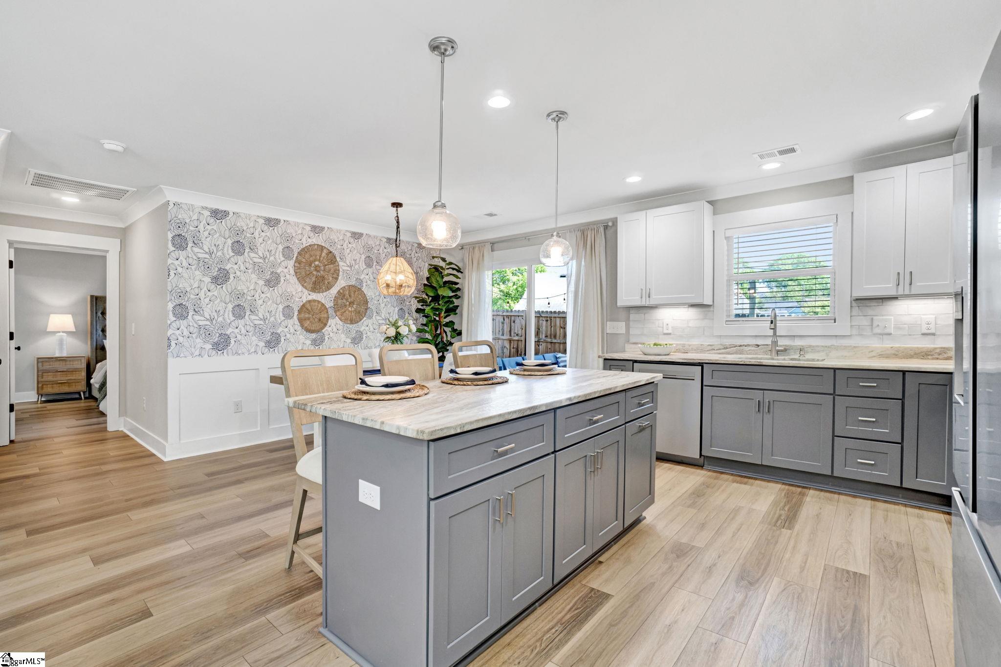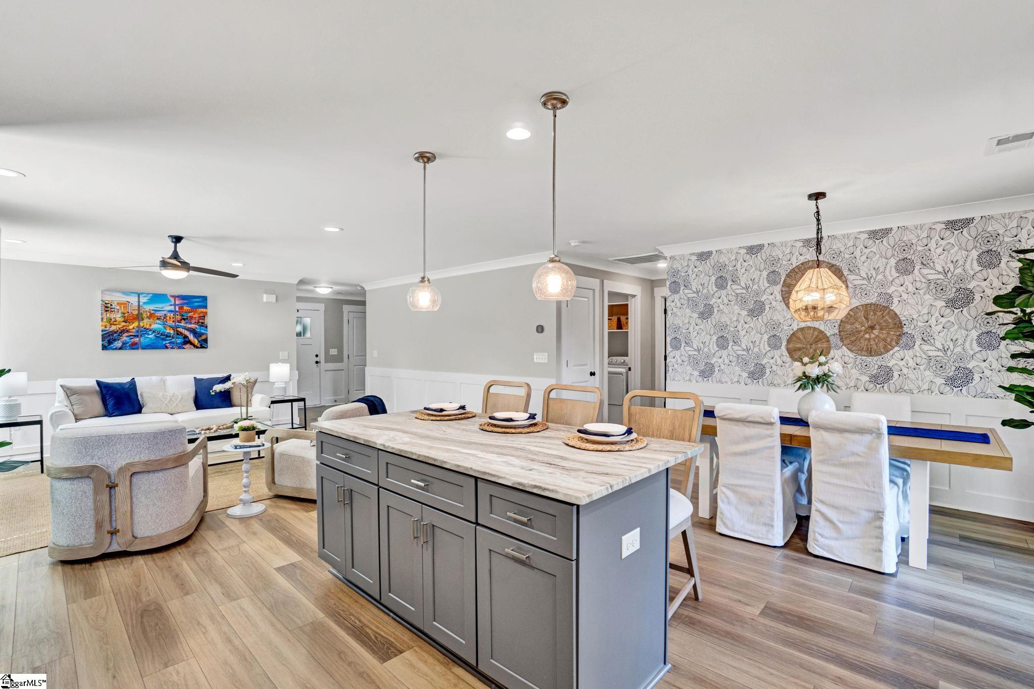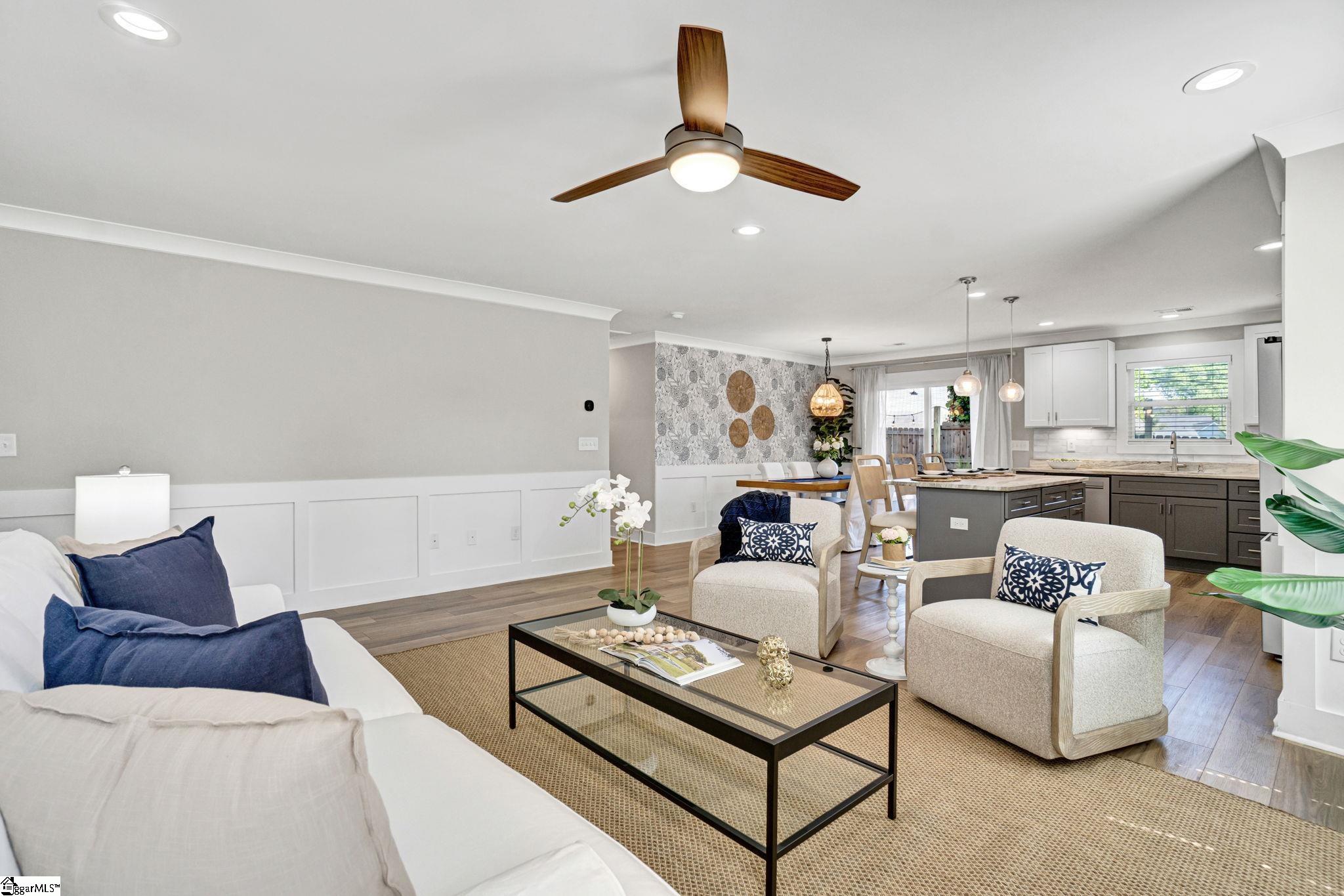Welcome to 4 McArthur St, where modern design meets easy living just minutes from downtown Greenville. Built in 2023, this 3 bedroom, 2 bathroom home offers a clean, open layout that fits today’s lifestyle. Step inside to LVP flooring that runs throughout the entire home, giving the home a fresh look and low maintenance feel. The open concept design connects the living room, dining space, and kitchen, making it easy to stay connected whether you’re hosting friends or enjoying a quiet night in. A custom built fireplace anchors the living room and adds warmth and character. The kitchen is built to impress with quartz countertops, stainless steel appliances, a large island for prep and seating, and a pantry for added storage. The layout is both functional and inviting, ideal for everyday living and entertaining. The primary suite offers a calm retreat with custom closet shelving that keeps everything organized. Two additional bedrooms provide flexibility for guests, a home office, or hobbies. Outside, enjoy a fenced yard and a patio space perfect for grilling, relaxing, or gathering with friends. The hardi board exterior offers durability and easy upkeep, while the extended driveway provides extra parking. With no HOA and a location that puts you close to the Village of Greenville and just minutes from downtown, this home offers both freedom and convenience. Enjoy walkable access to local spots while still having your own private space to unwind. This is a great fit for those looking for newer construction, low maintenance living, and a location that keeps you connected to everything Greenville has to offer.