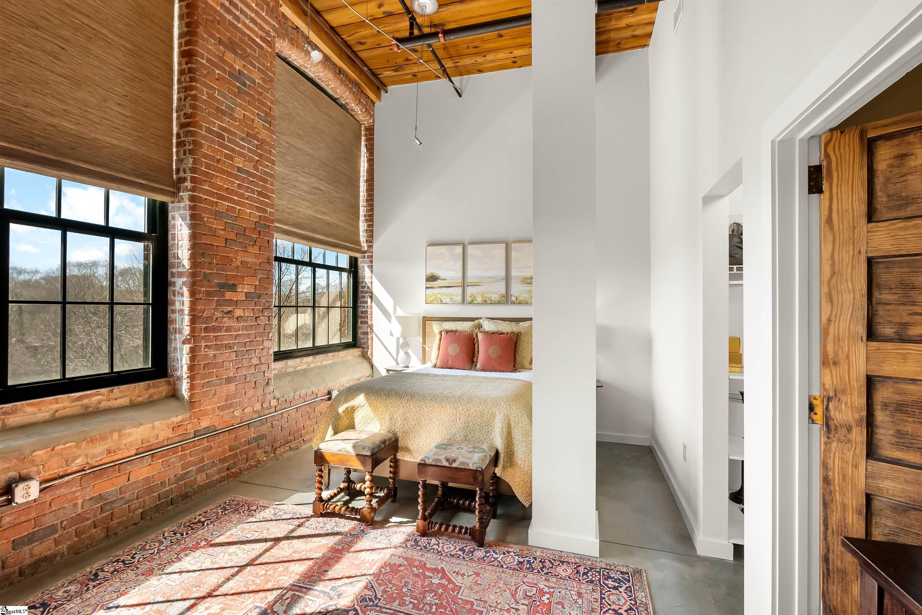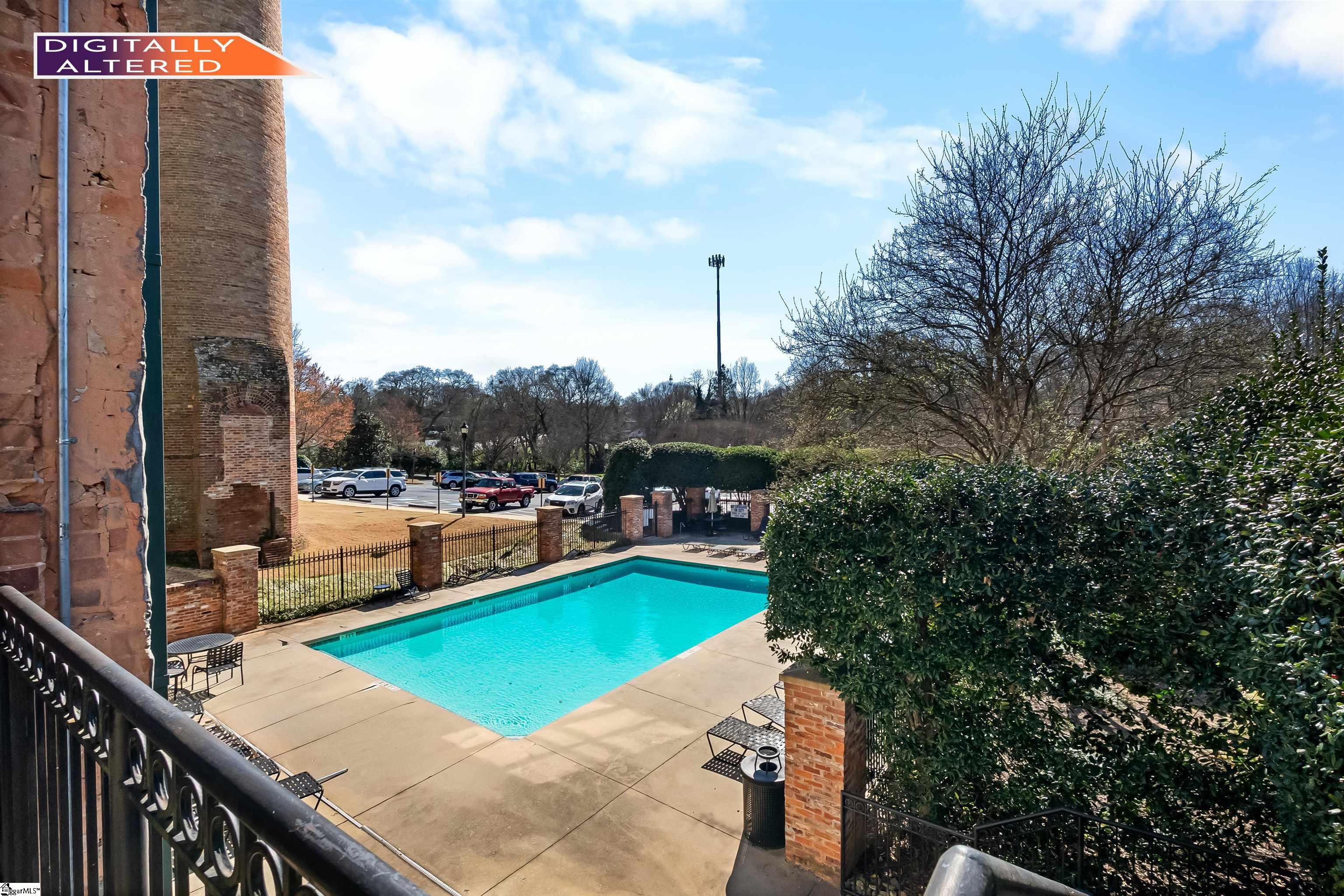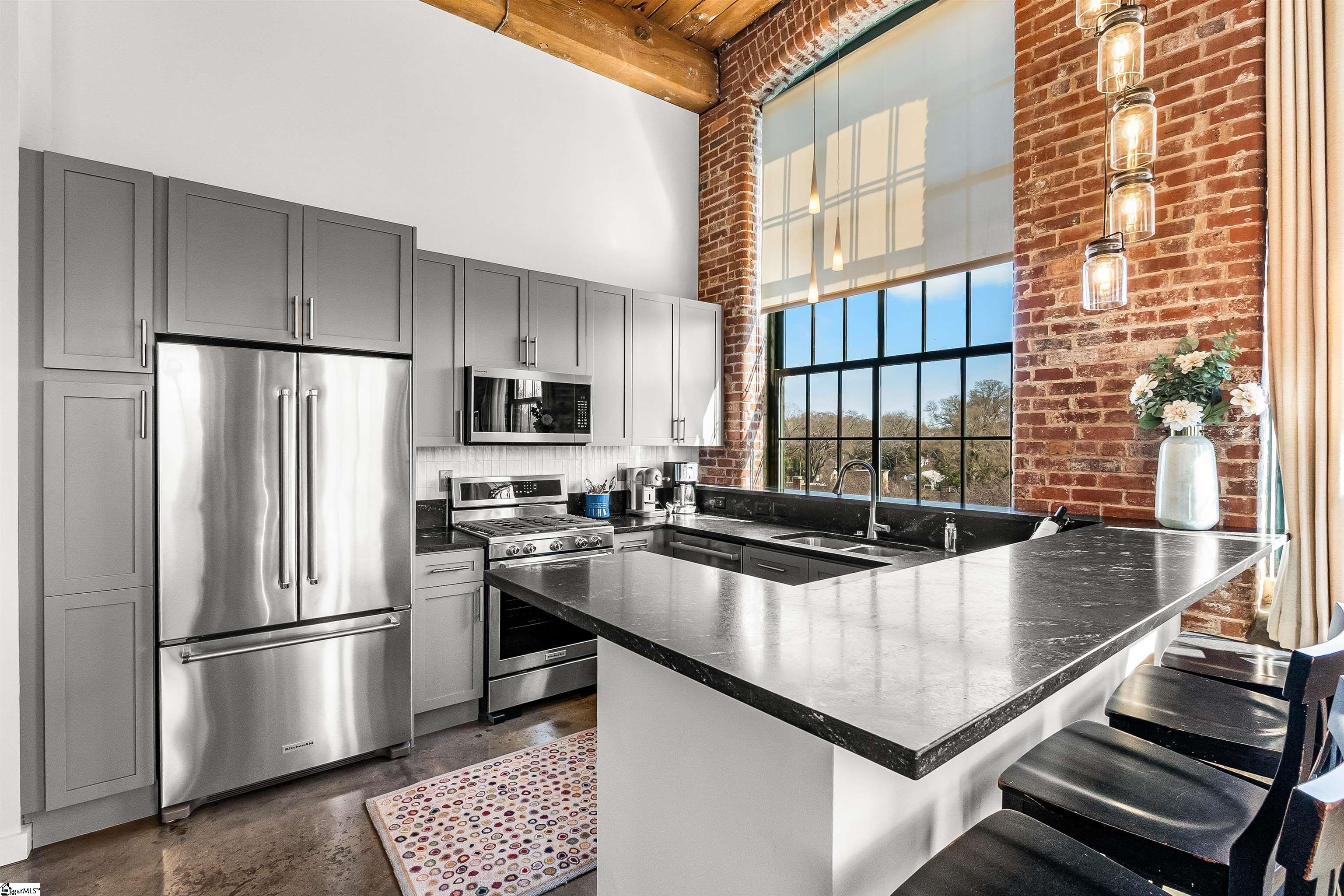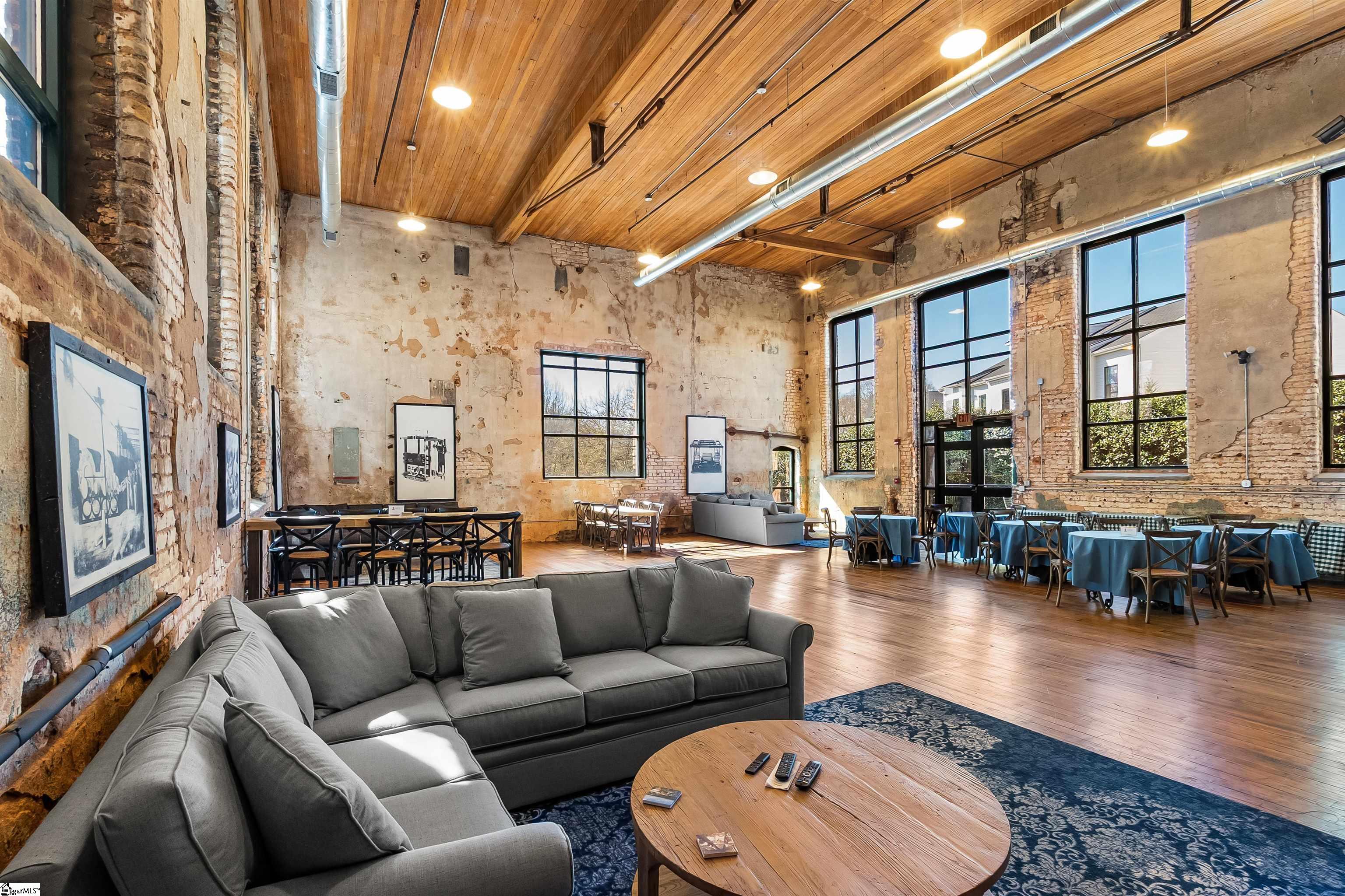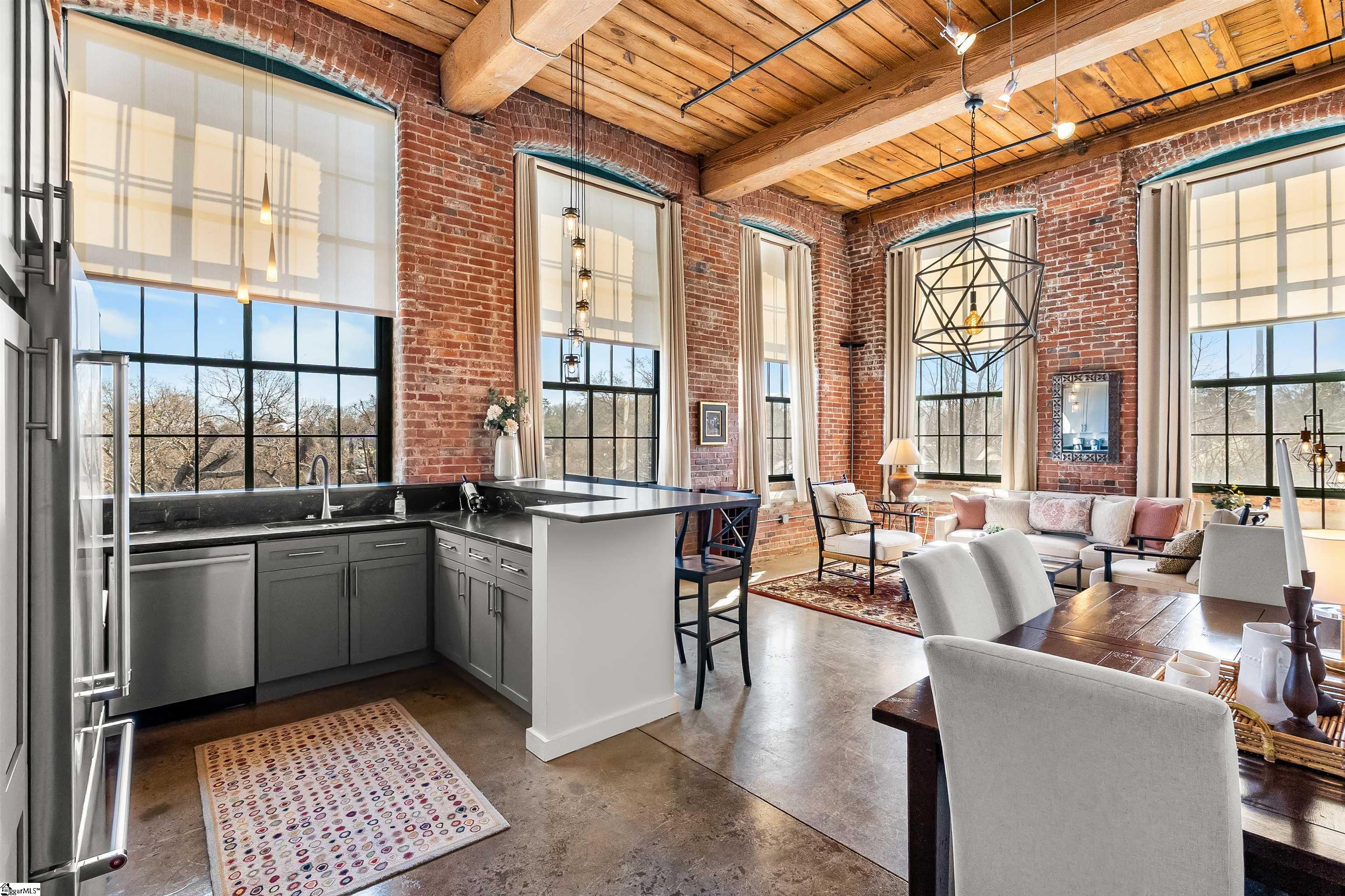 Don’t miss out on this beauty in The Lofts at Mills Mill – where you live in a beautiful Greenville historical landmark surrounded by light, beauty, trees, and fresh air. This eye catching 1890s textile mill is the perfectly located home of some of Greenville’s finest luxury residences. Just minutes from Main Street, Augusta Road, and the Prisma campus, the Mill is the perfect location for intown living and convenience. Loft 315 is a very desirable address! The best of the Mills lofts have massive walls of exposed brick, towering 16-foot ceilings, original wood beams, shiny concrete floors, and most importantly the coveted spectacular industrial windows. While many units have only 2 windows, Unit 315 is a rarity with 9 of these incredible portals of light, fresh air, and undeniable beauty, making it one of the most sought after locations. Being on the third floor places you high above the trees, but yet still accessible by stairs. Unit 315 being a corner unit allows for brilliant sunlight to come in from the east and west, filling the entire unit with light at sunrise and sunset. The space is truly spectacular and must be seen to be believed. You rarely have to even turn the lights on. However, when darkness is desired, the shades and the unique artistic light fixtures allow infinite variations on the atmosphere of the rooms and create a beautiful living environment. The open floor plan between the kitchen, dining area, and living room is the foundation for a uniquely stylish and cozy loft lifestyle. With two bedrooms on the same floor, both accompanied by a full bath, and windows, convenience and livability are maximized. Unit 315 has been recently renovated with significant improvements-new honed granite countertops, upgraded Kitchen Aid appliances with gas stove, new kitchen cabinets with soft closing hinges, new tile backsplash and updated shower fixtures. This unit is move-in ready! An important addition to ownership of unit 315 is the deeded secure storage space in the basement of the building which is not included in many of the units. This allows for convenient storage of bicycles, furniture, or other items. The Lofts include a beautiful common area with kitchen for entertaining, a gym and workout space, outdoor swimming pool and garden area.