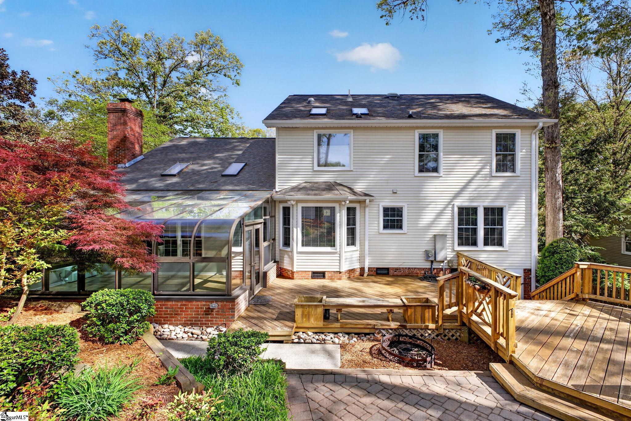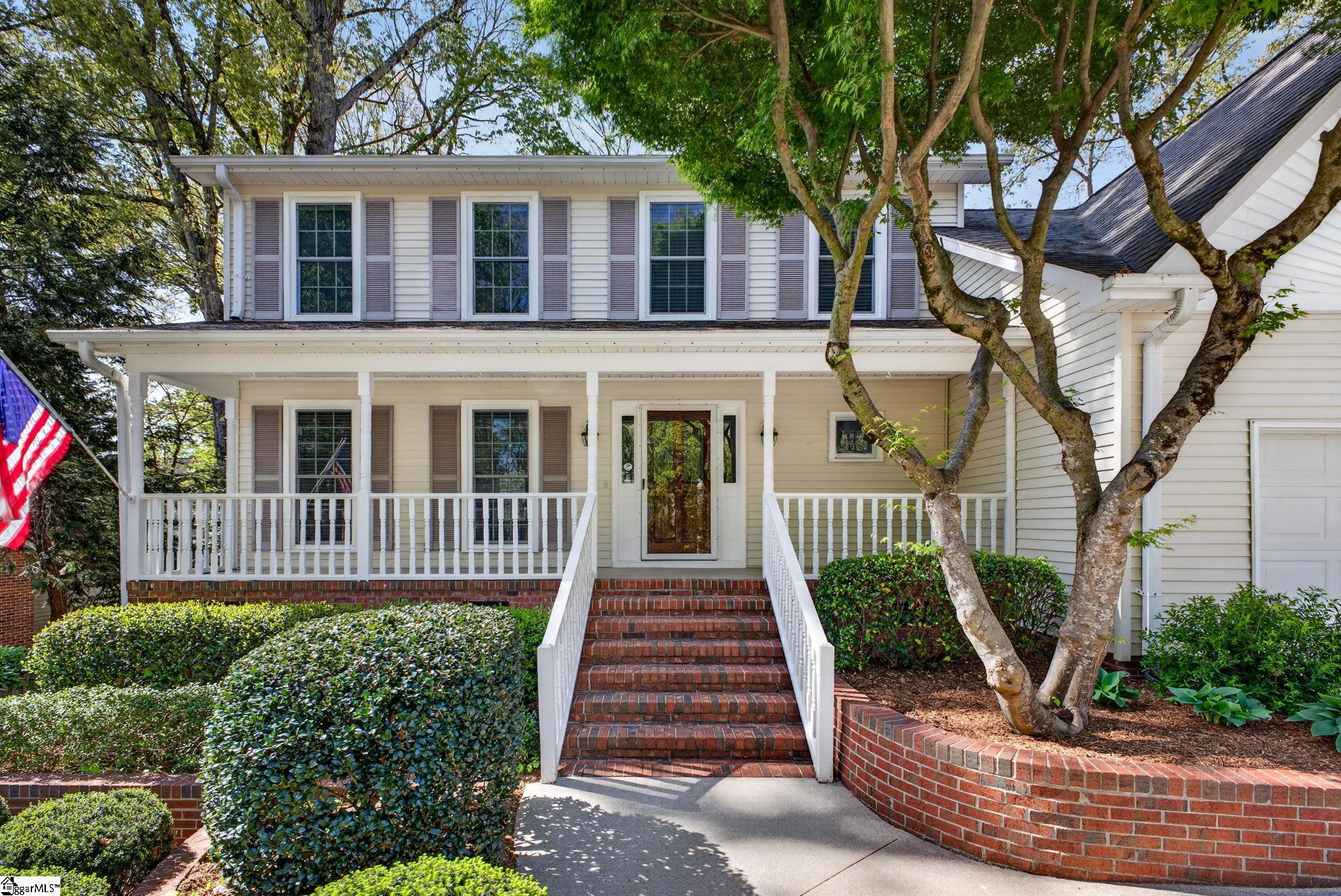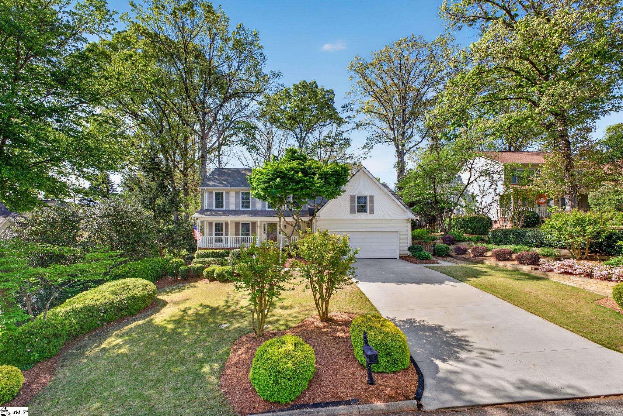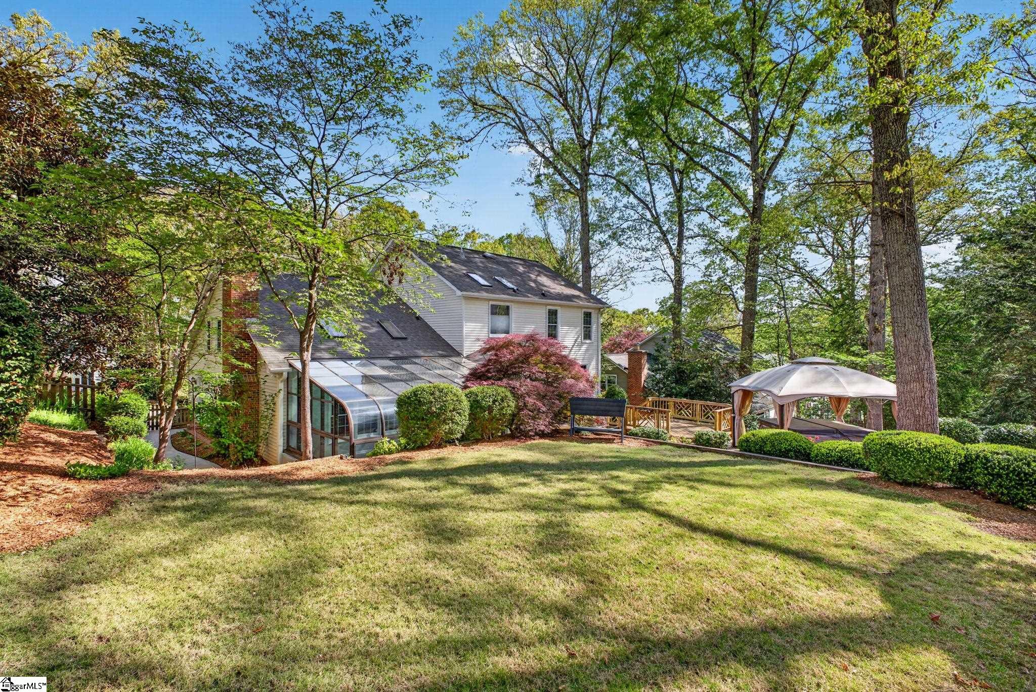 Welcome to your Pelham Falls retreat, offering five bedrooms and two and a half baths with a layout designed for both comfort and flexibility. This spacious home features a formal dining room, a cozy sunken living room, and a bright solarium just off the main living space, along with a dedicated den or office on the main level. The fifth bedroom includes built-in bookshelves and a desk, making it an ideal home office or a perfect space for a studious child. The kitchen is both functional and stylish, featuring custom cabinetry, granite countertops, and a gas range, while gorgeous hardwood floors extend throughout the entire main level, complemented by rich wood trim and beautiful moldings that add warmth and character. The living room is a true focal point with its floor-to-ceiling brick fireplace and skylights that fill the space with natural light, seamlessly flowing into the sunroom for year-round enjoyment. The primary suite offers a peaceful retreat with an updated full bath, walk-in shower, and custom closet shelving, while four additional bedrooms provide the flexibility needed for family, guests, or hobbies. Step outside to a backyard oasis designed for relaxation and entertaining, complete with terraced landscaping, planters, a dedicated hot tub deck, grilling deck, and a multi-level yard that offers endless possibilities, all beautifully overlooked by the sunroom. The home has been freshly painted in 2025 and is truly move-in ready, showcasing superb landscaping and meticulous care throughout. Additional features include a tankless water heater, an epoxy-coated garage floor and front walkway completed in 2024, a convenient garage yard door and leaf guards for easy maintenance. Exquisitely maintained with detailed records of updates, maintenance, and repairs, this home offers peace of mind along with timeless charm. Located in the highly sought-after Pelham Falls community and zoned for Riverside High School, Riverside Middle, and Woodland Elementary, residents enjoy access to exceptional neighborhood amenities including two pools, tennis courts, athletic fields, a playground, clubhouse, and scenic walking trails along the river, offering a lifestyle that is as active as it is relaxing. While the carpet upstairs is not in bad shape, the sellers understand that buyers sometimes prefer to personalize that element and are offering a $5000 carpet allowance. Make your appointment to see this one soon, as it is unlikely to last!