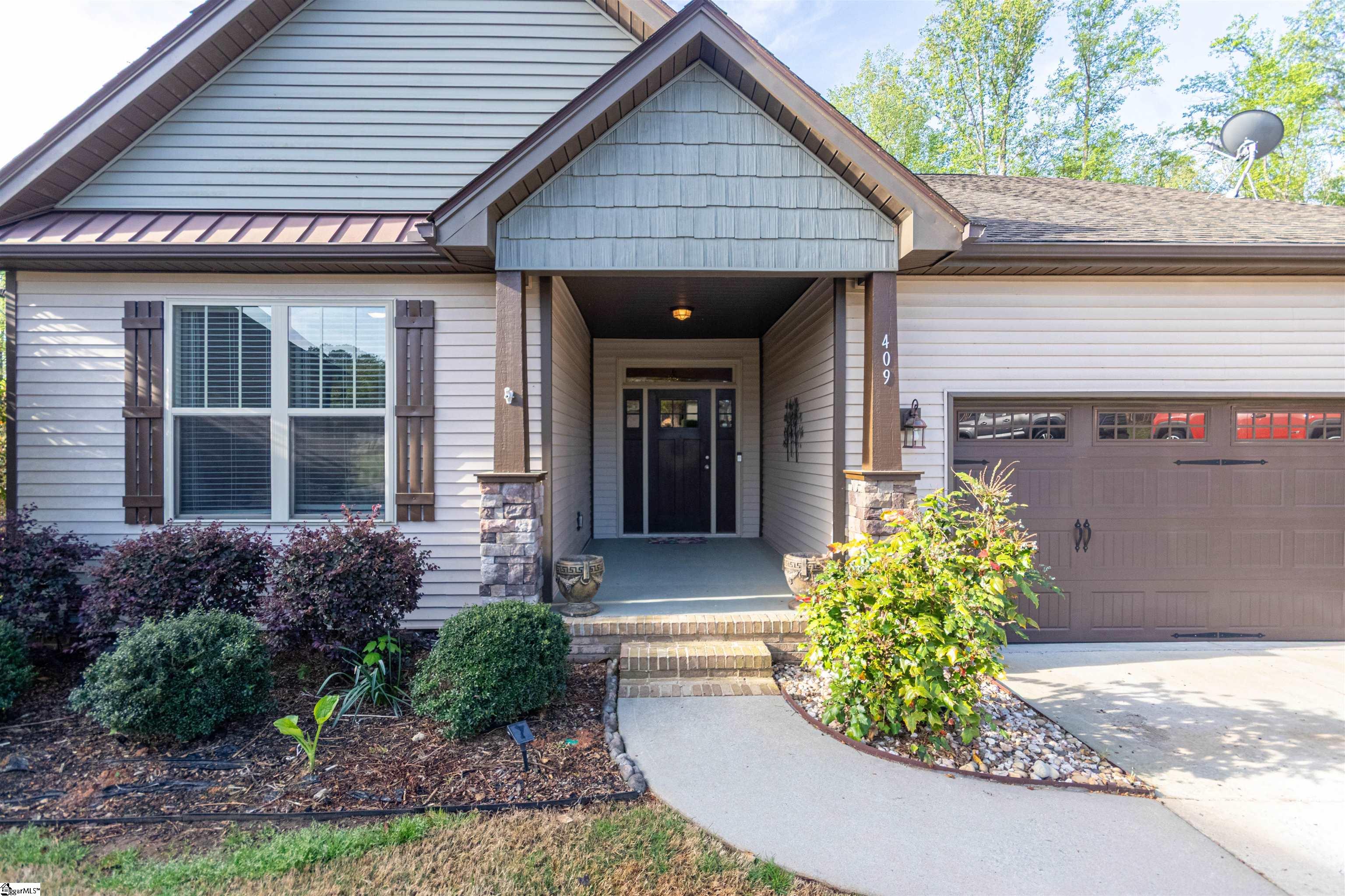 Welcome to 409 Trillium Creek Court! Tucked away on a quiet cul-de-sac on nearly half an acre, this beautifully maintained Craftsman-style home offers the perfect blend of comfort, style, and versatility. With four bedrooms and two full baths, the thoughtfully designed open floor plan features a vaulted great room filled with natural light and centered around a cozy gas-log fireplace. The updated kitchen truly stands out, showcasing quartz countertops, a classic subway tile backsplash, stainless steel appliances, a pantry closet, and a spacious island perfect for cooking, gathering, or casual dining. Just beyond, the dining area overlooks the serene backyard and opens to a covered porch, an ideal spot to relax or entertain while enjoying the peaceful sounds of the nearby creek. Surrounded by mature landscaping, the private backyard provides a tranquil setting for outdoor living year-round. On the main level, you’ll find two generously sized secondary bedrooms, both with walk-in closets, along with a well-appointed hall bath. A large walk-in laundry room and ample storage add everyday convenience. Privately situated at the rear of the home, the primary suite offers a true retreat with dual sinks, abundant cabinetry, a spacious walk-in shower, private water closet, and room for a vanity or additional furnishings. Upstairs, the fourth bedroom provides flexible space for a home office, guest suite, playroom, or additional living area. Additional features include luxury vinyl plank flooring throughout the main living areas, a Generac whole-home generator, gutter guards, and numerous thoughtful updates throughout. Conveniently located less than 10 minutes from downtown Travelers Rest, Trailblazer Park, the Swamp Rabbit Trail, and Paris Mountain State Park—and under 20 minutes to Lake Robinson and downtown Greenville—this home offers easy access to some of the Upstate’s best dining, shopping, and outdoor recreation.