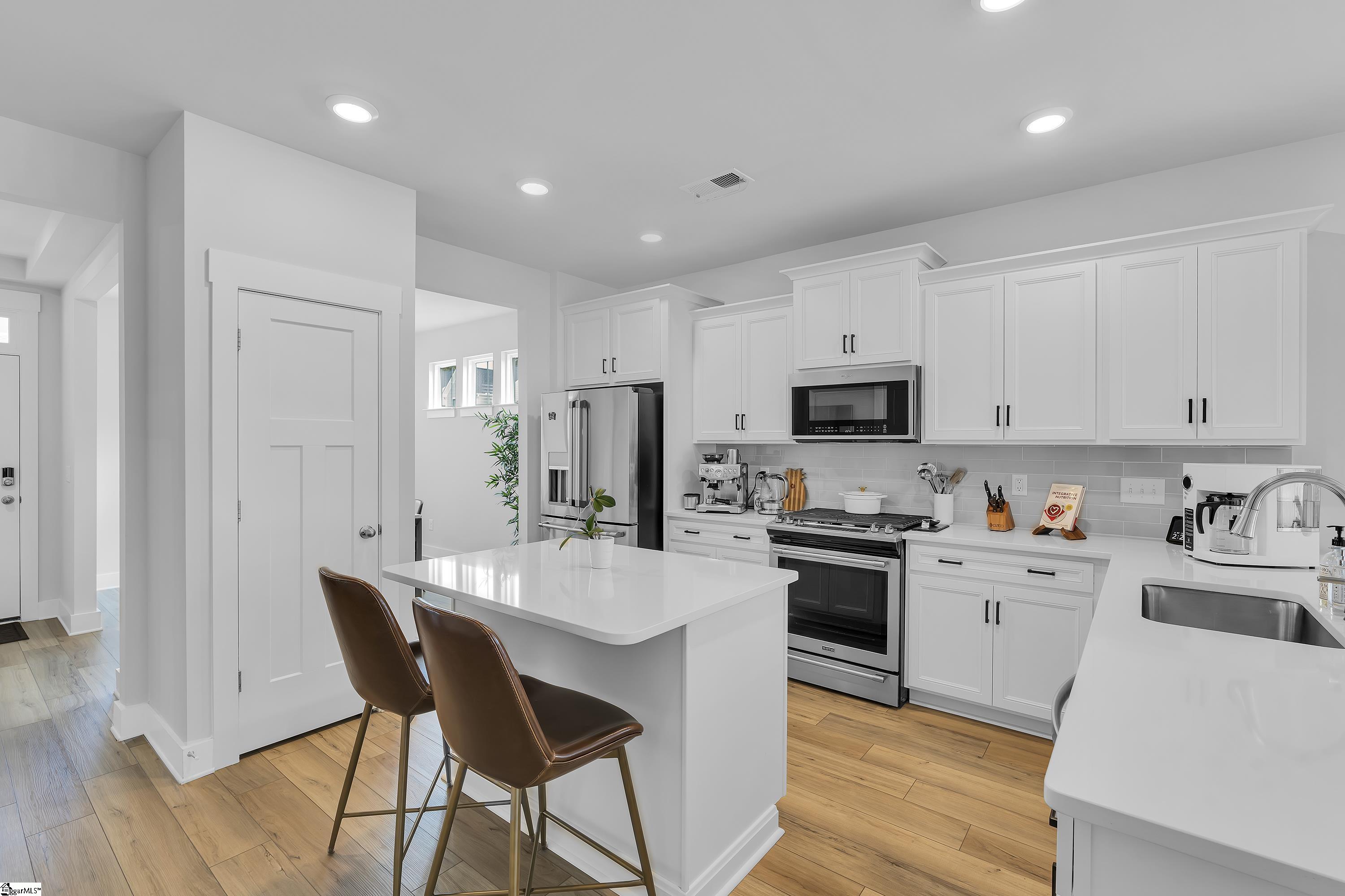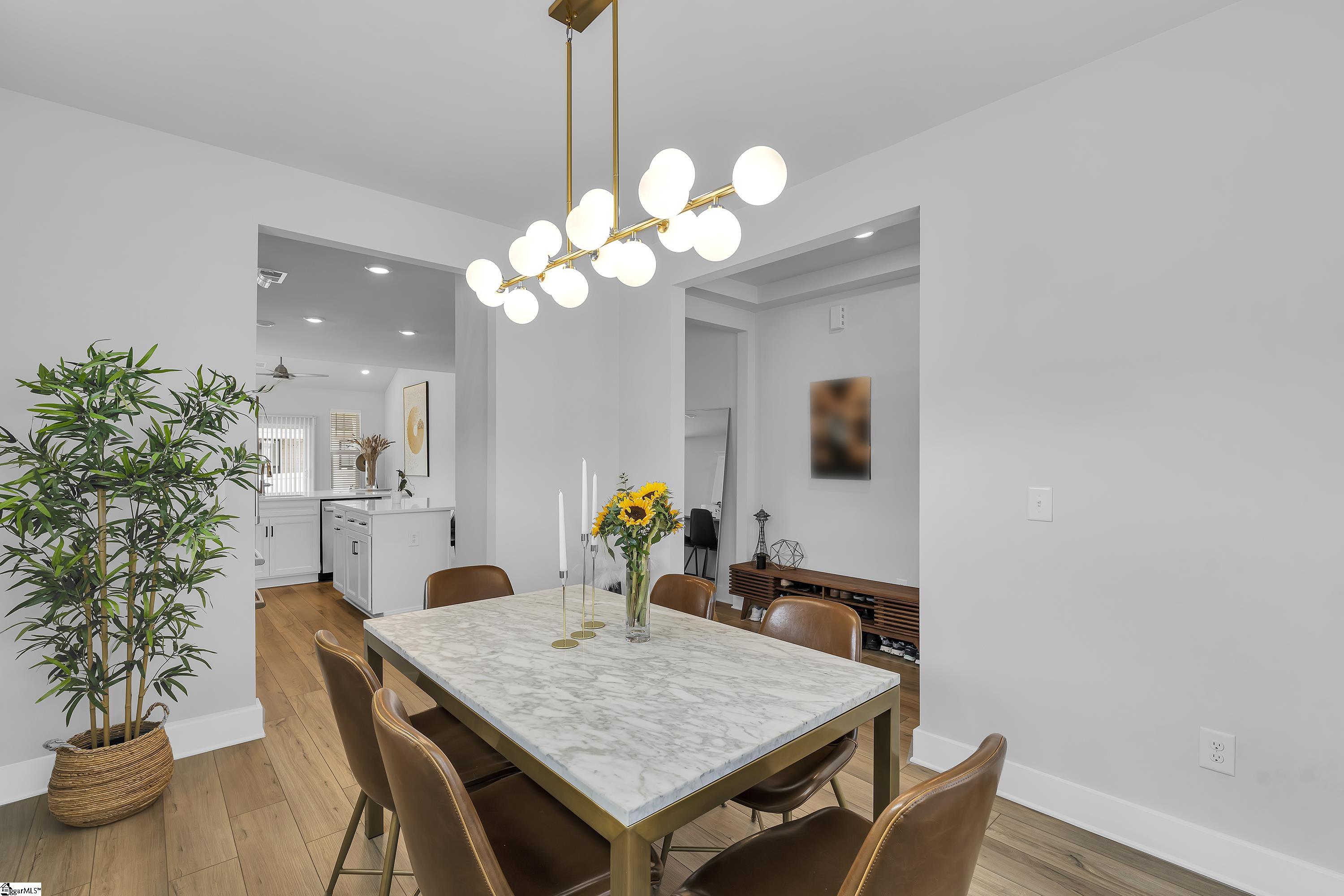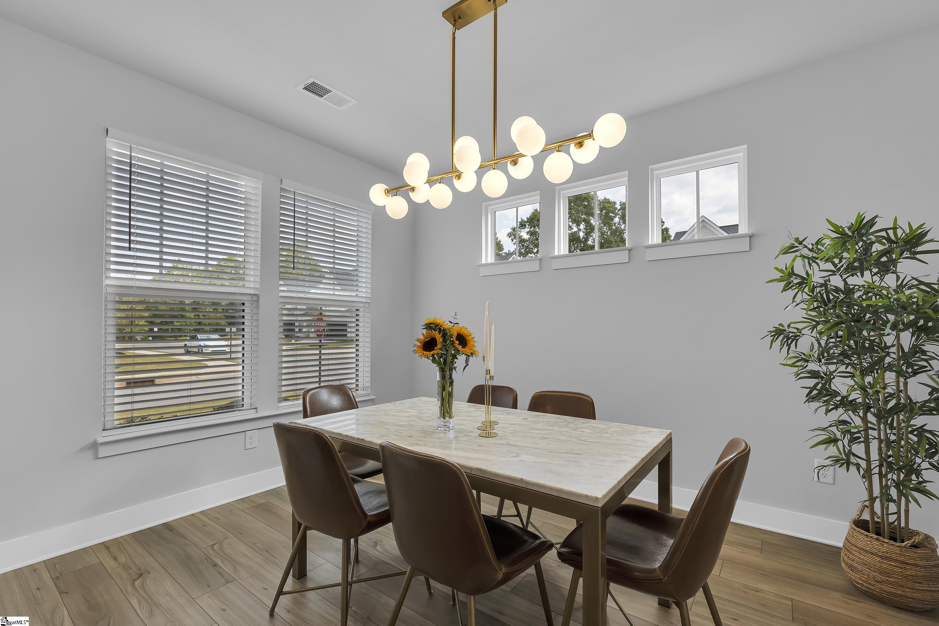 Welcome to this stunning 3-bedroom, 2-bathroom Townhome, located just minutes from BridgeWay Station, Woodruff Road, Five Forks, and with easy access to I-385. Enjoy the perfect blend of style, comfort, and convenience in one of the area’s most sought-after locations. From the moment you arrive , you’ll be impressed by the charming curb appeal, featuring Hardy Board siding, stone accents, and a welcoming front entry. Step inside to discover vaulted ceilings, luxury vinyl plank flooring, and a bright open-concept layout that creates a warm and modern atmosphere. The kitchen is a true showstopper, boasting elegant quartz countertops, white cabinetry, stainless steel appliances, a stylish backsplash, and a center island-perfect for entertaining or casual meals. The spacious Living Room flows seamlessly from the kitchen and offers plenty of room to relax or gather with family and friends. A separate formal dining room provides the ideal space for hosting dinner parties or holiday meals. The main-level master suite is a true retreat, featuring a double vanity, beautifully tiled shower, and a custom-designed walk-in closet with built-in cabinetry for optimal organization. Upstairs, you’ll find two generously sized bedrooms-each with walk-in closets- offering plenty of space for family, guests, or a home office. Enjoy outdoor living on the covered back patio overlooking a fully fenced backyard-ideal for pets, kids, or simply relaxing in privacy. Don’t miss the opportunity to make this low-maintenance, high-style home yours. Schedule your showing today!