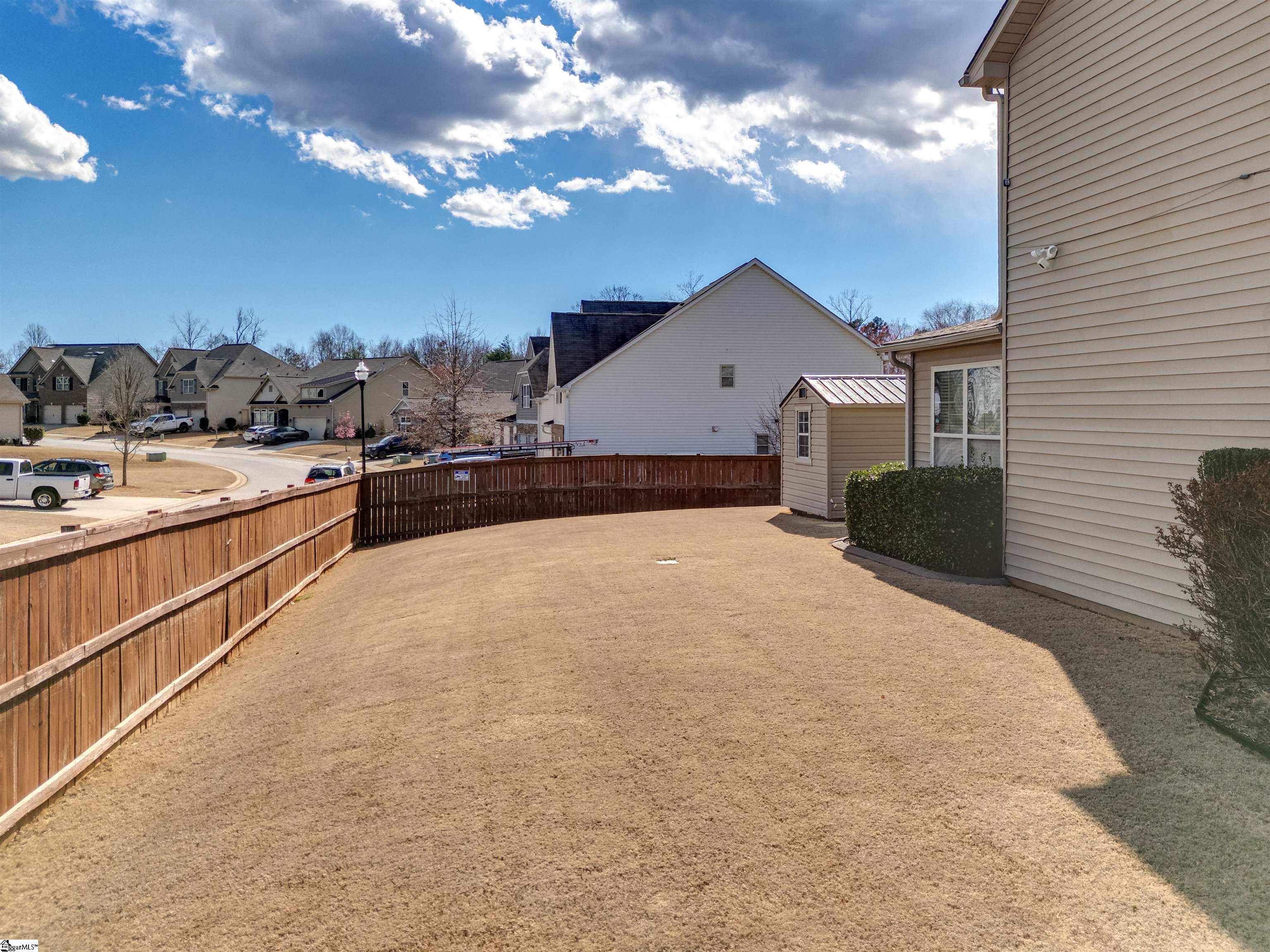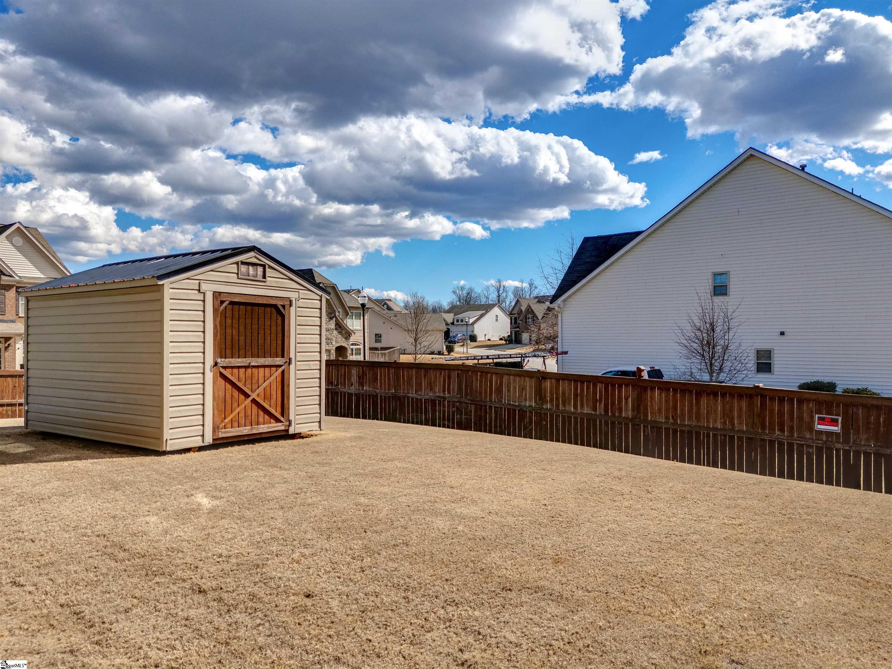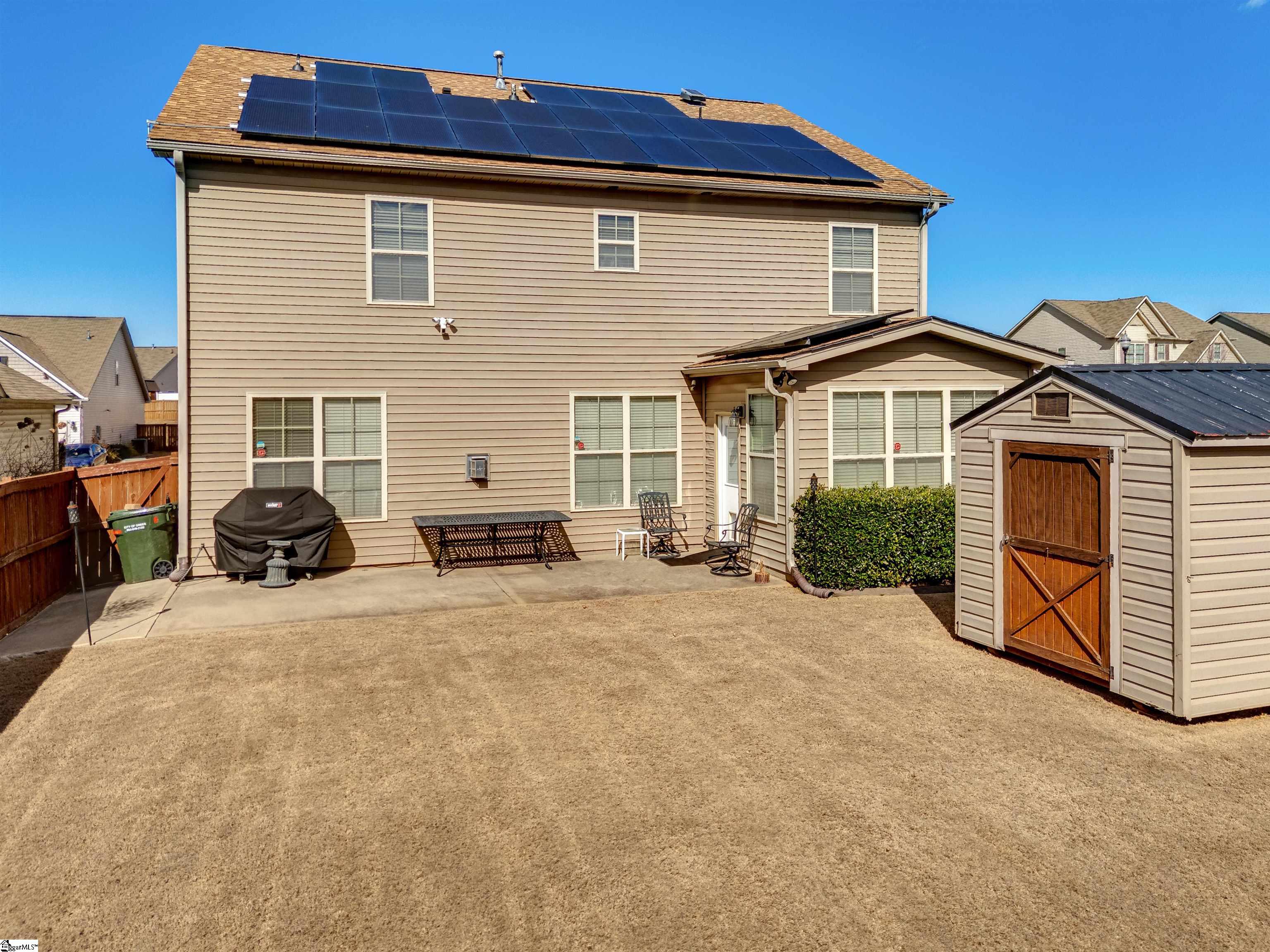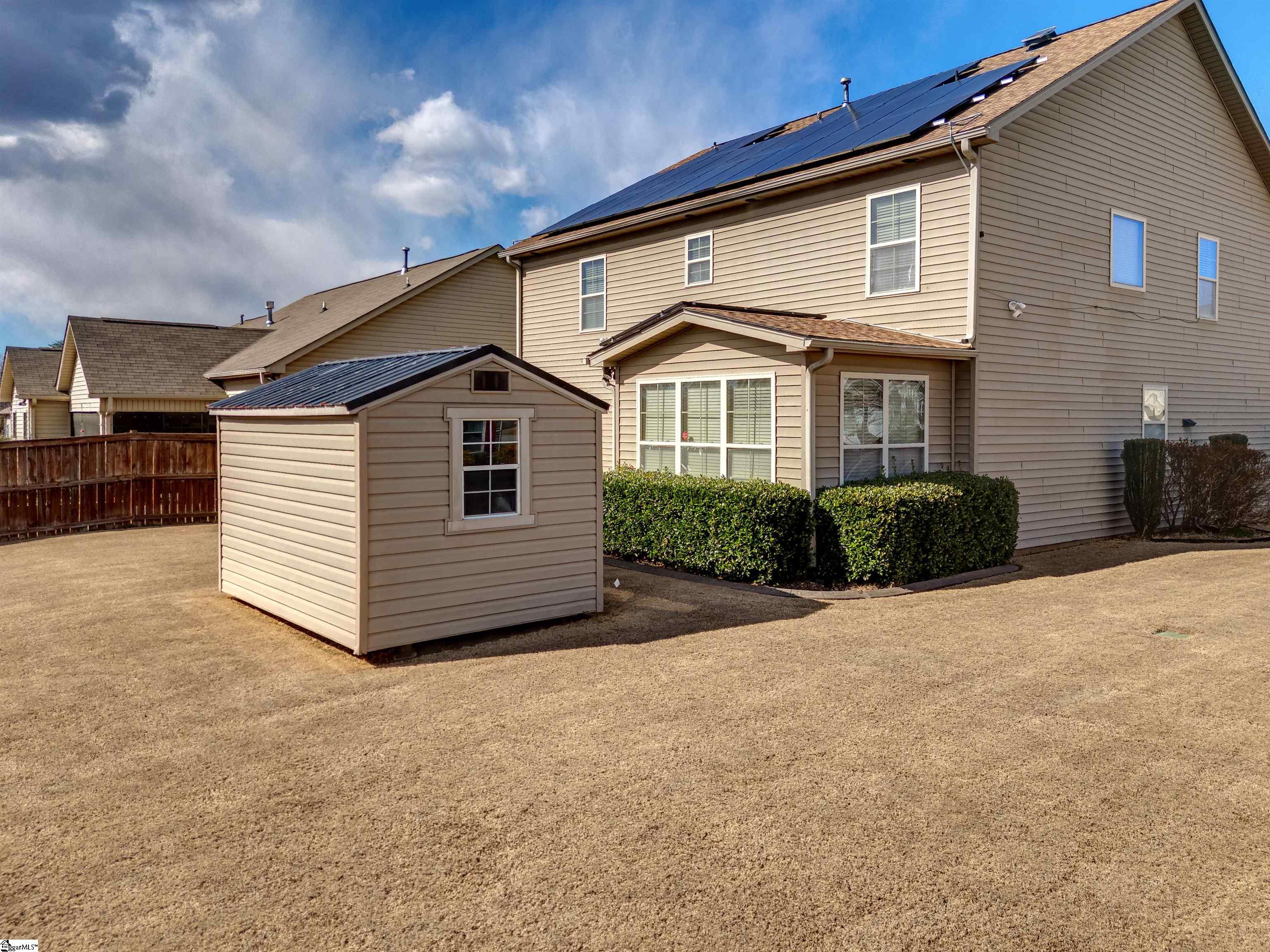 Welcome to 450 Bucklebury Road a beautiful five bedroom, four bathroom home in a prime location. The moment you enter from the front porch you’ll be greeted by a foyer that seamlessly integrates the living, dining, and kitchen areas. The kitchen is equipped with granite countertops, tile backsplash, stainless steel appliances (including a gas range), a pantry, and large center island. The breakfast area leads to a sunroom where you can access the backyard. There you will find an oversized concrete patio with a gas hook-up for your grill, storage building that conveys, and fenced in backyard. Back inside, The great room is open to the kitchen and includes a cozy corner fireplace with gas logs. Finishing out the main floor is a bedroom (Murphy bed will convey) and full bath that provides convenience for potential guest. On the second level you will find one bedroom that was used as a walk-in closet for the current owner and a full hall bath. Two additional spacious bedrooms provide comfort and share access to a full bathroom. The primary suite features a large bedroom area, en-suite bathroom with a tile shower, jetted tub, dual vanities, and walk-in closet. The walk-in laundry room is also located on the 2nd floor with close proximity to all bedrooms. The roof was replaced in 2025 and solar panels are owned, to help lower the cost of energy bills. This home is situated on an upgraded corner lot in Franklin Pointe, a highly desirable community where you’ll enjoy access to the neighborhood pool, clubhouse, and playground. Conveniently located near BMW, GSP Airport, I-85, and just minutes from downtown Greer and Greenville. Don’t miss out on all this lovely home has to offer!
