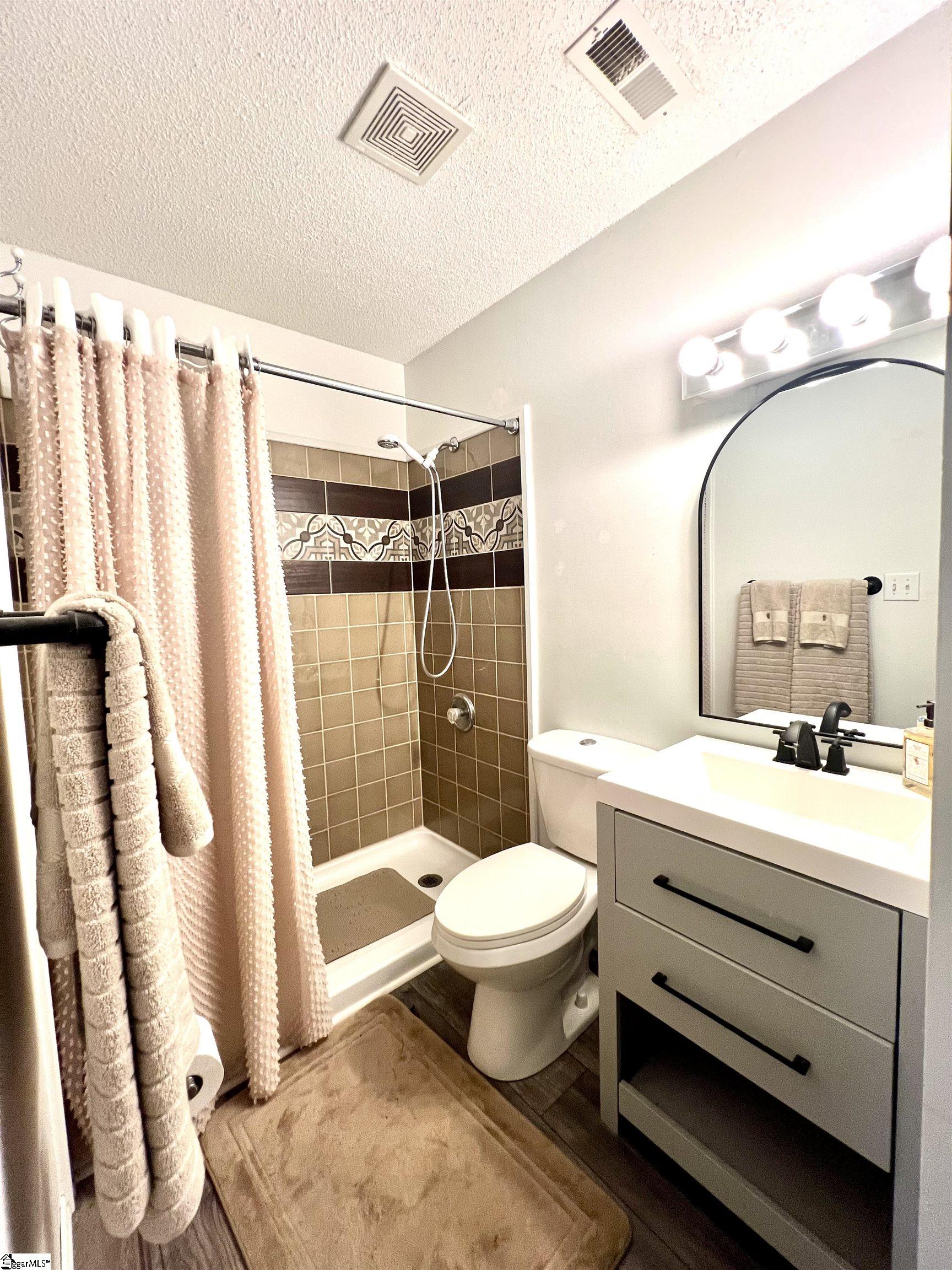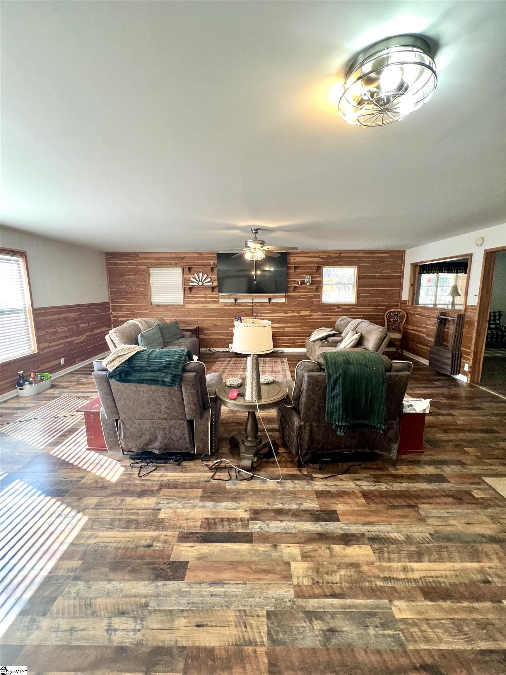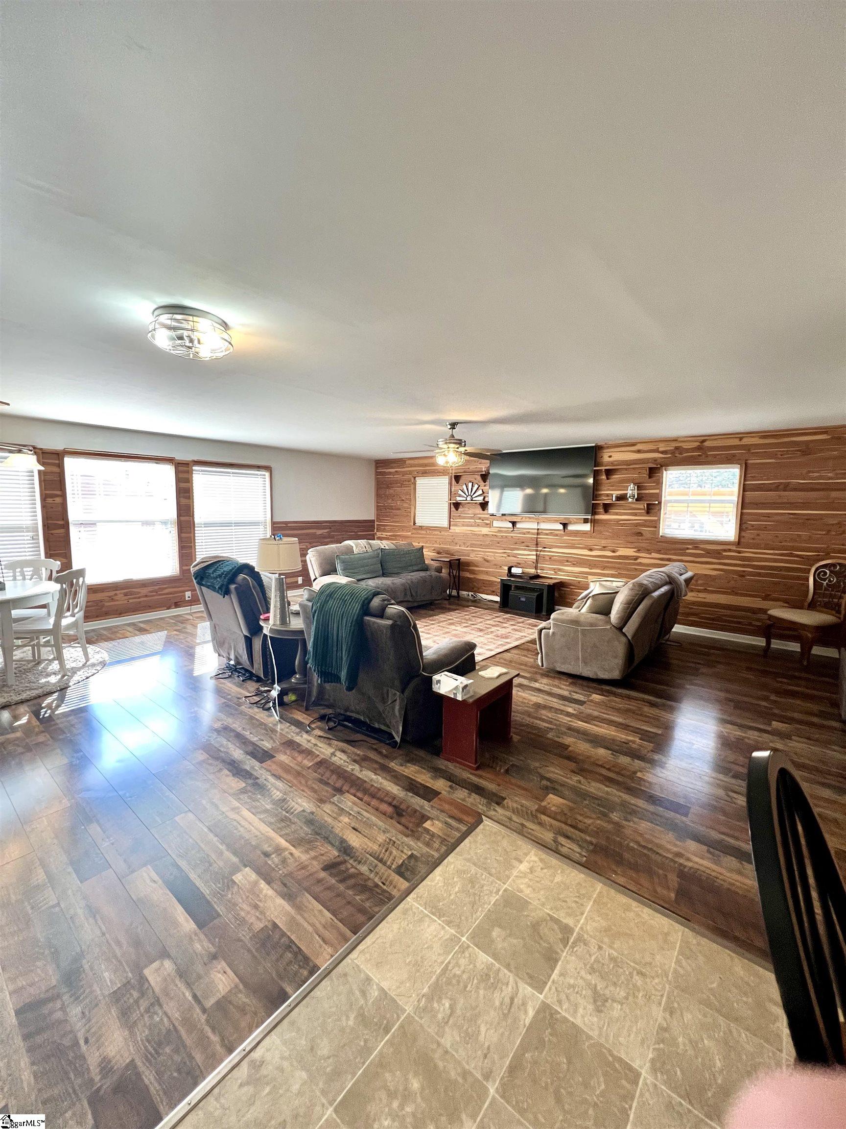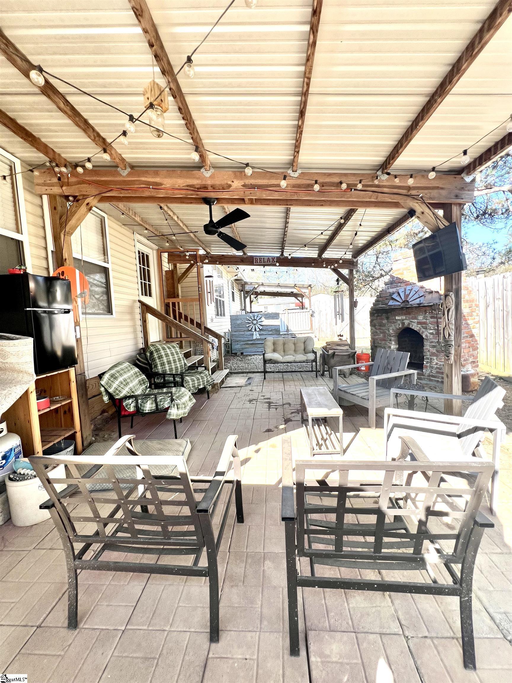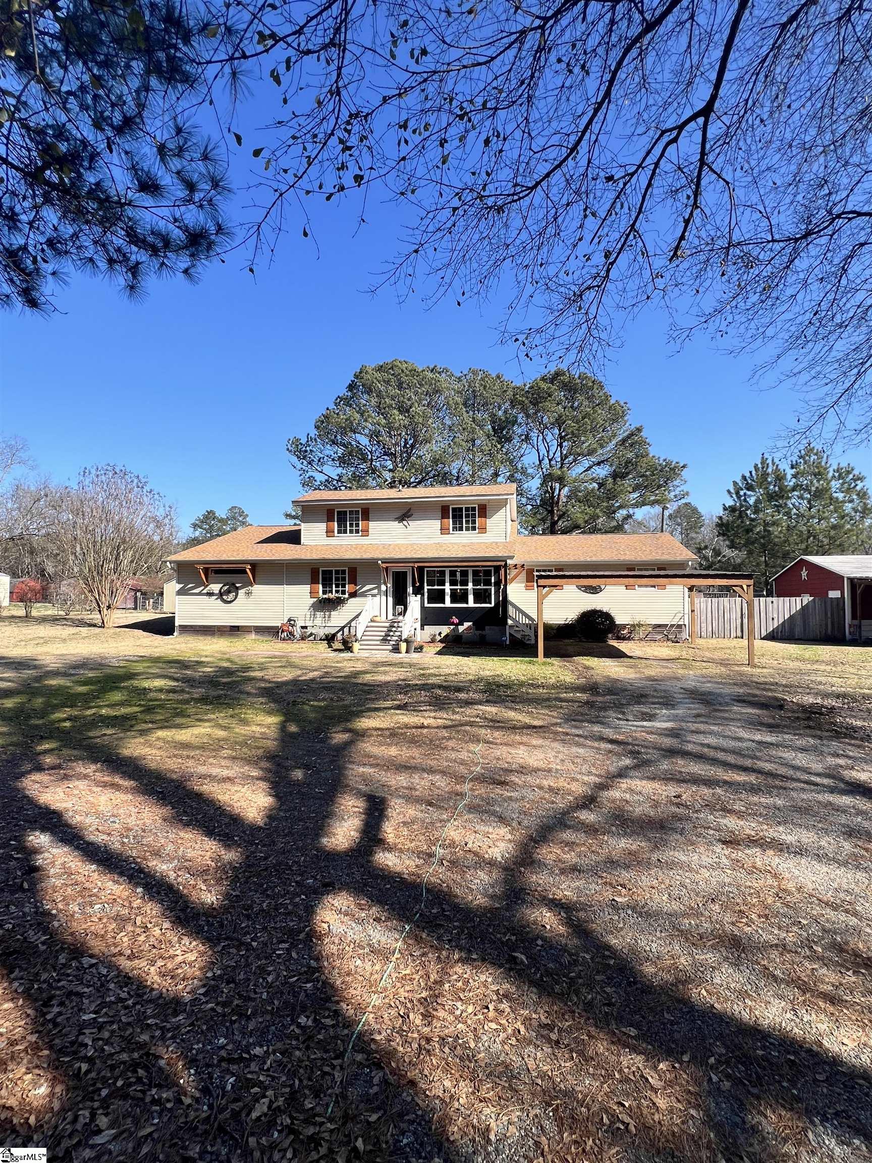 This 4-bedroom, 3-full-bath home is located on approximately 1 acre in a quiet country setting. The main level includes an entry living area that opens into a 24×24 family room. Recent updates on the main floor include new vinyl flooring throughout, upgraded window blinds, fresh interior paint, and rough-cut cedar accents that provide a consistent design style across several rooms. The kitchen features updated vinyl flooring, refrigerator, dishwasher, stove, microwave, and added custom cabinetry in the dining area. A 2014 addition created a dedicated laundry room with ceramic flooring, custom cabinet storage, and a washer and dryer purchased in 2018. The original laundry area has been reconfigured into a hallway with pantry space, hot water heater access, room for a freezer, and built-in shelving for storage. The home includes two Master Bedroom suites. The 2014 suite features pine tongue-and-groove walls, separate closet space, custom shutters, and upgraded carpet. Its bathroom includes an oversized tub, custom built-in shower, ceramic flooring, upgraded toilets, a custom linen closet, and dual sinks. The original primary suite includes new vinyl flooring, upgraded blinds, a picture rail, the original closet, and an additional closet with under-stair storage. Its bathroom has been updated with a ceramic step-in shower, new toilet, new vanity, and fresh paint. The second level includes two additional bedrooms with large closets and storage areas. One bedroom has new vinyl flooring, new paint, and upgraded blinds. The second bedroom includes built-in bookshelves, upgraded blinds, and original carpet. The upstairs bathroom features a BathFitter-installed shower with handrails and seating, updated flooring, toilet, sink (installed in 2025), and a separate linen/storage closet. Exterior features include a covered back patio with a custom fireplace, a 15-foot-diameter pool with custom deck and patio area, and privacy fencing around the pool. A 24×36 steel building with concrete flooring, dual entry doors, and covered lean-to extensions is located beyond the pool area. A separate covered porch with kitchen access includes railing and steps leading to the side yard and two storage buildings. The property also includes eight mature blueberry bushes. The front porch has been enclosed and remodeled with a custom window and new steps. The front and side entries lead to a recently built matching two-car wood carport, shutters, and pergolas. A bonus shed provides additional storage for yard or garden equipment. The entire yard is fully fenced and includes remote gate access. Recent major updates include a new roof installed in 2023 and a new HVAC unit installed in 2025.