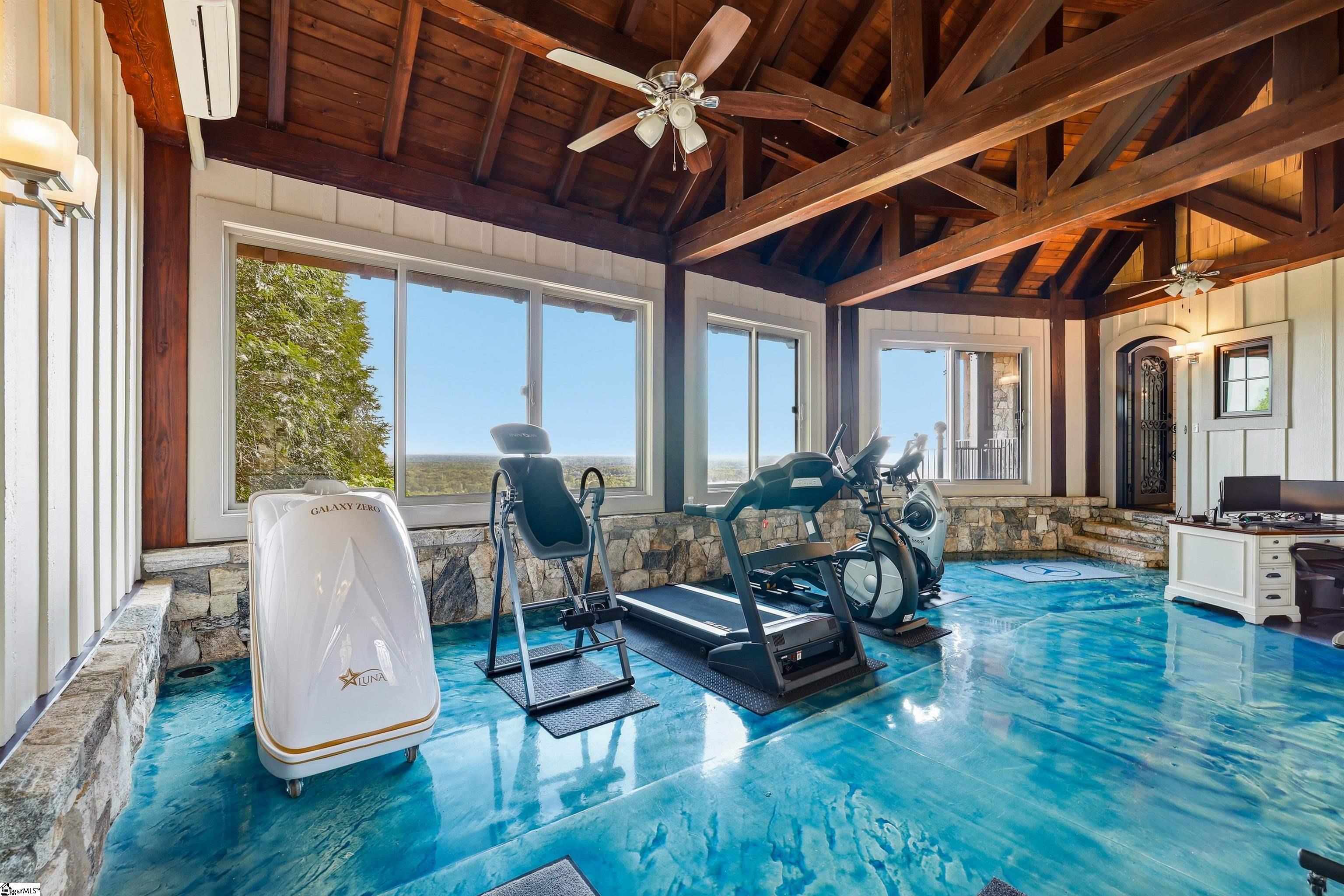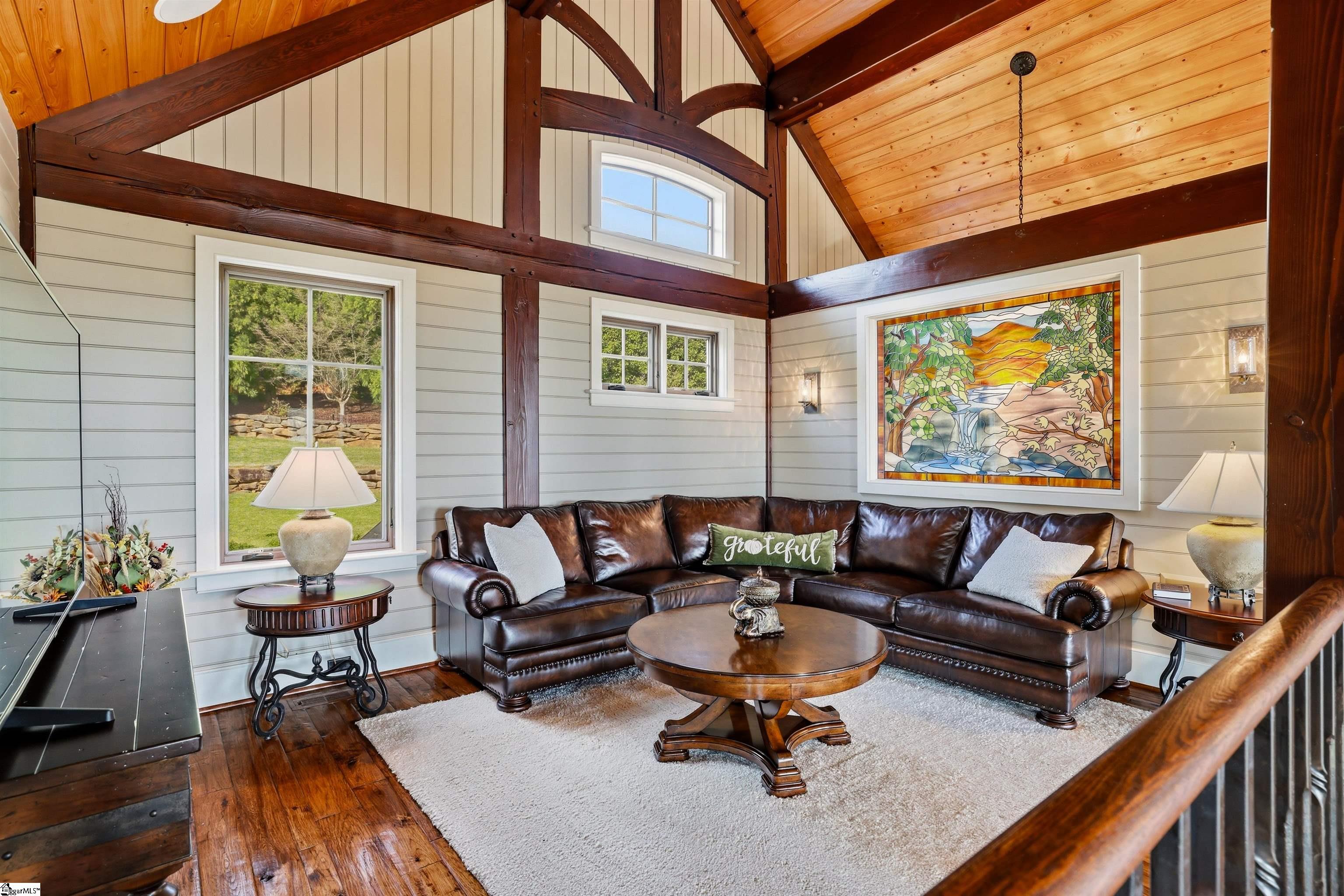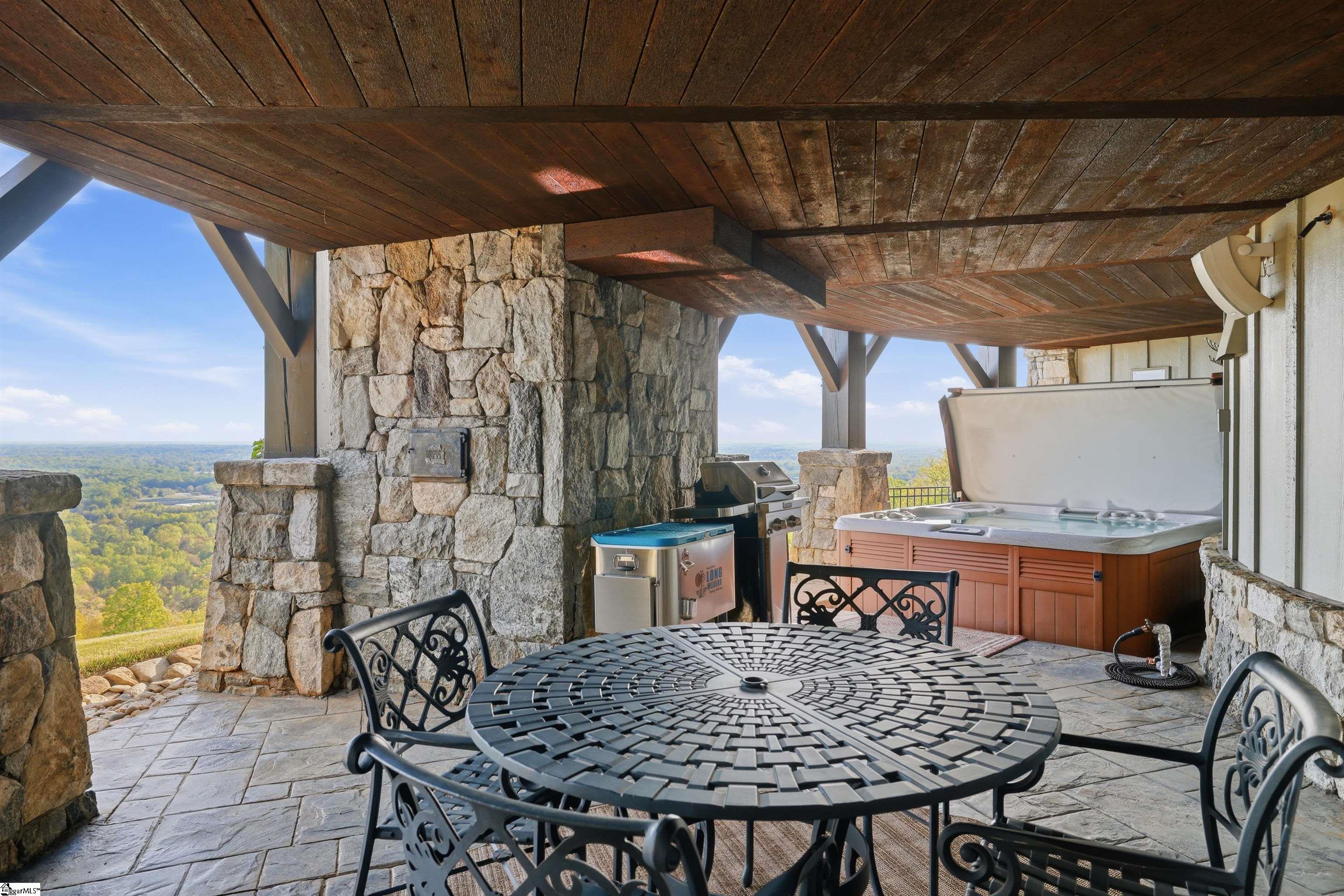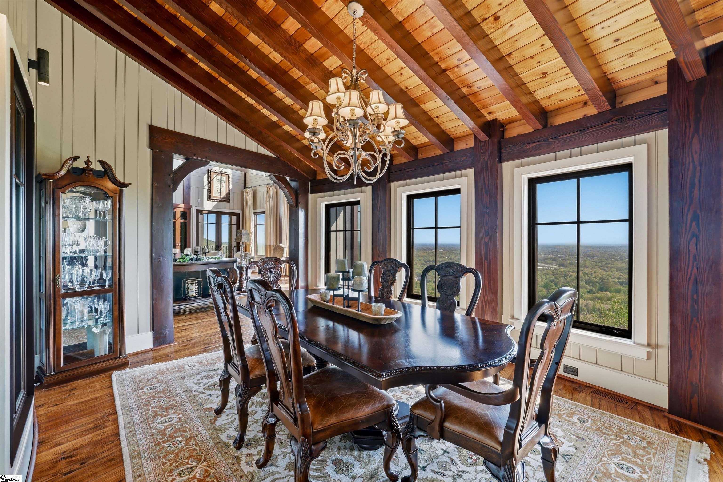 Perched atop Paris Mountain, 5 Tropicana Court is a one-of-a-kind luxury residence offering breathtaking panoramic views, exceptional craftsmanship, and a seamless blend of natural beauty and refined design. Enjoy stunning 180-degree vistas of downtown Greenville, Furman University’s Mirror Lake, and the Blue Ridge Mountains from nearly every angle of this remarkable property. Spanning over 6,000 square feet, this architectural masterpiece showcases exposed Douglas fir beams, Amish hand-scraped hickory hardwood floors, tongue-and-groove poplar walls, and custom 8-foot walnut interior doors—creating a warm, elevated aesthetic throughout with no drywall in the home. The gourmet kitchen is thoughtfully designed for both everyday living and entertaining. Featuring a fully up-fitted kitchen with custom solid wood cabinetry throughout. The main living areas offer incredible flexibility, from a dramatic great room with soaring ceilings, expansive windows, and a two-story fireplace to a private media room ideal for relaxing evenings. Multiple outdoor living spaces—including three expansive porches and a stone terrace—provide year-round enjoyment and unparalleled vantage points to take in the surrounding landscape. A fire pit area creates the perfect setting for entertaining under the stars. The home features three luxurious primary suites, each with spa-inspired bathrooms with heated floors and custom walk-in closets. An additional apartment over the garage, complete with a kitchenette and Murphy bed, offers ideal accommodations for guests or extended living. Modern conveniences include Vantage Controls automated lighting, a whole-home Juke 18-zone sound system, and a 16KW Generac propane generator for added peace of mind. Ideally located off Altamont Road in the exclusive gated City Lights subdivision, this property offers convenient access to the Swamp Rabbit Trail and is just minutes from the dining, shopping, and cultural attractions of downtown Greenville and Travelers Rest. Upgrades include a fitness studio, art studio, enclosed deck off the primary suite, custom rock wall patio with fire pit and backyard fencing. Further upgrades include approximately 2,700 sq ft of enclosed storage, a Sundance hot tub spa, fireplace enhancements, a GAF slate roof and regular maintenance that enhances the original grandeur of 5 Tropicana Court. This presents a rare opportunity to own a truly exceptional mountain retreat combining luxury, privacy, and proximity to everything Greenville has to offer. Schedule your private showing today.