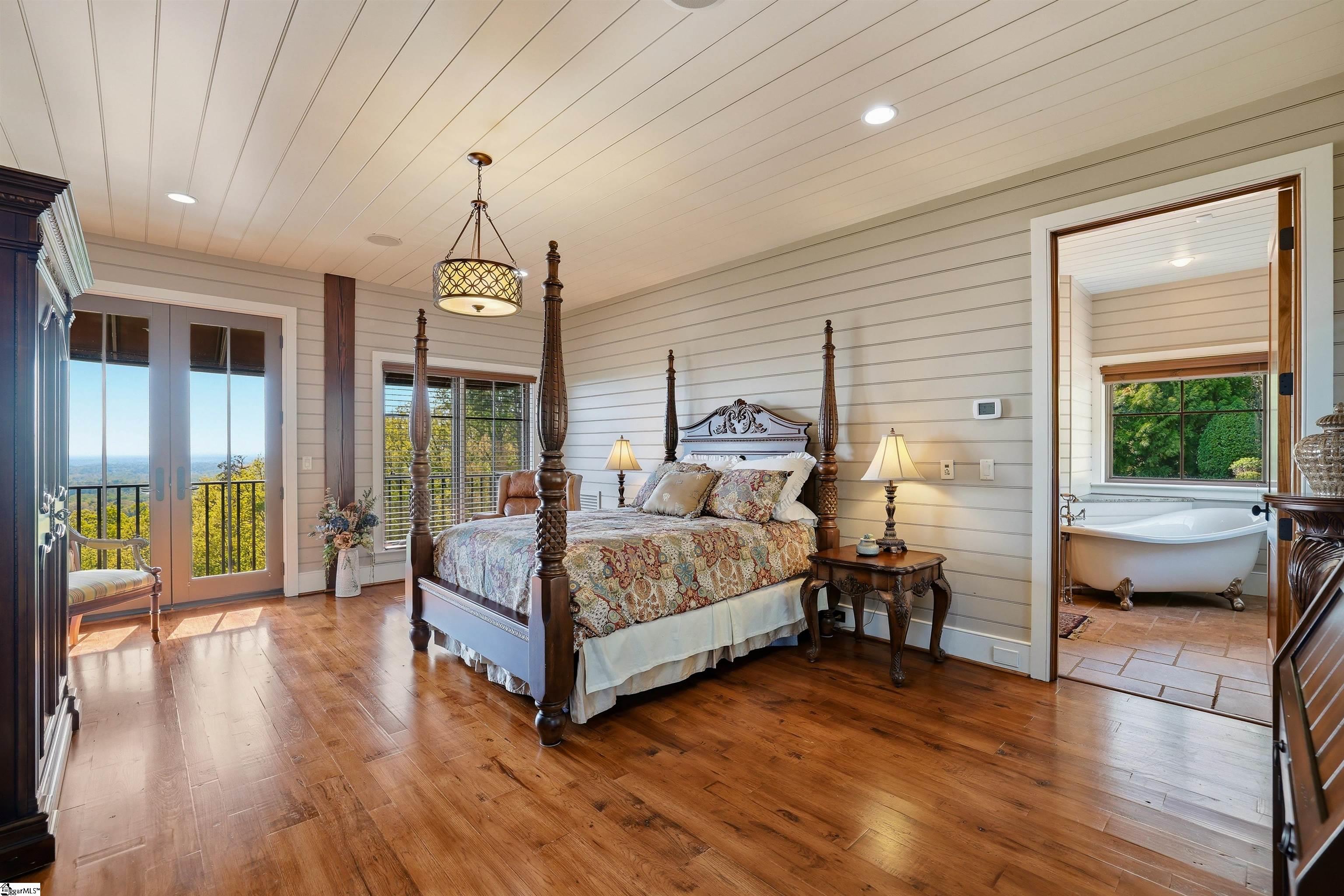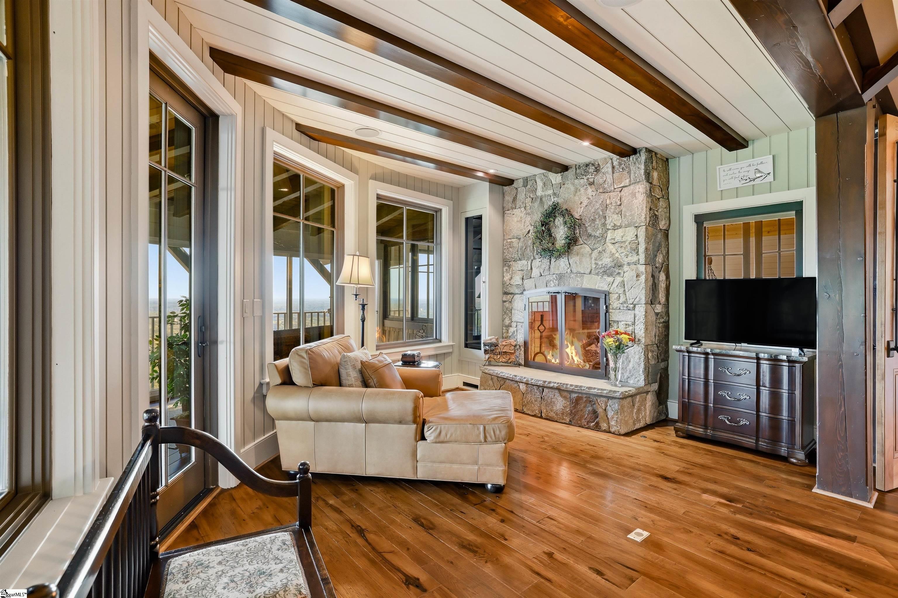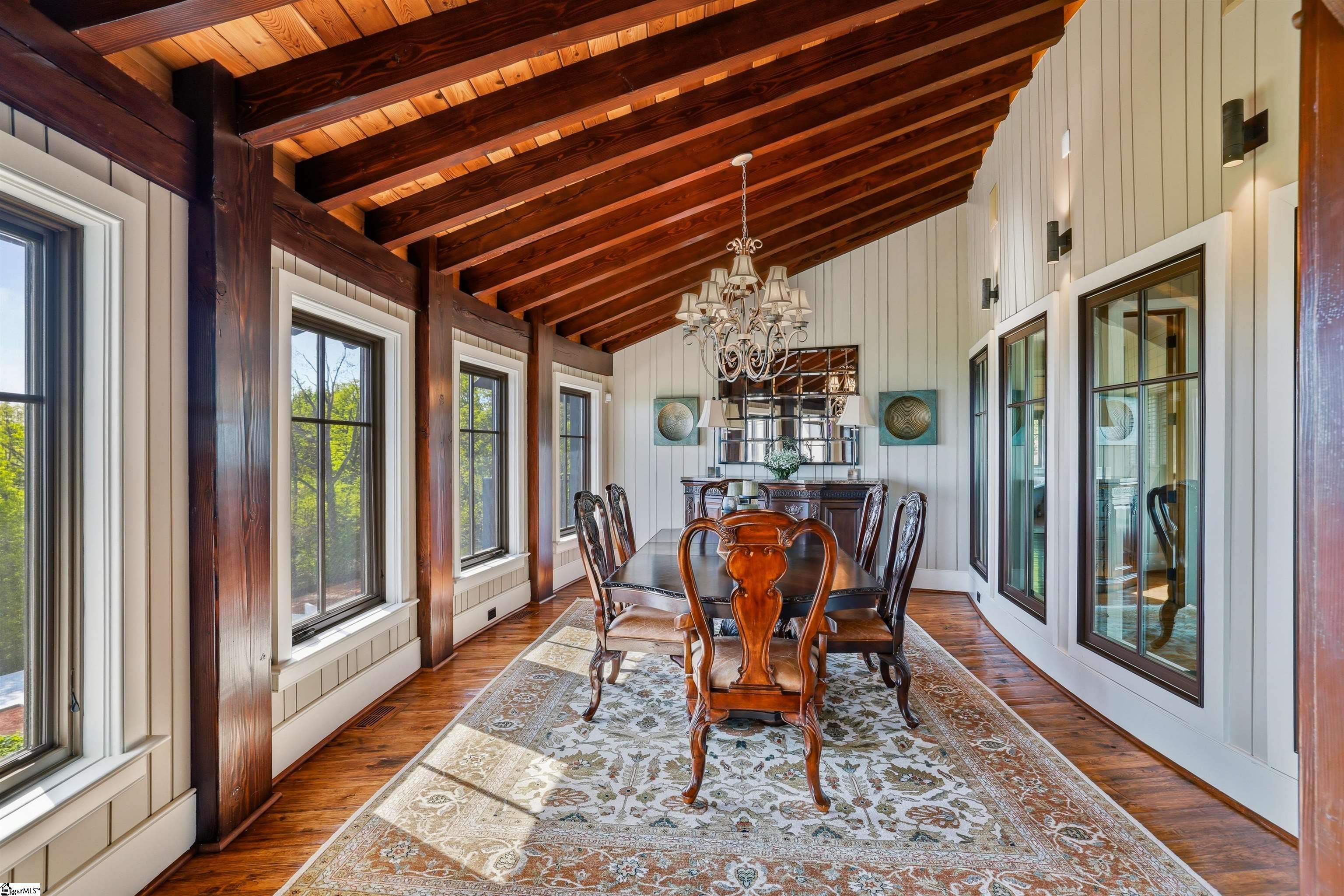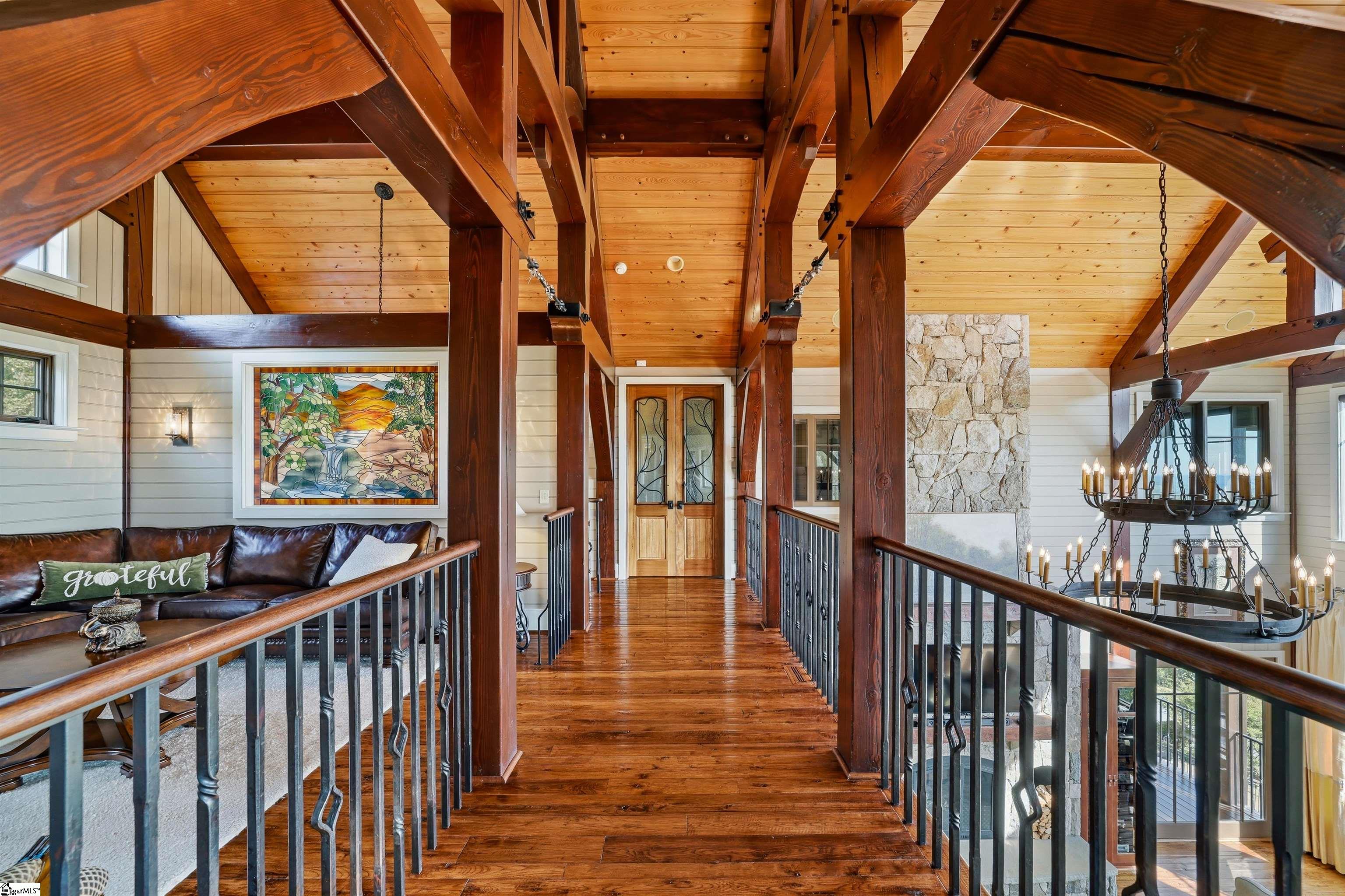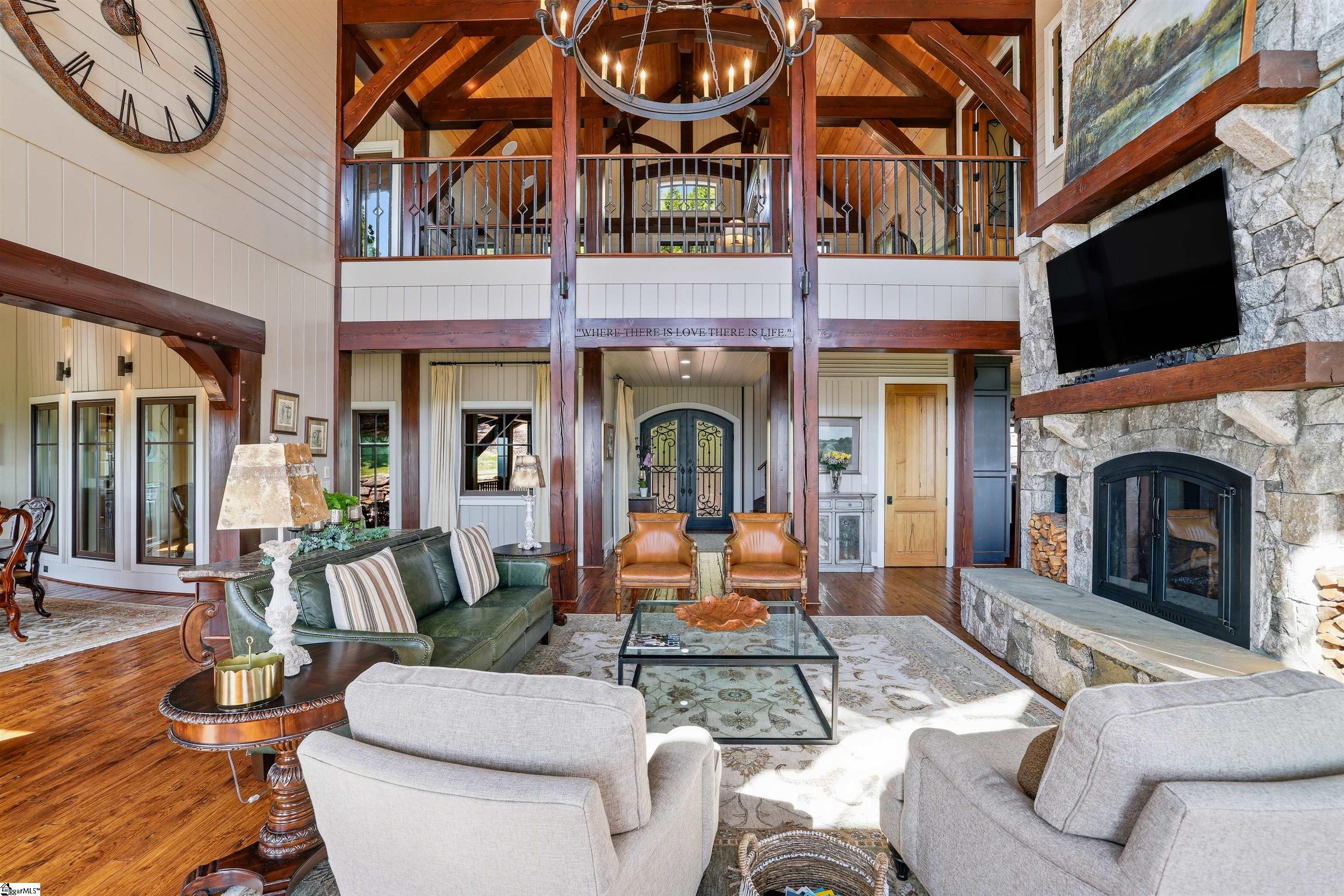 Perched atop Paris Mountain, 5 Tropicana Court is a one-of-a-kind luxury residence offering breathtaking panoramic views, exceptional craftsmanship, and a seamless blend of natural beauty and refined design. Enjoy stunning 180-degree vistas of downtown Greenville, Furman University’s Mirror Lake, and the Blue Ridge Mountains from nearly every angle of this remarkable property. Spanning over 6,000 square feet, this architectural masterpiece showcases exposed Douglas fir beams, Amish hand-scraped hickory hardwood floors, tongue-and-groove poplar walls, and custom 8-foot walnut interior doors—creating a warm, elevated aesthetic throughout with no drywall in the home. The gourmet kitchen is thoughtfully designed for both everyday living and entertaining. Featuring a fully up-fitted kitchen with custom solid wood cabinetry throughout. The main living areas offer incredible flexibility, from a dramatic great room with soaring ceilings, expansive windows, and a two-story fireplace to a private media room ideal for relaxing evenings. Multiple outdoor living spaces—including three expansive porches and a stone terrace—provide year-round enjoyment and unparalleled vantage points to take in the surrounding landscape. A fire pit area creates the perfect setting for entertaining under the stars. The home features three luxurious primary suites, each with spa-inspired bathrooms with heated floors and custom walk-in closets. An additional apartment over the garage, complete with a kitchenette and Murphy bed, offers ideal accommodations for guests or extended living. Modern conveniences include Vantage Controls automated lighting, a whole-home Juke 18-zone sound system, and a 16KW Generac propane generator for added peace of mind. Ideally located off Altamont Road in the exclusive gated City Lights subdivision, this property offers convenient access to the Swamp Rabbit Trail and is just minutes from the dining, shopping, and cultural attractions of downtown Greenville and Travelers Rest. Upgrades include a fitness studio, art studio, enclosed deck off the primary suite, custom rock wall patio with fire pit and backyard fencing. Further upgrades include approximately 2,700 sq ft of enclosed storage, a Sundance hot tub spa, fireplace enhancements, a GAF slate roof and regular maintenance that enhances the original grandeur of 5 Tropicana Court. This presents a rare opportunity to own a truly exceptional mountain retreat combining luxury, privacy, and proximity to everything Greenville has to offer. Schedule your private showing today.