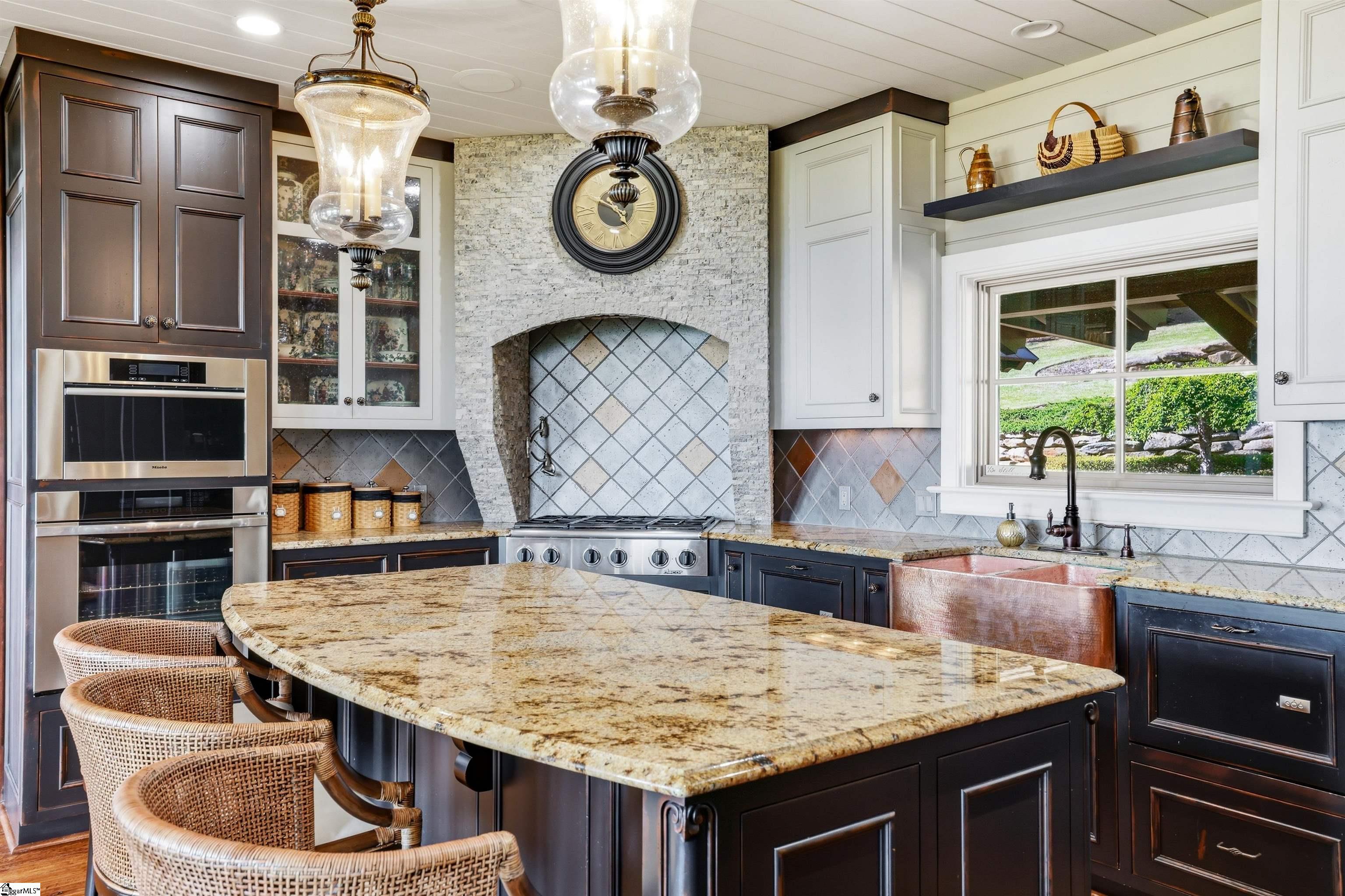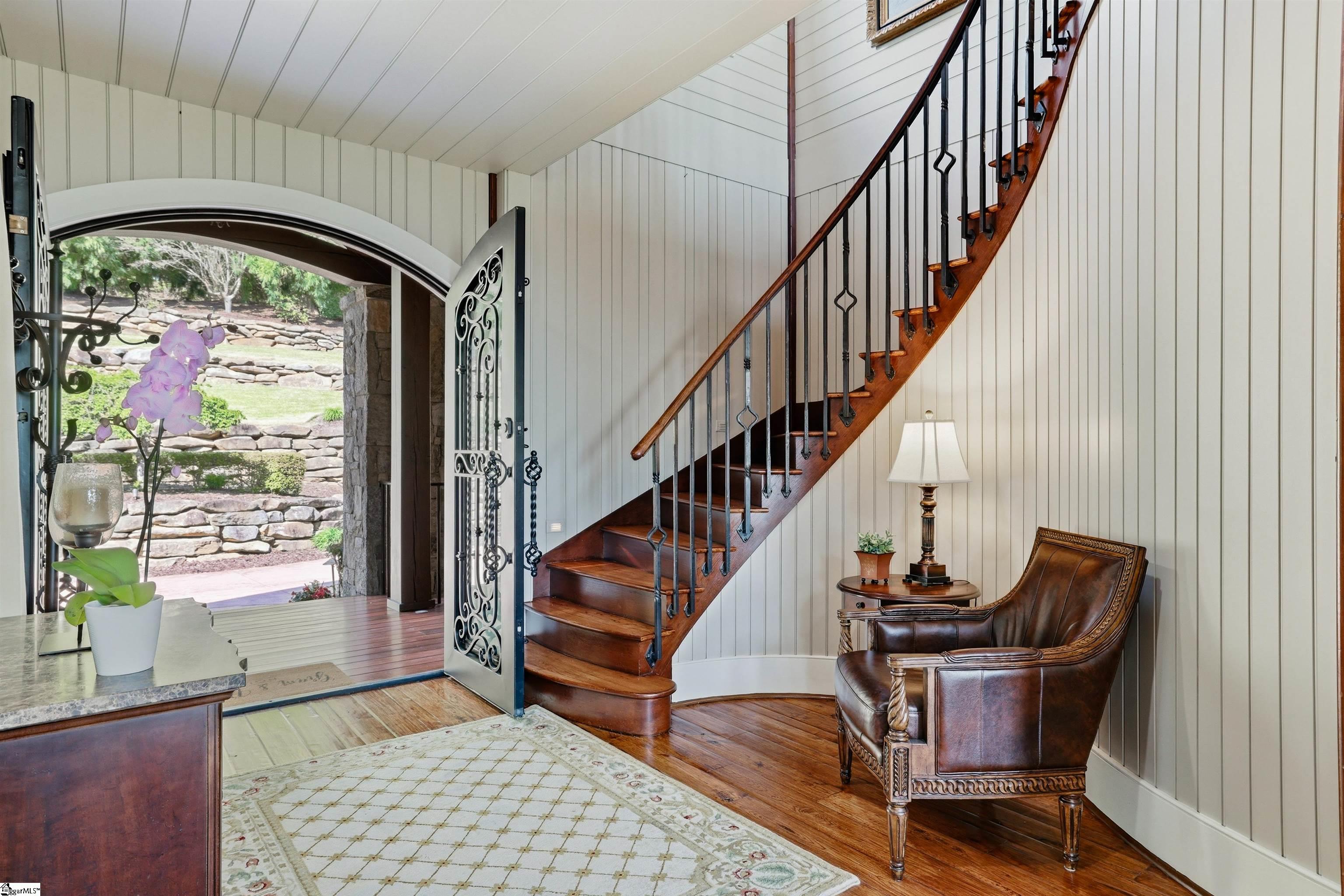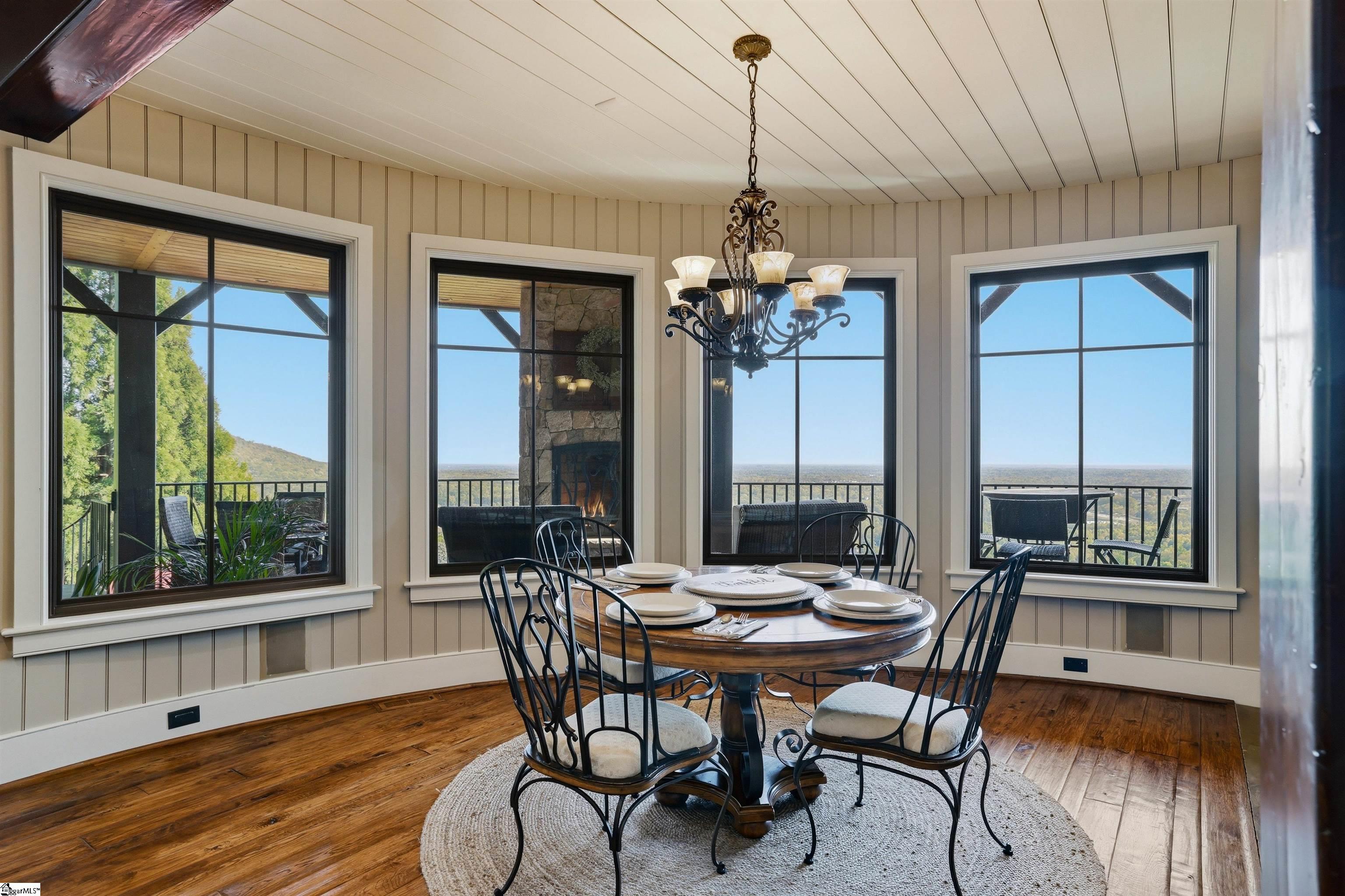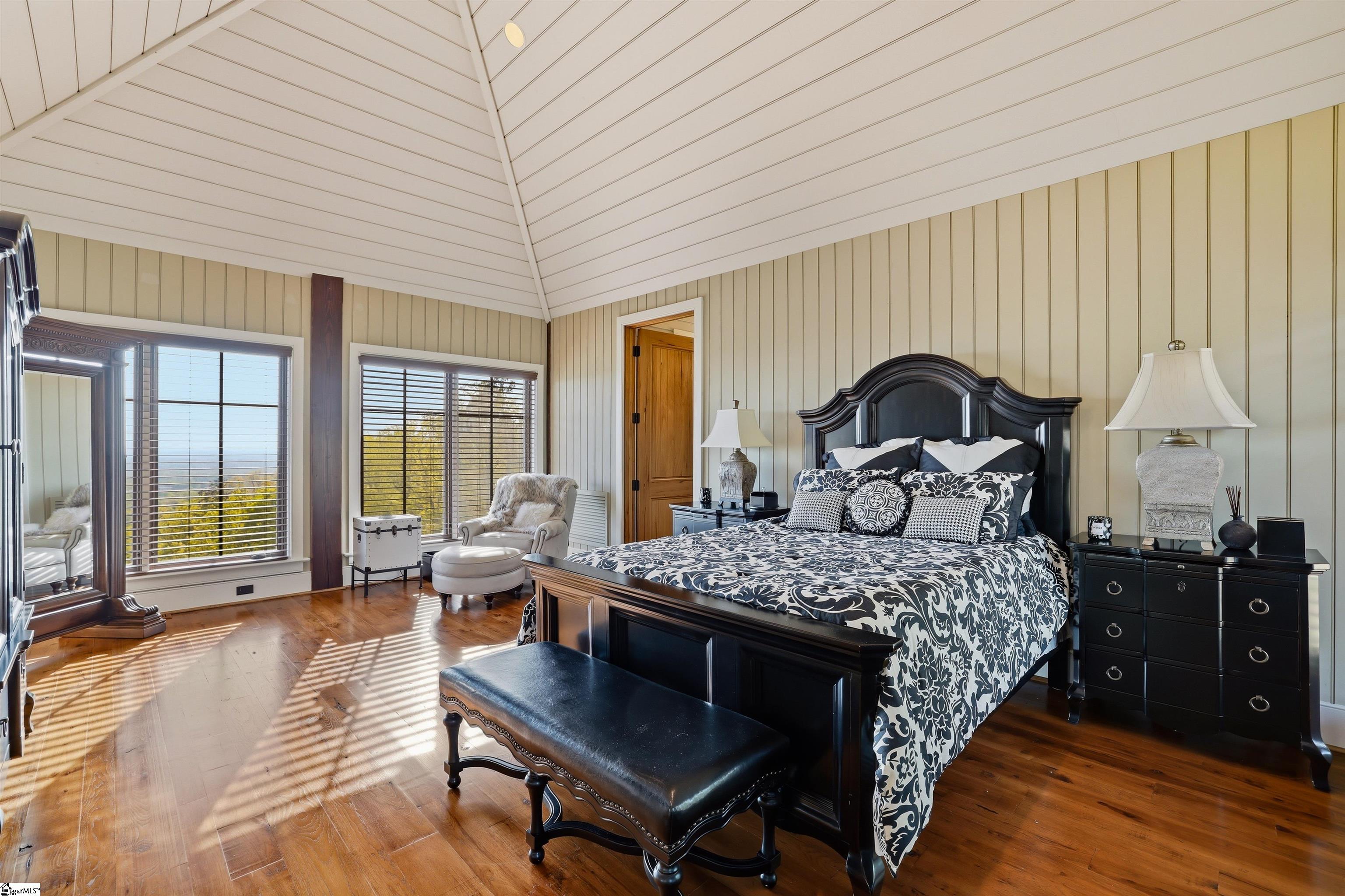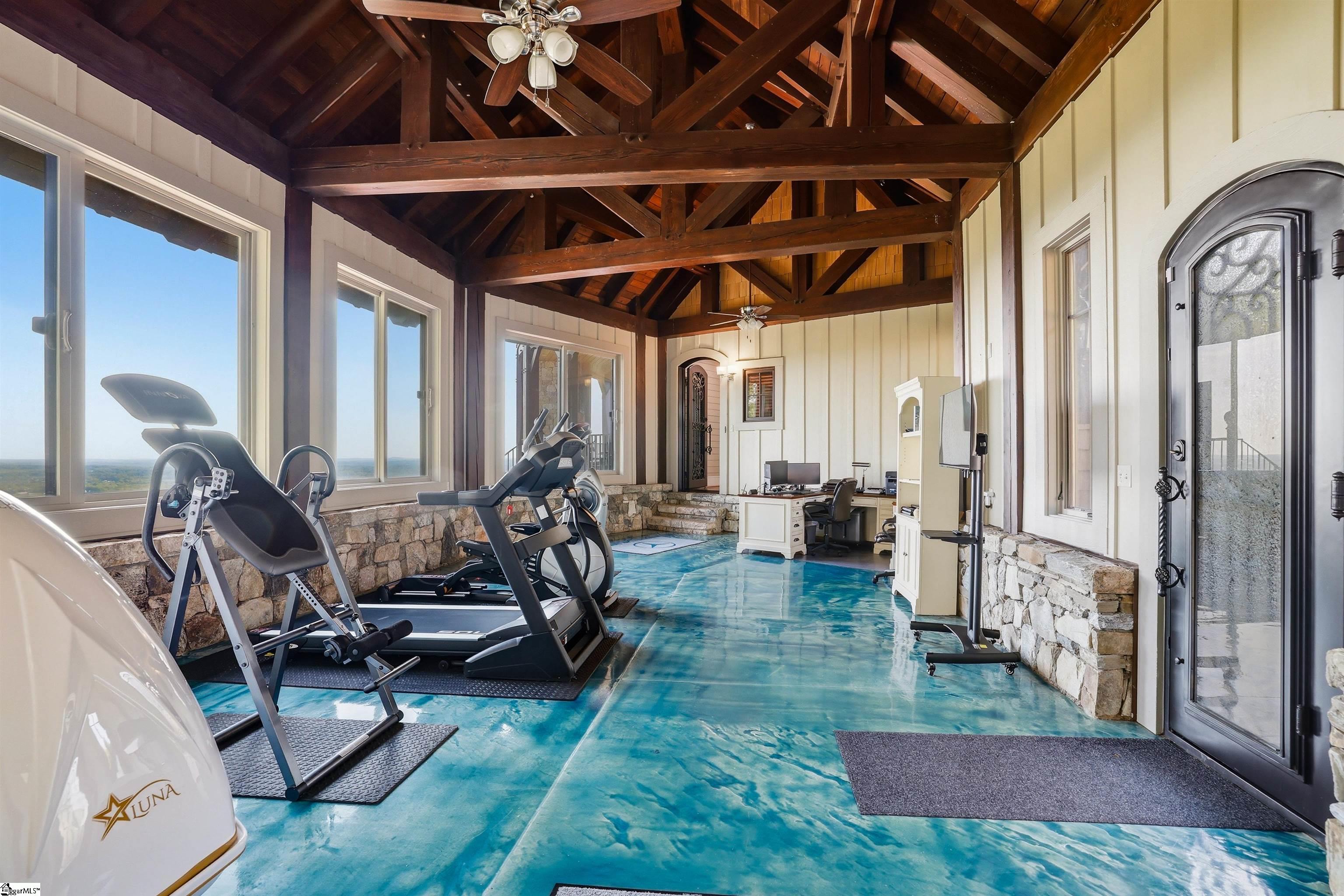 Perched atop Paris Mountain, 5 Tropicana Court is a one-of-a-kind luxury residence offering breathtaking panoramic views, exceptional craftsmanship, and a seamless blend of natural beauty and refined design. Enjoy stunning 180-degree vistas of downtown Greenville, Furman University’s Mirror Lake, and the Blue Ridge Mountains from nearly every angle of this remarkable property. Spanning over 6,000 square feet, this architectural masterpiece showcases exposed Douglas fir beams, Amish hand-scraped hickory hardwood floors, tongue-and-groove poplar walls, and custom 8-foot walnut interior doors—creating a warm, elevated aesthetic throughout with no drywall in the home. The gourmet kitchen is thoughtfully designed for both everyday living and entertaining. Featuring a fully up-fitted kitchen with custom solid wood cabinetry throughout. The main living areas offer incredible flexibility, from a dramatic great room with soaring ceilings, expansive windows, and a two-story fireplace to a private media room ideal for relaxing evenings. Multiple outdoor living spaces—including three expansive porches and a stone terrace—provide year-round enjoyment and unparalleled vantage points to take in the surrounding landscape. A fire pit area creates the perfect setting for entertaining under the stars. The home features three luxurious primary suites, each with spa-inspired bathrooms with heated floors and custom walk-in closets. An additional apartment over the garage, complete with a kitchenette and Murphy bed, offers ideal accommodations for guests or extended living. Modern conveniences include Vantage Controls automated lighting, a whole-home Juke 18-zone sound system, and a 16KW Generac propane generator for added peace of mind. Ideally located off Altamont Road in the exclusive gated City Lights subdivision, this property offers convenient access to the Swamp Rabbit Trail and is just minutes from the dining, shopping, and cultural attractions of downtown Greenville and Travelers Rest. Upgrades include a fitness studio, art studio, enclosed deck off the primary suite, custom rock wall patio with fire pit and backyard fencing. Further upgrades include approximately 2,700 sq ft of enclosed storage, a Sundance hot tub spa, fireplace enhancements, a GAF slate roof and regular maintenance that enhances the original grandeur of 5 Tropicana Court. This presents a rare opportunity to own a truly exceptional mountain retreat combining luxury, privacy, and proximity to everything Greenville has to offer. Schedule your private showing today.