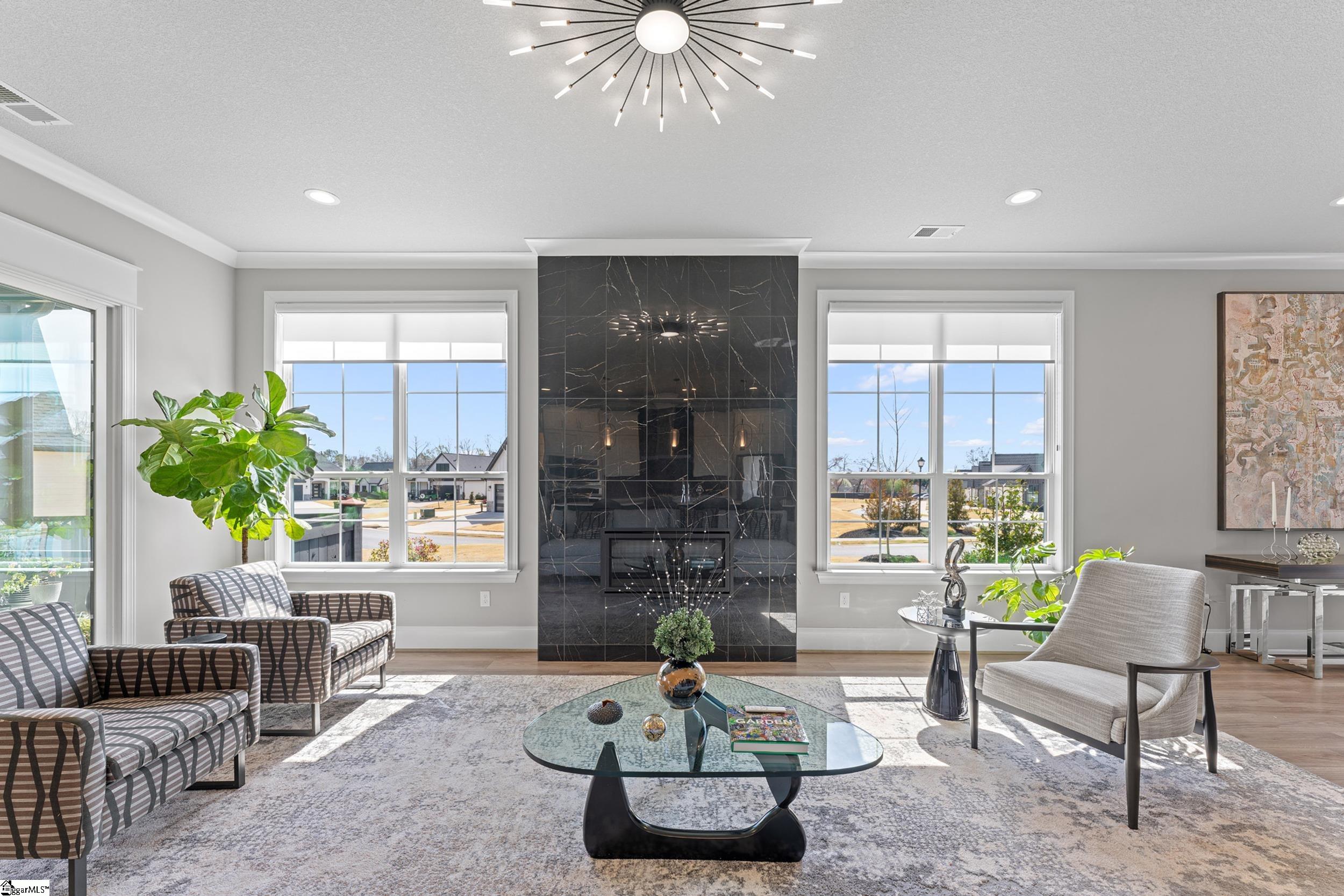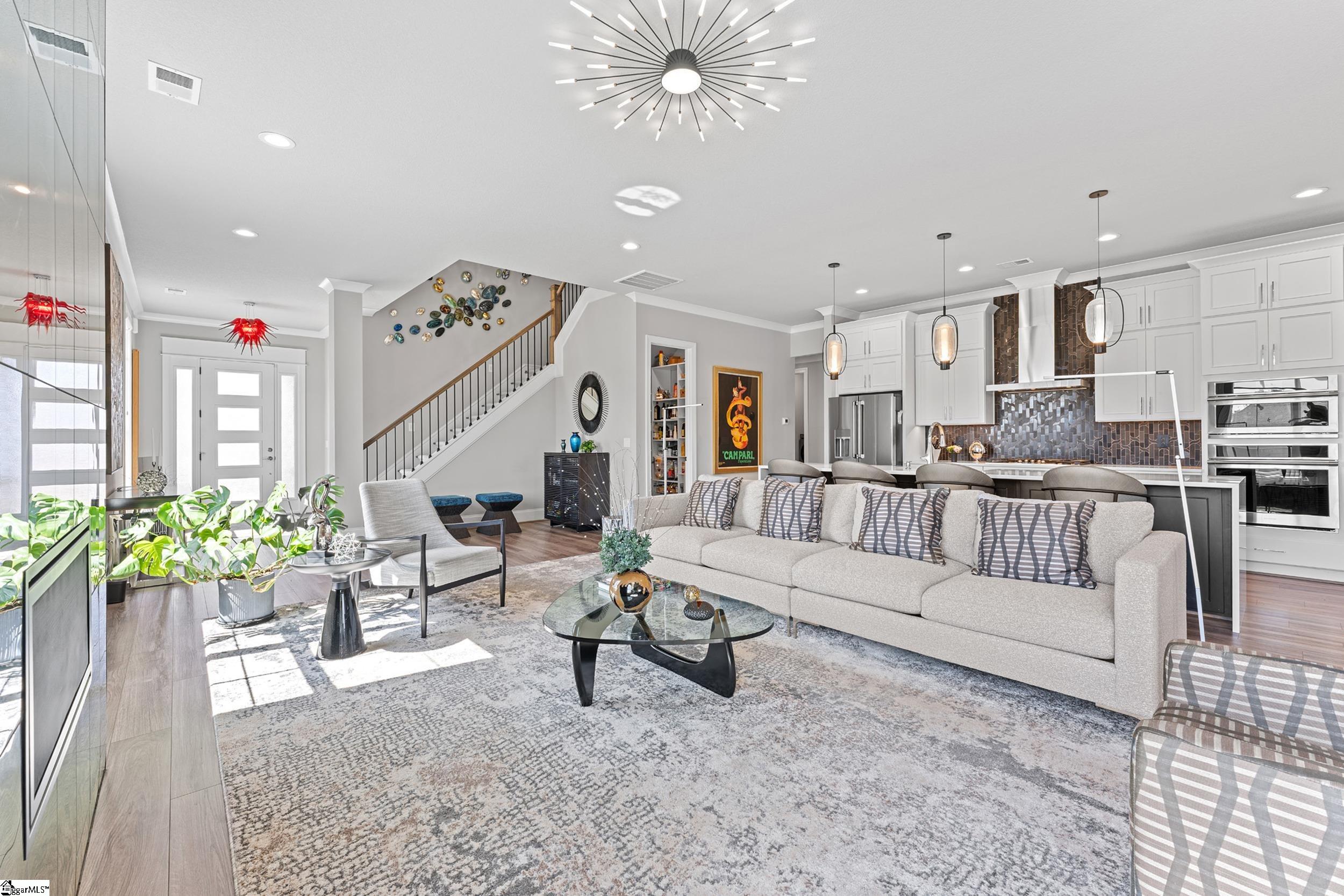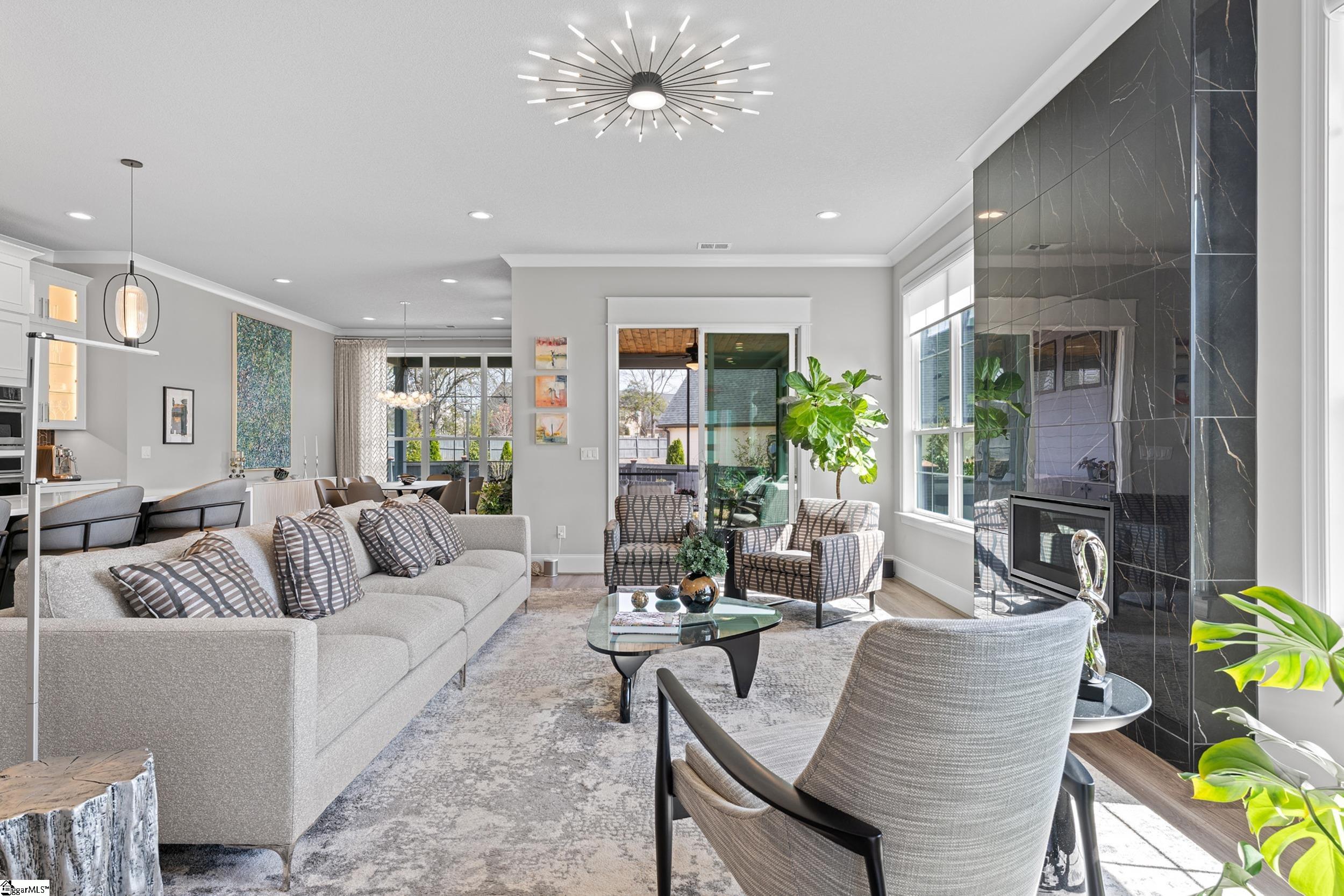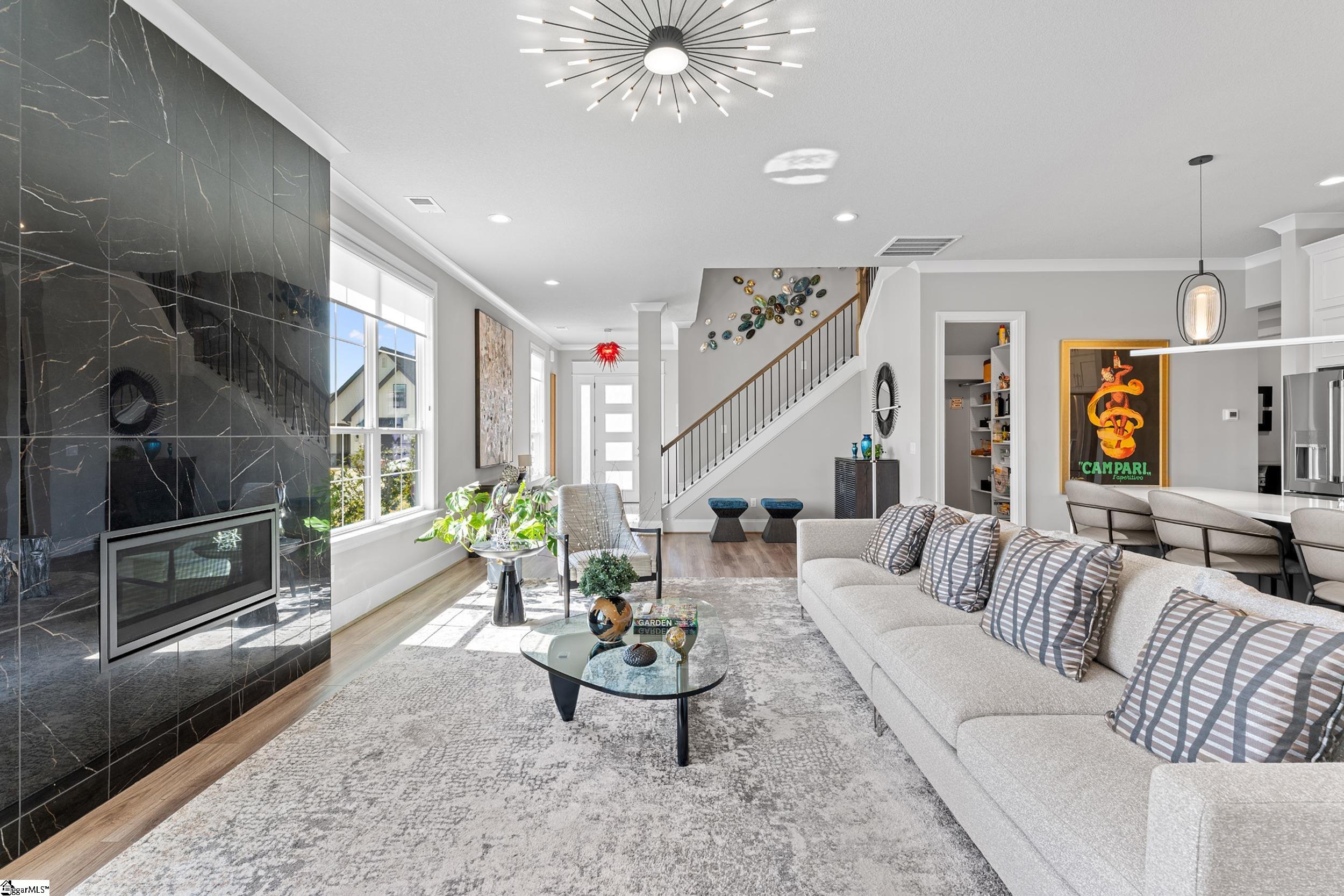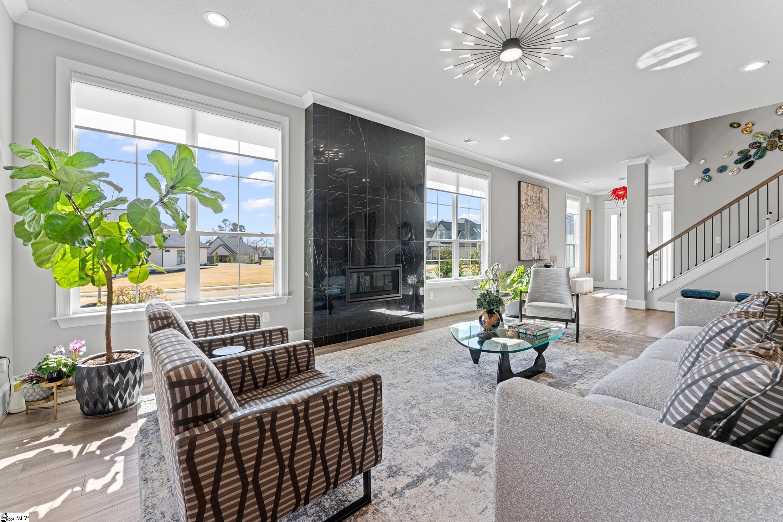Welcome to this light-filled, energy-efficient, expertly crafted contemporary home in the heart of Five Forks—one of Greenville County’s most sought-after locations, known for its convenience to shopping, dining, and everyday amenities. Designed for both comfort and style, the main level features soaring 10-foot ceilings and a spacious open-concept living and dining area, perfect for gathering and entertaining. The chef’s kitchen is a true centerpiece, showcasing Monogram stainless steel appliances and a stunning 12-foot quartz waterfall island. The main-level primary suite offers a spa-like tiled bath, while a dedicated study/media room, designer half bath with warm copper tones, and a tiled laundry room complete the first floor. Upstairs, you’ll find two additional bedrooms, a beautifully finished full bath with a frameless glass tub enclosure, and a bright loft/flex space ideal for a second living area, office, or playroom. No detail has been overlooked in this luxury home. Interior highlights include transom windows that enhance natural light, crown molding throughout the main level, a floor-to-ceiling Perpetuo stone linear gas fireplace, a natural marble Pietra Divina backsplash, custom closets and pantry storage, smart-controlled roller shades, designer lighting and fans, and a truly stunning Barletta multidrop chandelier by Eurofase that makes a statement in the stairwell. Thoughtful construction upgrades further enhance the home’s efficiency and comfort, including roof decking upgraded from standard plywood to Solar Board—featuring a reflective silver coating on both sides that helps reduce heat transfer and improves energy retention by minimizing loss through the roof. Outdoor living is just as impressive, with professionally designed landscaping, low-voltage lighting, drip irrigation, and a beautifully fenced garden featuring perennials and Japanese maples. Enjoy it all from the screened and covered porch with a stone-faced gas fireplace and epoxy-coated flooring perfect for year-round enjoyment. The garage is equally well-equipped with epoxy flooring, EV wiring, and a transfer switch for a generator. Situated on a beautiful corner lot in a quiet neighborhood, this low-maintenance property also includes lawn care, irrigation, and trash service covered by the HOA. This is a rare opportunity to own a thoughtfully designed, move-in-ready home in one of the Upstate’s most desirable areas. Schedule your showing today, this one won’t last!