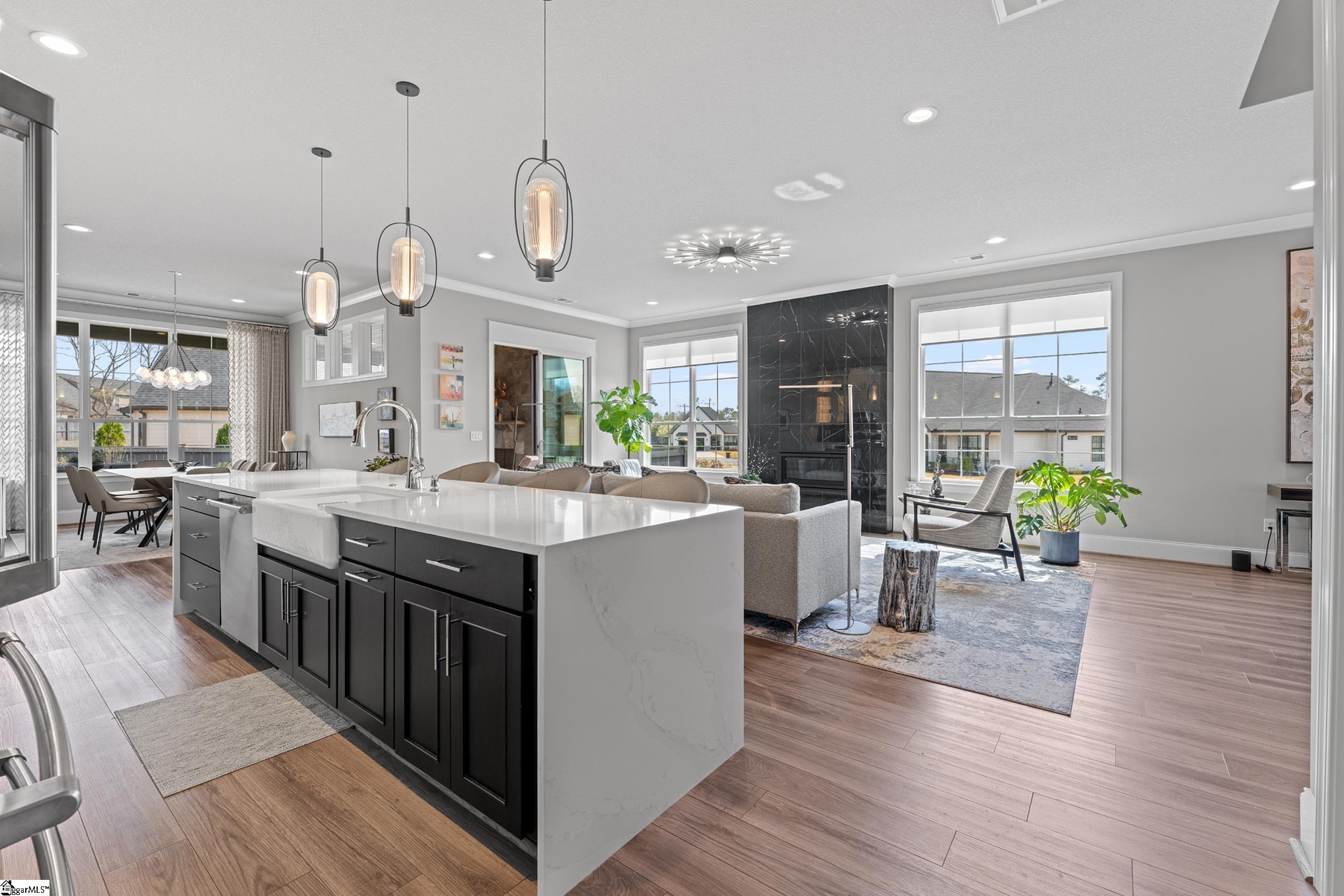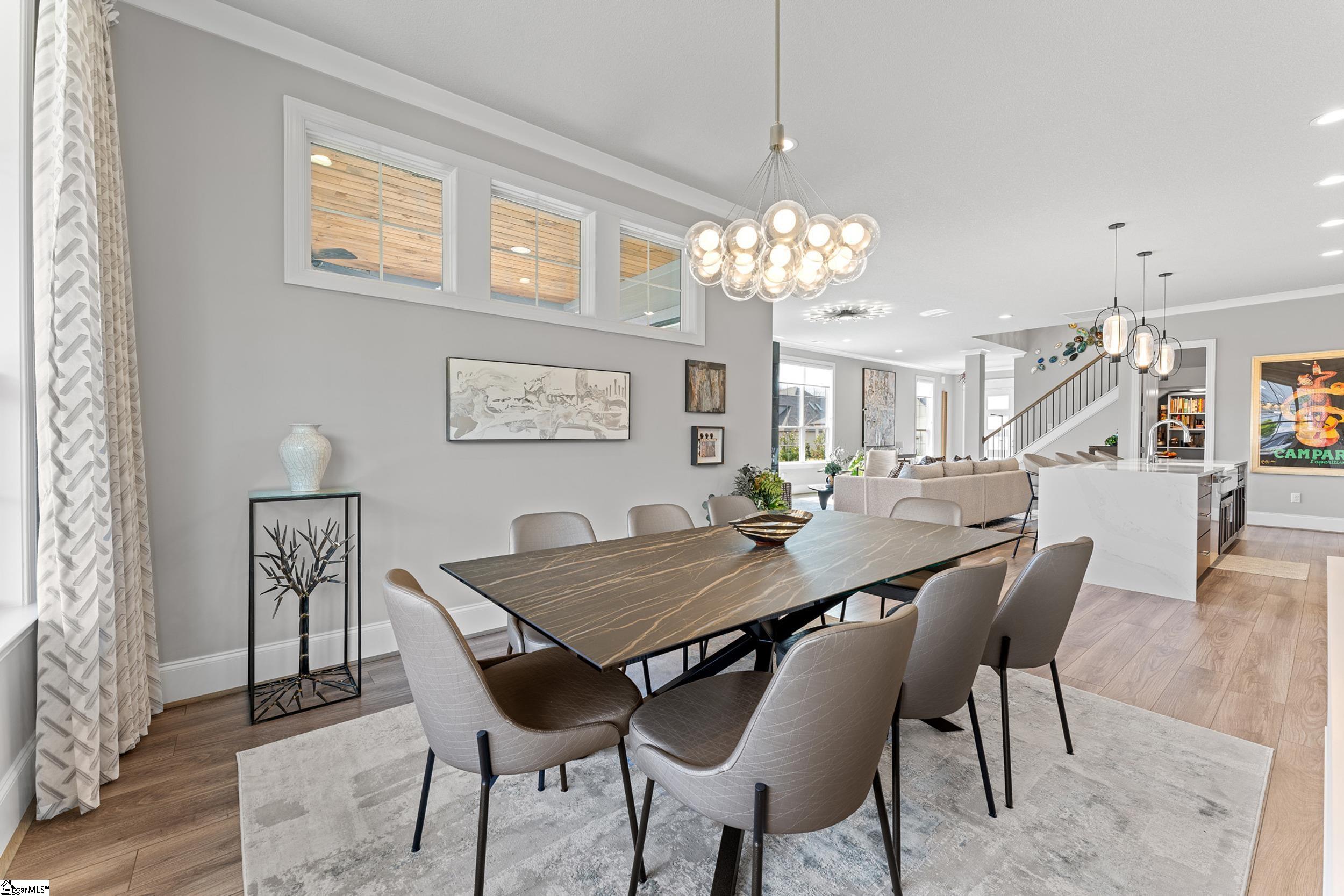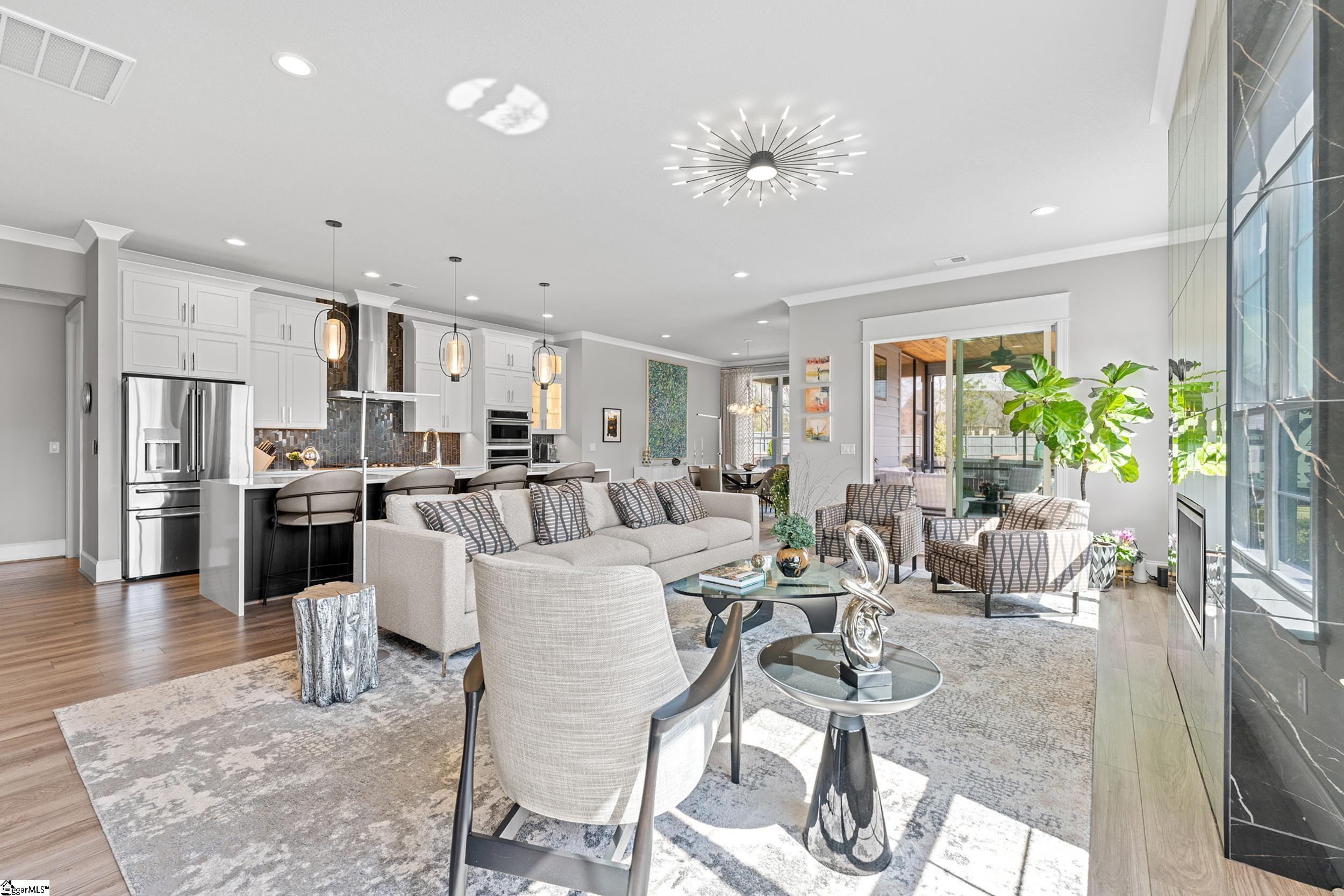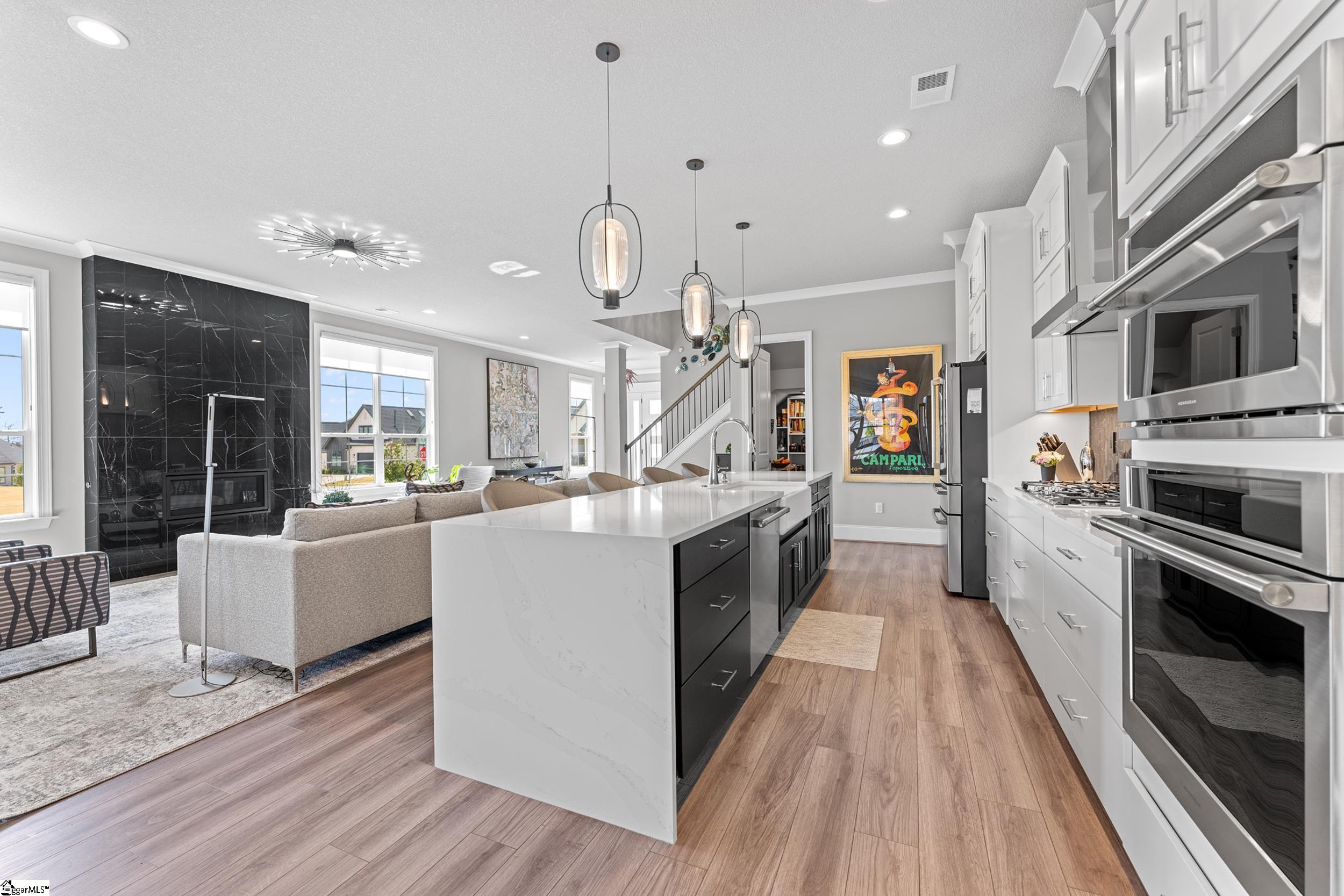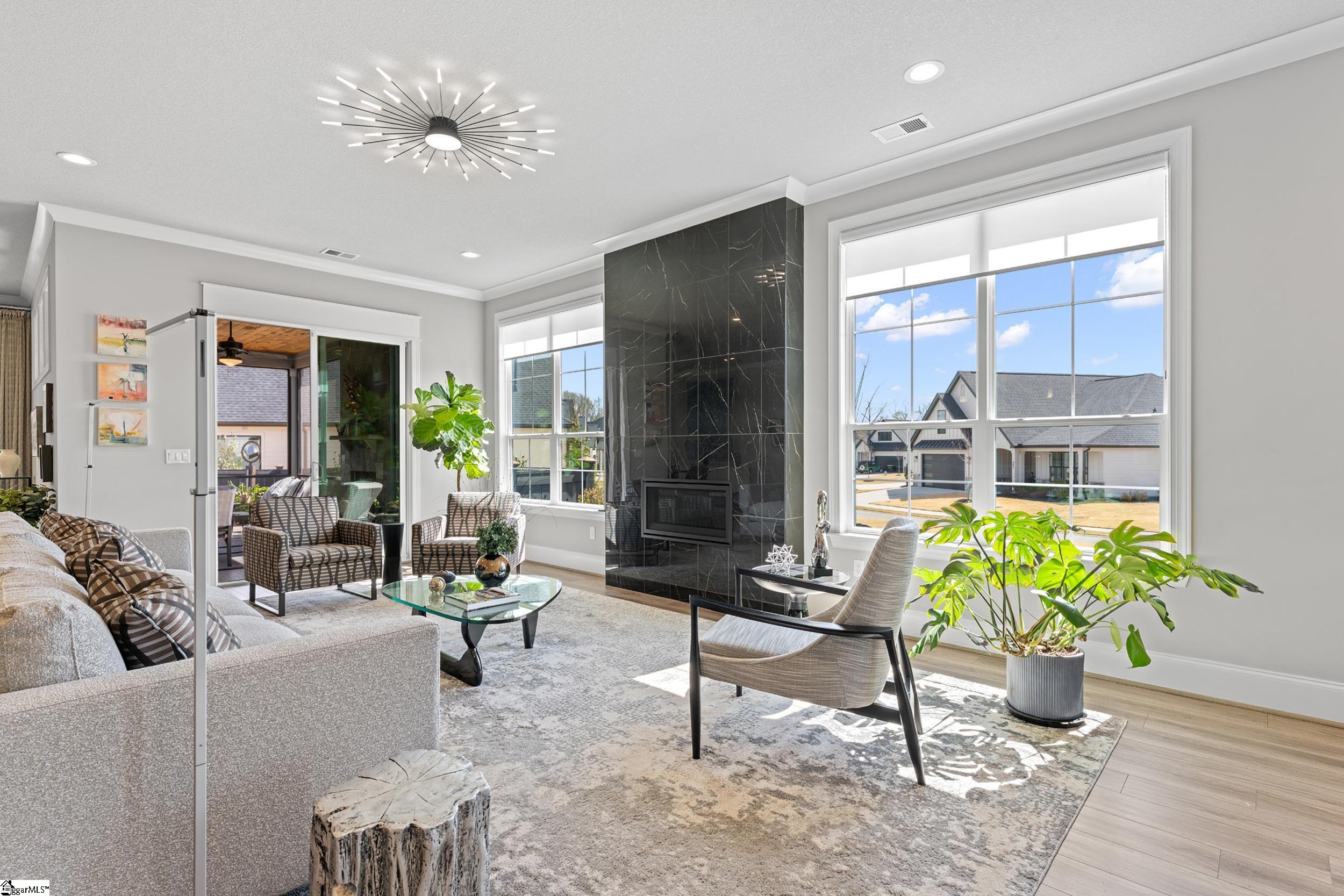 Welcome to this light-filled, energy-efficient, expertly crafted contemporary home in the heart of Five Forks—one of Greenville County’s most sought-after locations, known for its convenience to shopping, dining, and everyday amenities. Designed for both comfort and style, the main level features soaring 10-foot ceilings and a spacious open-concept living and dining area, perfect for gathering and entertaining. The chef’s kitchen is a true centerpiece, showcasing Monogram stainless steel appliances and a stunning 12-foot quartz waterfall island. The main-level primary suite offers a spa-like tiled bath, while a dedicated study/media room, designer half bath with warm copper tones, and a tiled laundry room complete the first floor. Upstairs, you’ll find two additional bedrooms, a beautifully finished full bath with a frameless glass tub enclosure, and a bright loft/flex space ideal for a second living area, office, or playroom. No detail has been overlooked in this luxury home. Interior highlights include transom windows that enhance natural light, crown molding throughout the main level, a floor-to-ceiling Perpetuo stone linear gas fireplace, a natural marble Pietra Divina backsplash, custom closets and pantry storage, smart-controlled roller shades, designer lighting and fans, and a truly stunning Barletta multidrop chandelier by Eurofase that makes a statement in the stairwell. Thoughtful construction upgrades further enhance the home’s efficiency and comfort, including roof decking upgraded from standard plywood to Solar Board—featuring a reflective silver coating on both sides that helps reduce heat transfer and improves energy retention by minimizing loss through the roof. Outdoor living is just as impressive, with professionally designed landscaping, low-voltage lighting, drip irrigation, and a beautifully fenced garden featuring perennials and Japanese maples. Enjoy it all from the screened and covered porch with a stone-faced gas fireplace and epoxy-coated flooring perfect for year-round enjoyment. The garage is equally well-equipped with epoxy flooring, EV wiring, and a transfer switch for a generator. Situated on a beautiful corner lot in a quiet neighborhood, this low-maintenance property also includes lawn care, irrigation, and trash service covered by the HOA. This is a rare opportunity to own a thoughtfully designed, move-in-ready home in one of the Upstate’s most desirable areas. Schedule your showing today, this one won’t last!