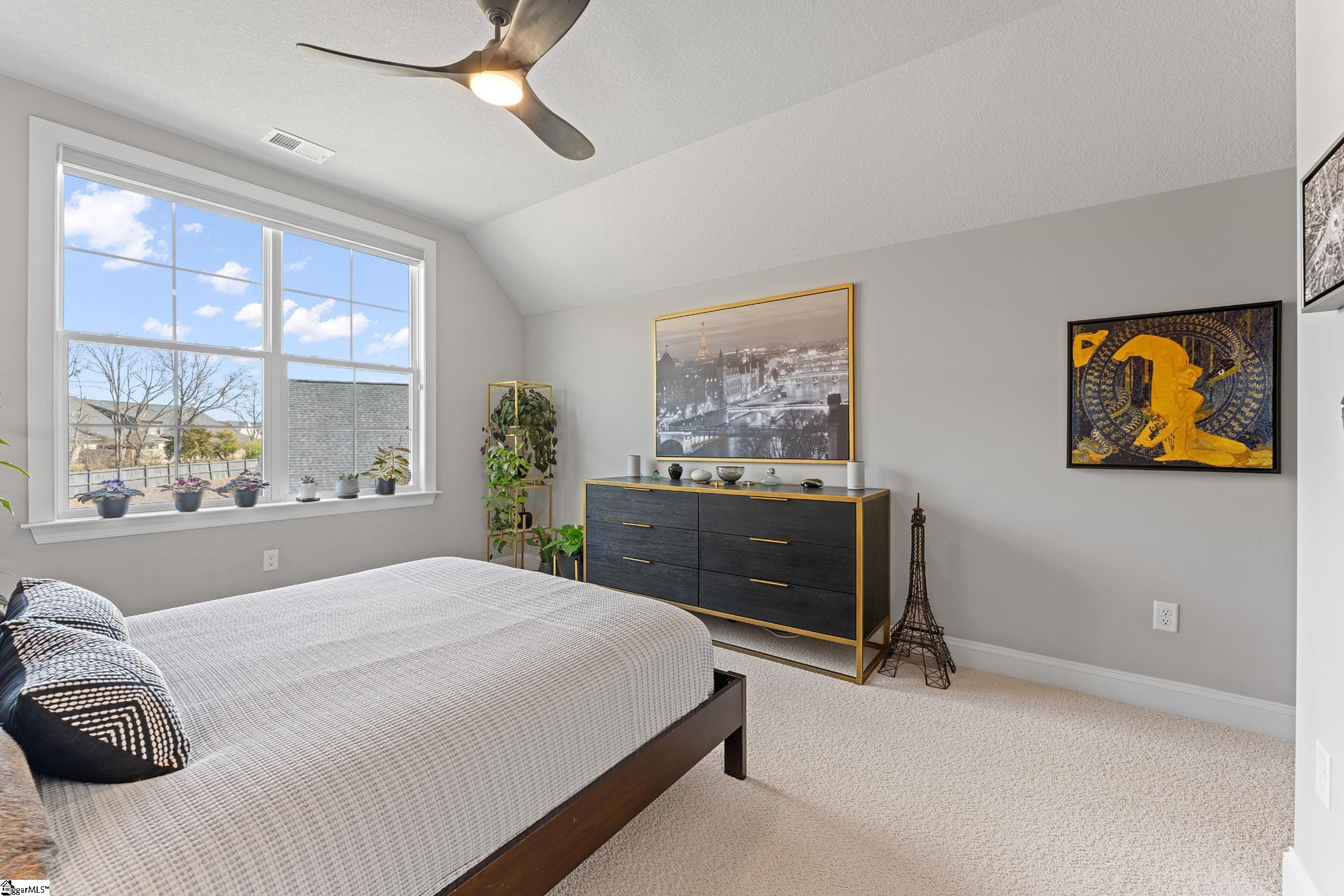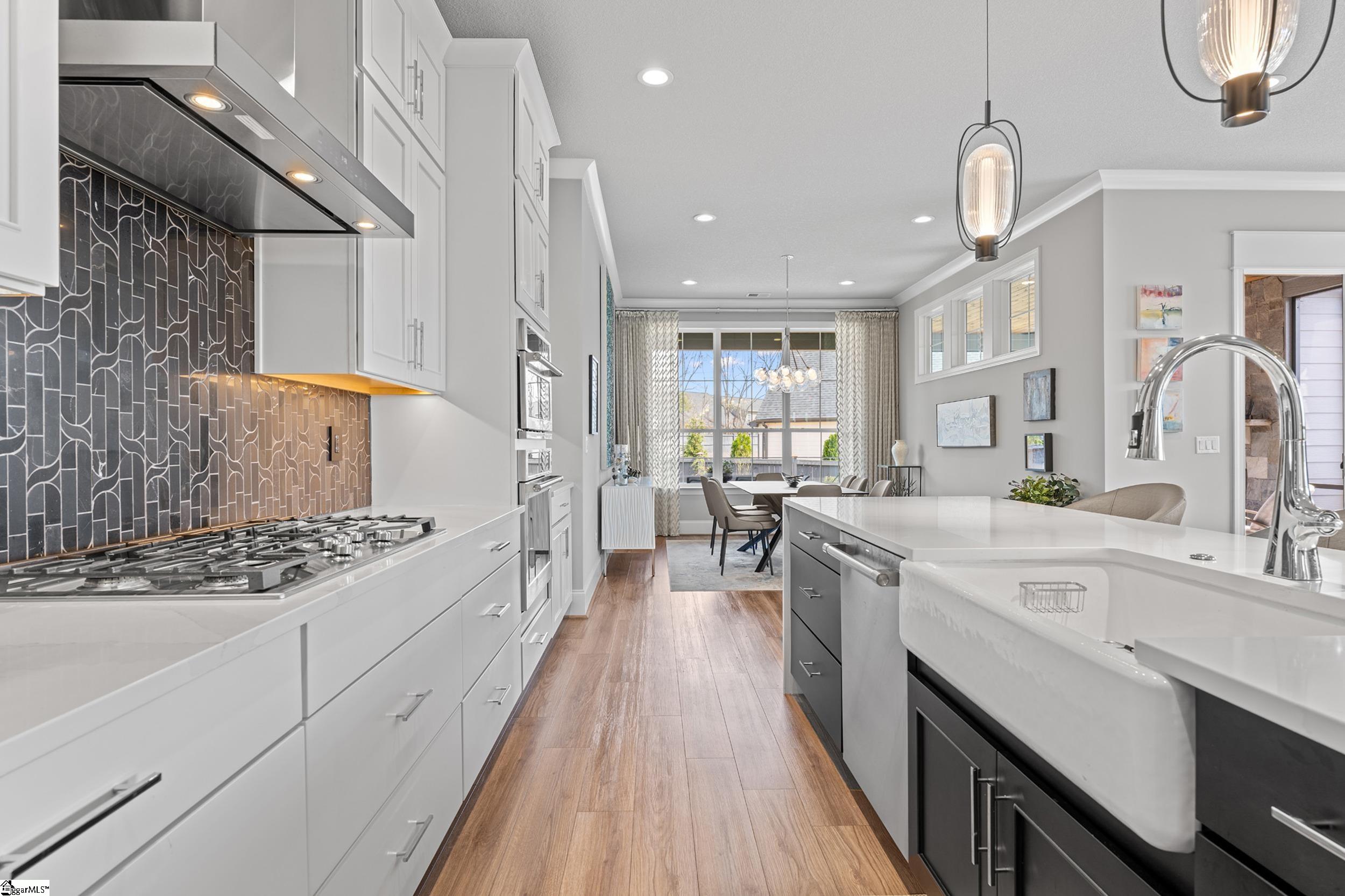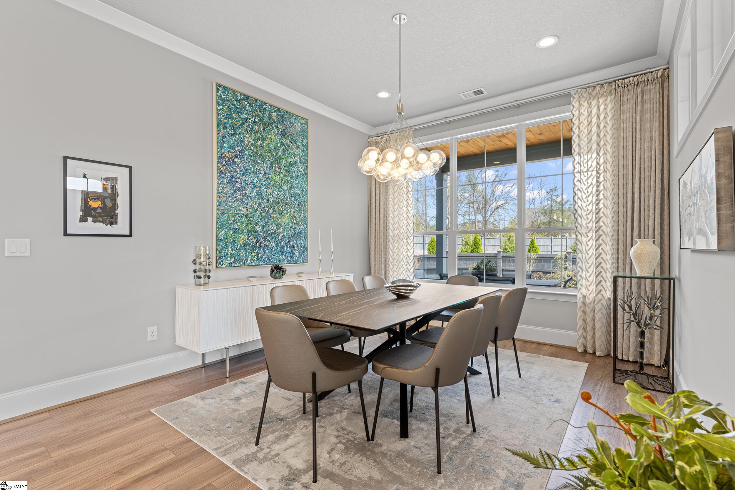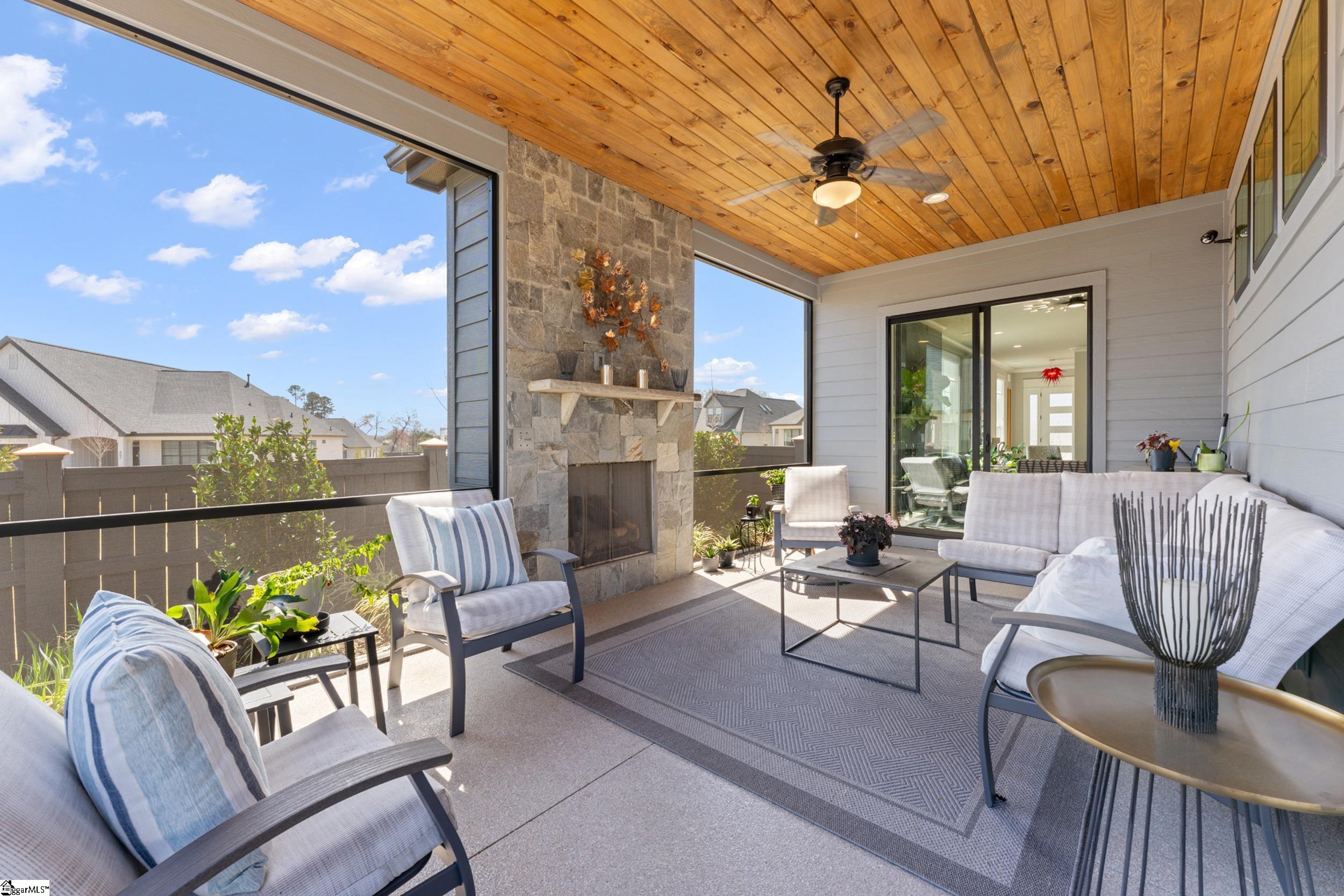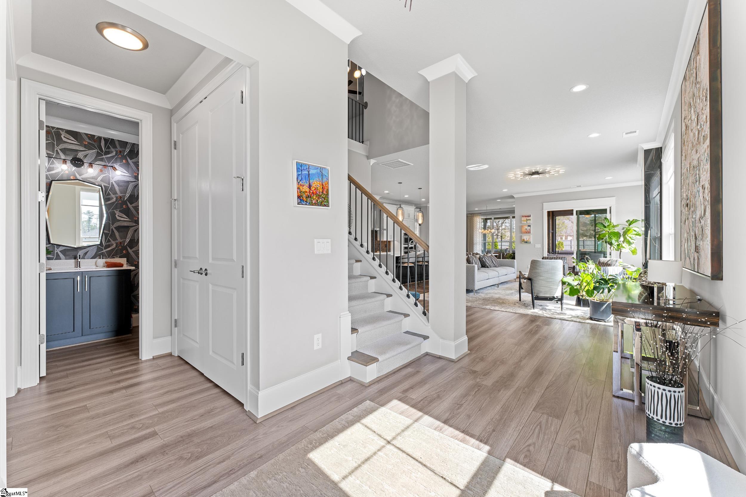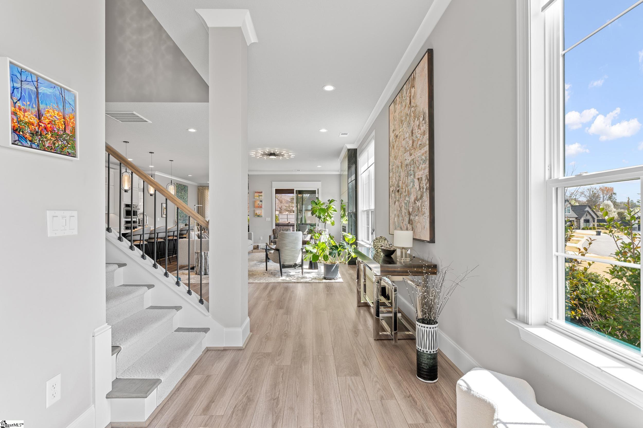 Welcome to this light-filled, energy-efficient, expertly crafted contemporary home in the heart of Five Forks—one of Greenville County’s most sought-after locations, known for its convenience to shopping, dining, and everyday amenities. Designed for both comfort and style, the main level features soaring 10-foot ceilings and a spacious open-concept living and dining area, perfect for gathering and entertaining. The chef’s kitchen is a true centerpiece, showcasing Monogram stainless steel appliances and a stunning 12-foot quartz waterfall island. The main-level primary suite offers a spa-like tiled bath, while a dedicated study/media room, designer half bath with warm copper tones, and a tiled laundry room complete the first floor. Upstairs, you’ll find two additional bedrooms, a beautifully finished full bath with a frameless glass tub enclosure, and a bright loft/flex space ideal for a second living area, office, or playroom. No detail has been overlooked in this luxury home. Interior highlights include transom windows that enhance natural light, crown molding throughout the main level, a floor-to-ceiling Perpetuo stone linear gas fireplace, a natural marble Pietra Divina backsplash, custom closets and pantry storage, smart-controlled roller shades, designer lighting and fans, and a truly stunning Barletta multidrop chandelier by Eurofase that makes a statement in the stairwell. Thoughtful construction upgrades further enhance the home’s efficiency and comfort, including roof decking upgraded from standard plywood to Solar Board—featuring a reflective silver coating on both sides that helps reduce heat transfer and improves energy retention by minimizing loss through the roof. Outdoor living is just as impressive, with professionally designed landscaping, low-voltage lighting, drip irrigation, and a beautifully fenced garden featuring perennials and Japanese maples. Enjoy it all from the screened and covered porch with a stone-faced gas fireplace and epoxy-coated flooring perfect for year-round enjoyment. The garage is equally well-equipped with epoxy flooring, EV wiring, and a transfer switch for a generator. Situated on a beautiful corner lot in a quiet neighborhood, this low-maintenance property also includes lawn care, irrigation, and trash service covered by the HOA. This is a rare opportunity to own a thoughtfully designed, move-in-ready home in one of the Upstate’s most desirable areas. Schedule your showing today, this one won’t last!