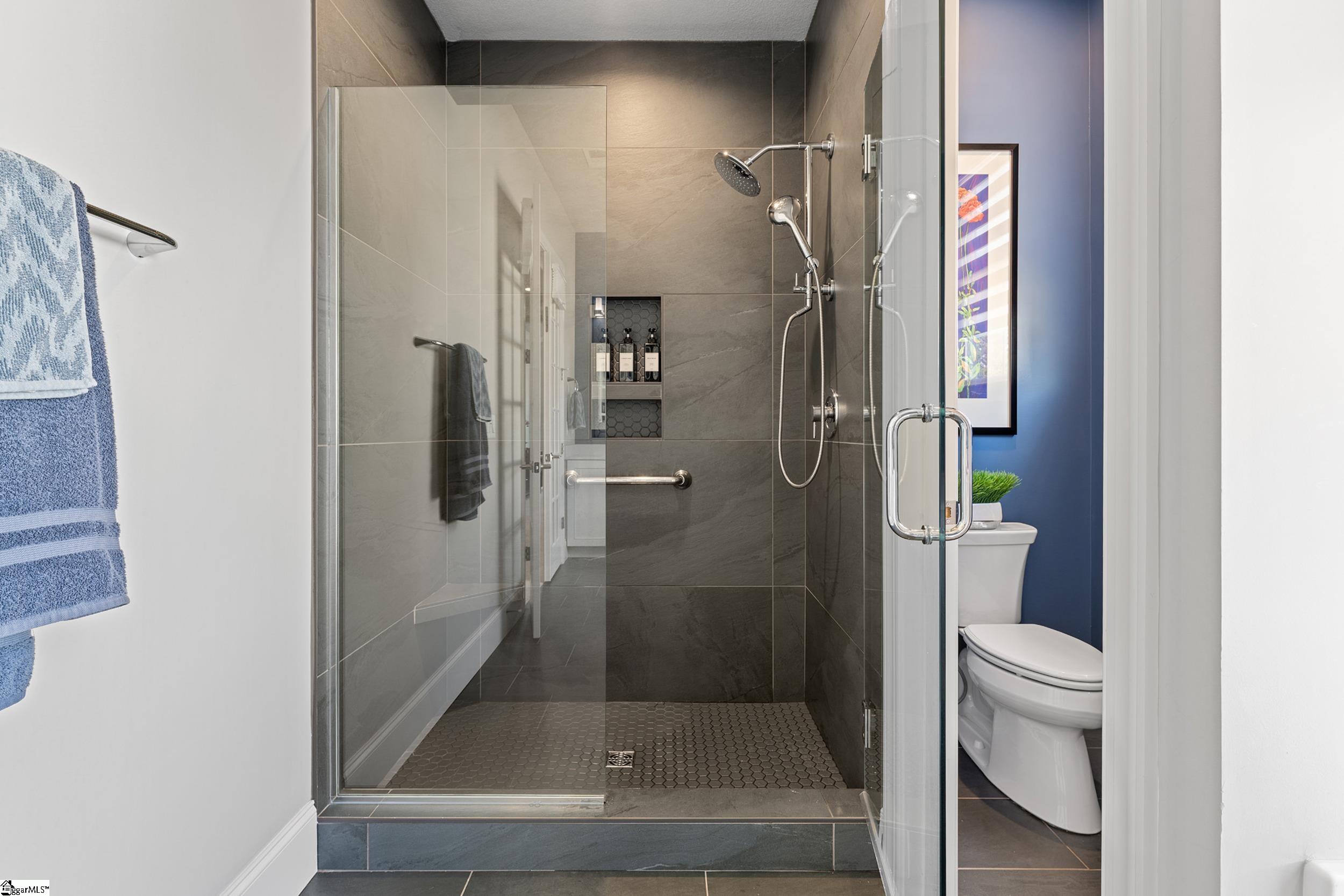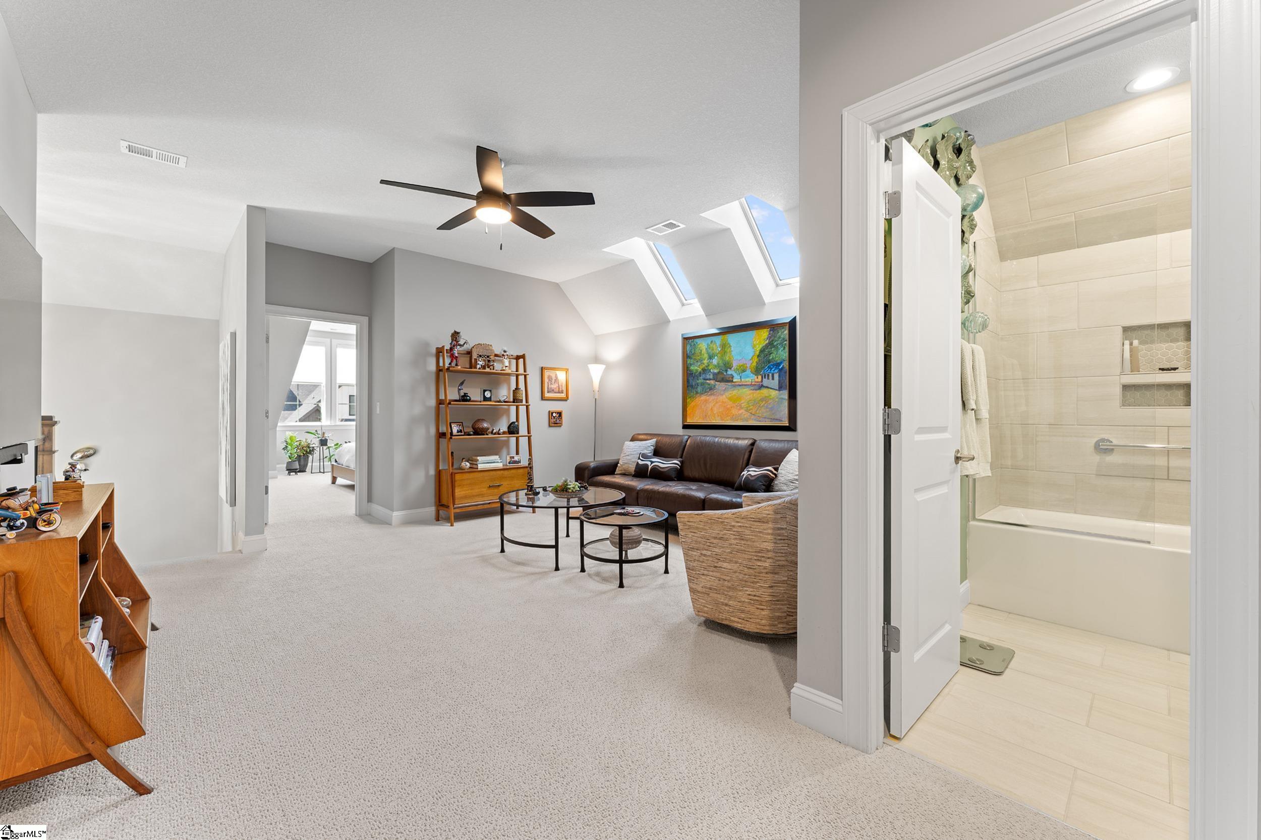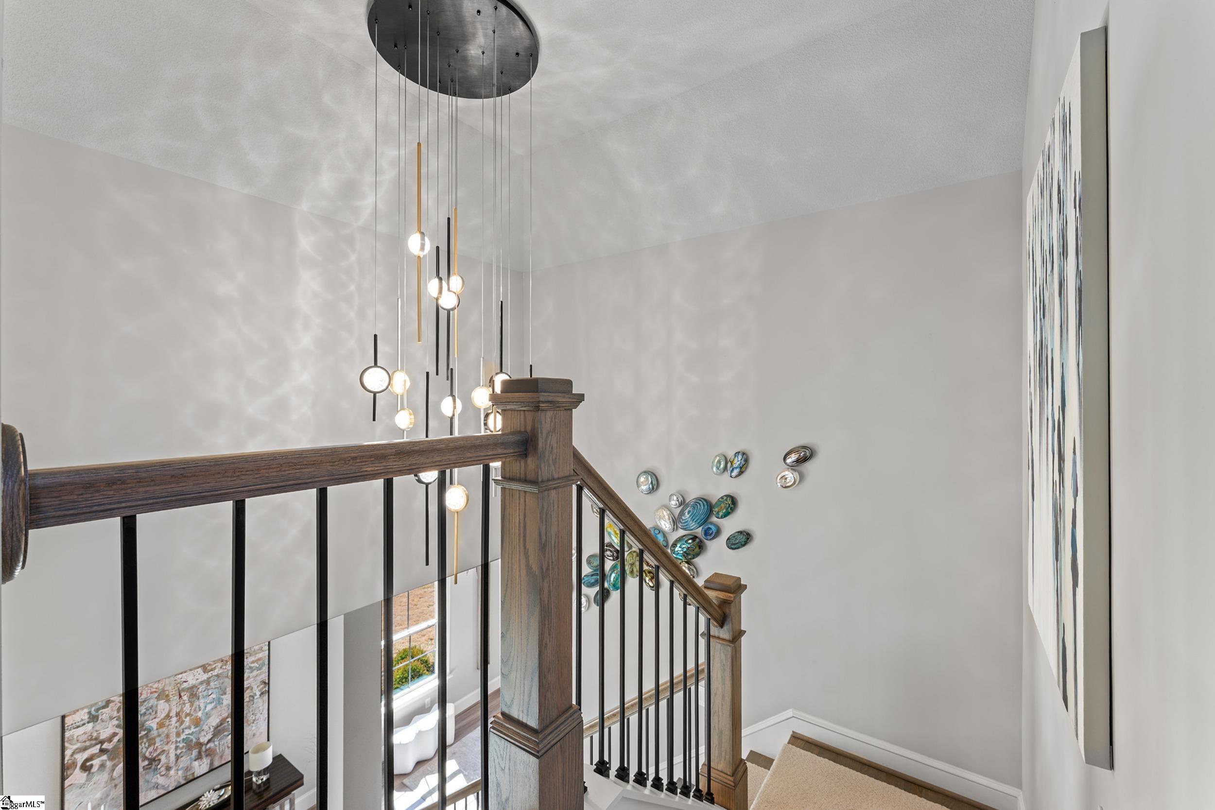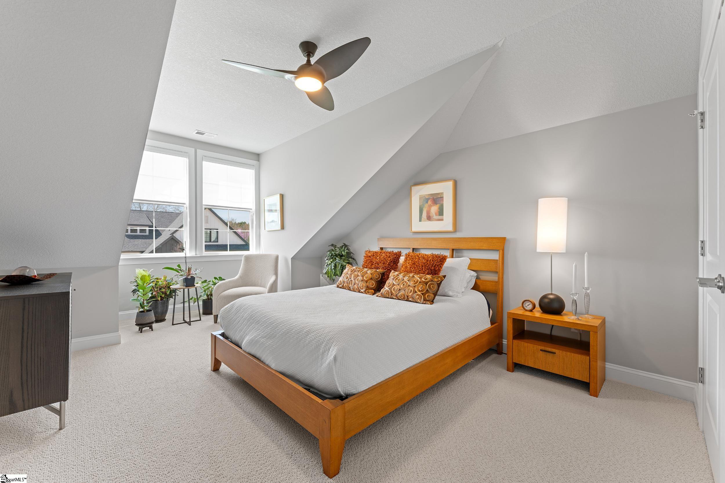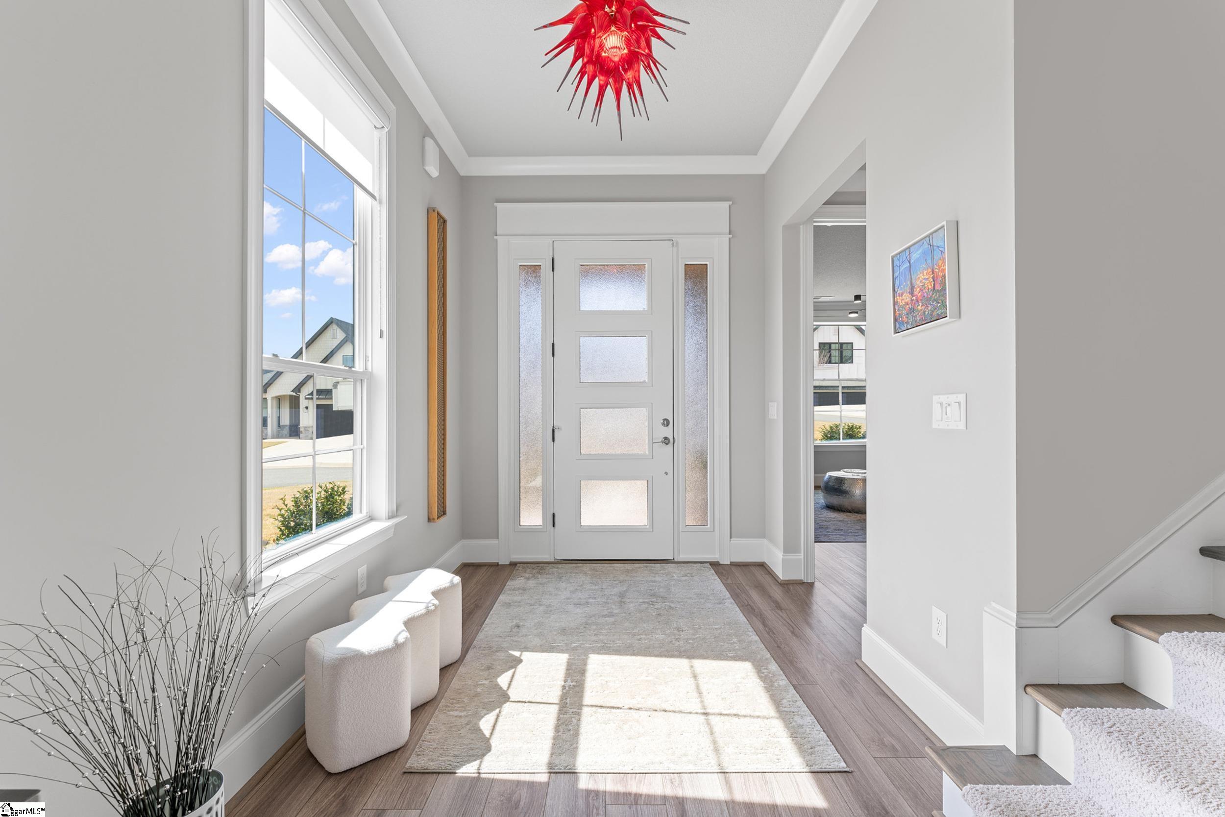 Welcome to this light-filled, energy-efficient, expertly crafted contemporary home in the heart of Five Forks—one of Greenville County’s most sought-after locations, known for its convenience to shopping, dining, and everyday amenities. Designed for both comfort and style, the main level features soaring 10-foot ceilings and a spacious open-concept living and dining area, perfect for gathering and entertaining. The chef’s kitchen is a true centerpiece, showcasing Monogram stainless steel appliances and a stunning 12-foot quartz waterfall island. The main-level primary suite offers a spa-like tiled bath, while a dedicated study/media room, designer half bath with warm copper tones, and a tiled laundry room complete the first floor. Upstairs, you’ll find two additional bedrooms, a beautifully finished full bath with a frameless glass tub enclosure, and a bright loft/flex space ideal for a second living area, office, or playroom. No detail has been overlooked in this luxury home. Interior highlights include transom windows that enhance natural light, crown molding throughout the main level, a floor-to-ceiling Perpetuo stone linear gas fireplace, a natural marble Pietra Divina backsplash, custom closets and pantry storage, smart-controlled roller shades, designer lighting and fans, and a truly stunning Barletta multidrop chandelier by Eurofase that makes a statement in the stairwell. Thoughtful construction upgrades further enhance the home’s efficiency and comfort, including roof decking upgraded from standard plywood to Solar Board—featuring a reflective silver coating on both sides that helps reduce heat transfer and improves energy retention by minimizing loss through the roof. Outdoor living is just as impressive, with professionally designed landscaping, low-voltage lighting, drip irrigation, and a beautifully fenced garden featuring perennials and Japanese maples. Enjoy it all from the screened and covered porch with a stone-faced gas fireplace and epoxy-coated flooring perfect for year-round enjoyment. The garage is equally well-equipped with epoxy flooring, EV wiring, and a transfer switch for a generator. Situated on a beautiful corner lot in a quiet neighborhood, this low-maintenance property also includes lawn care, irrigation, and trash service covered by the HOA. This is a rare opportunity to own a thoughtfully designed, move-in-ready home in one of the Upstate’s most desirable areas. Schedule your showing today, this one won’t last!