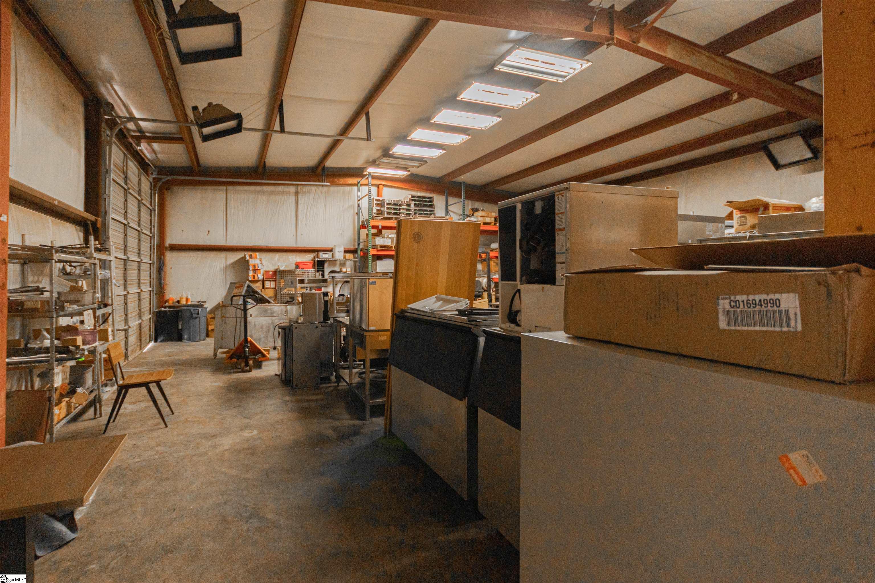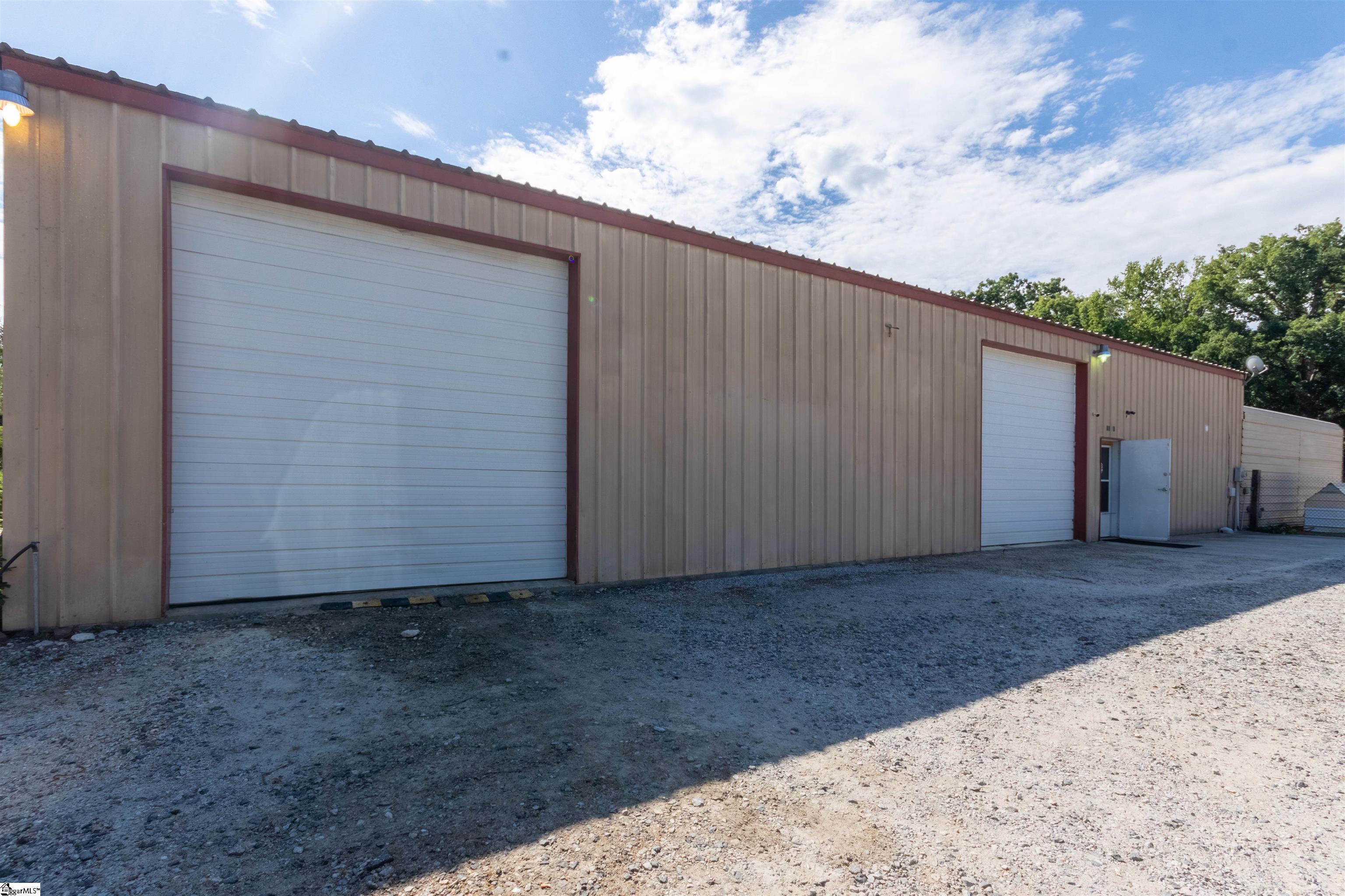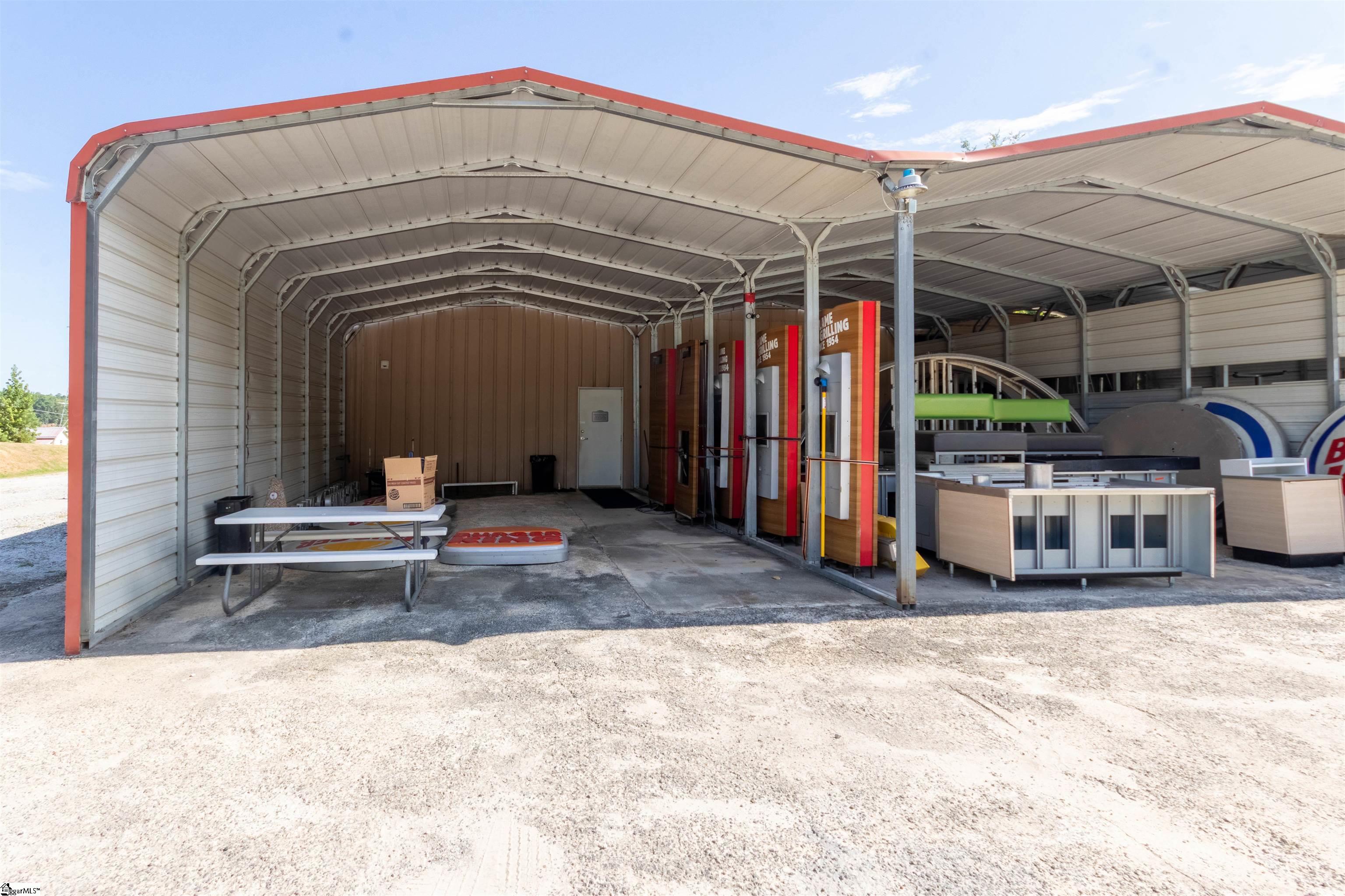 Spacious commercial building located just off Lake Greenwood, offering a flexible layout for a variety of business needs. The property features three large, camper-sized carport bays and generous warehouse space. Portions of the building are heated and cooled, including some office and meeting areas. The main level includes multiple workspaces, a kitchen, a full bathroom with shower, and an additional half bath. Upstairs offers several separate rooms ideal for offices or storage, along with another half bath. The property is currently on well water and septic, with public water expected once county lines are extended (timeline not yet available). Ample lot space and parking provide added convenience for a wide range of uses.