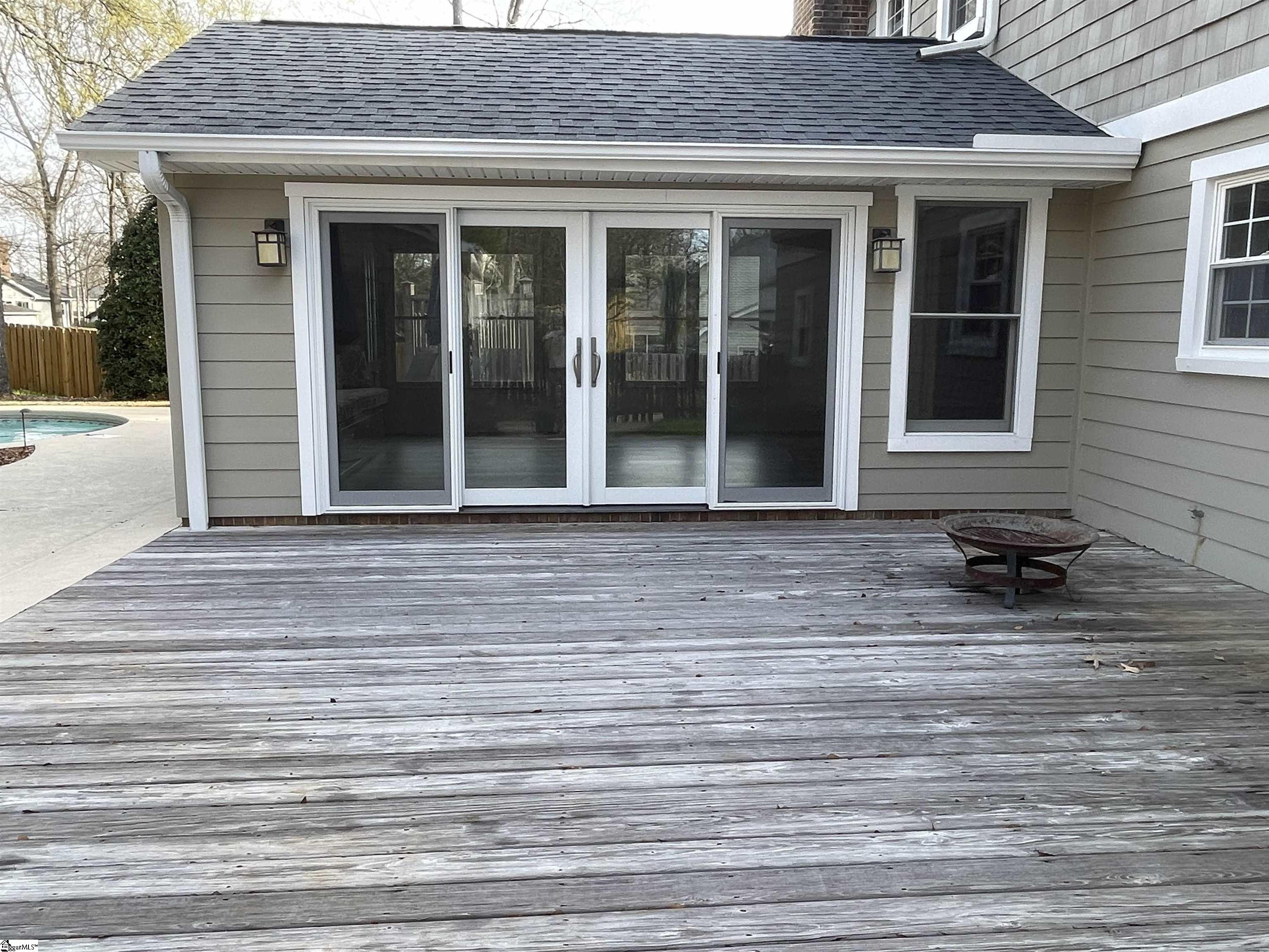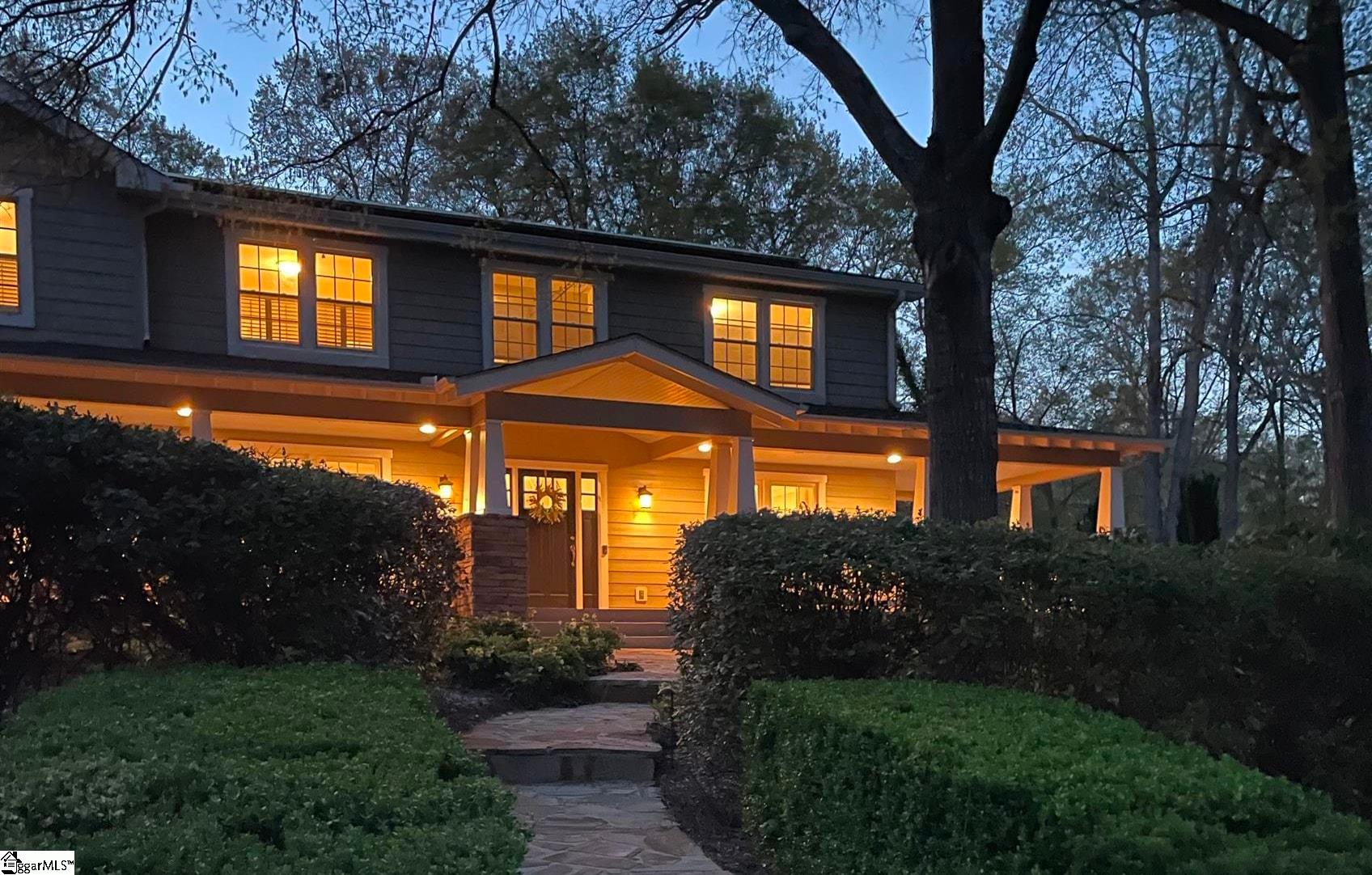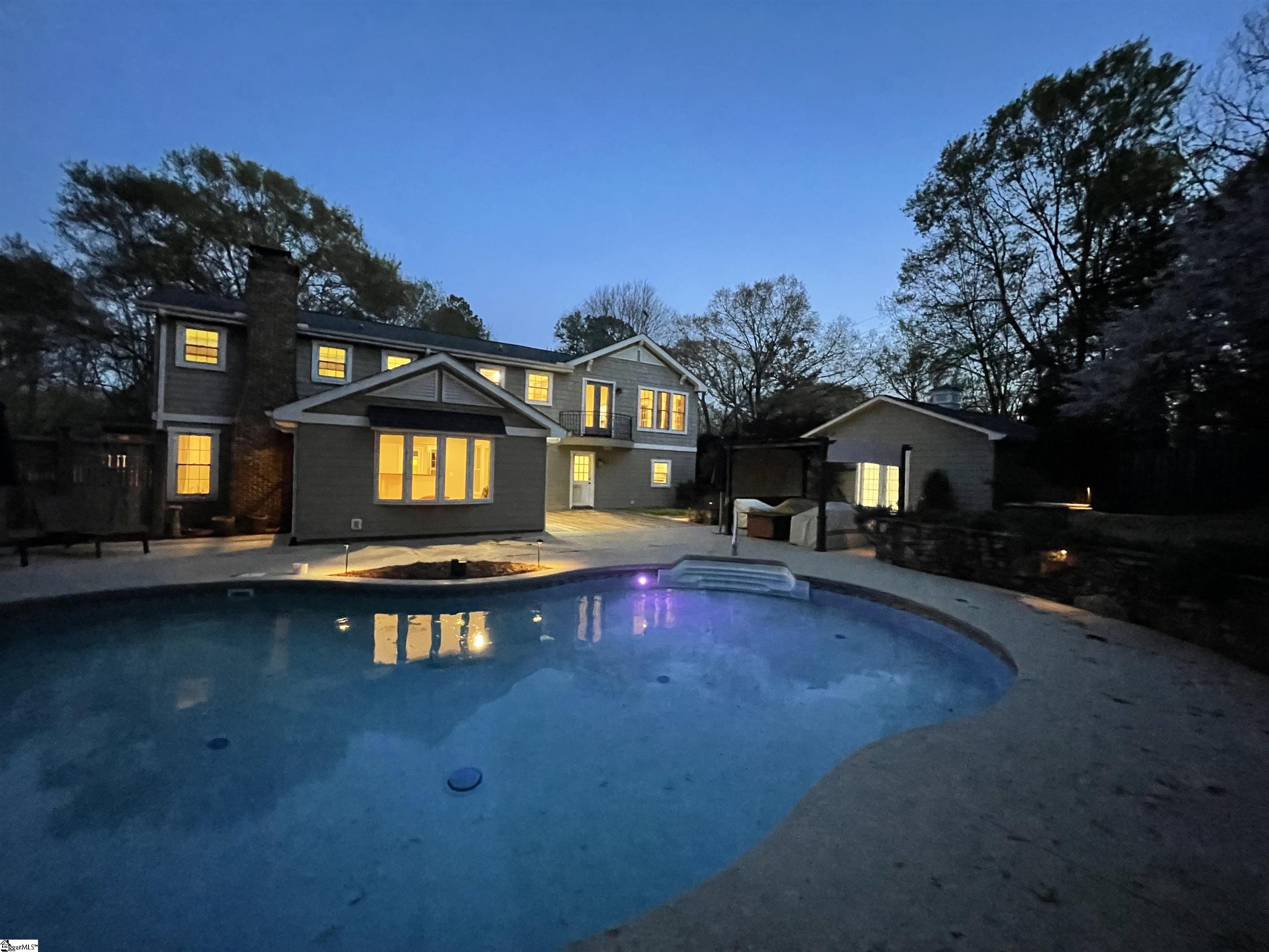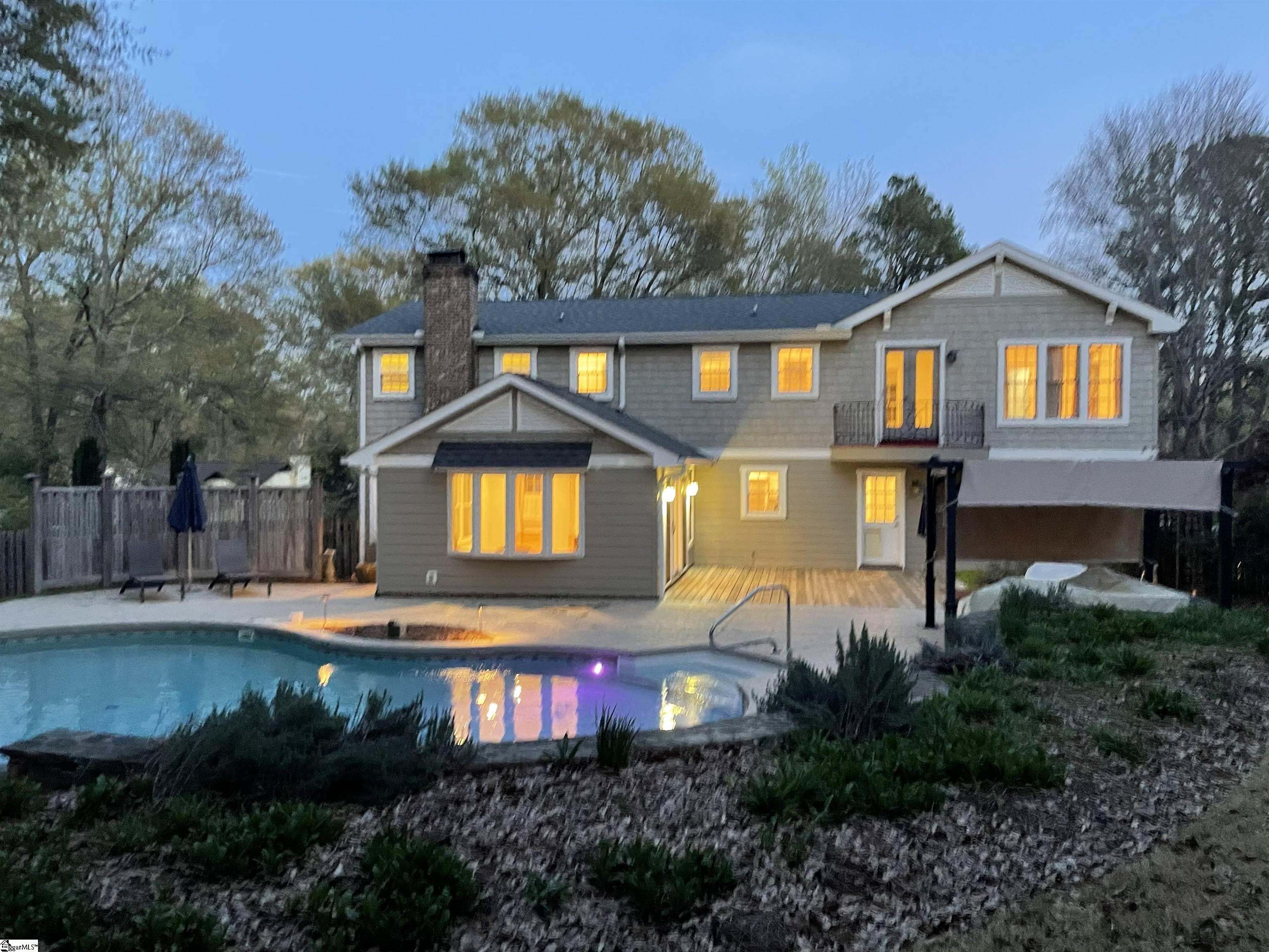 Established Poinsettia Neighborhood in Simpsonville… Day or Night, this stunning 4-bedroom, 3.5-bath Craftsman-style home perfectly captures the essence of modern luxury without the restrictions of an HOA!! From the moment you step onto the wrap-around porch with its classic stone posts and porch swing, you’ll feel right at HOME. The interior boasts an open-concept 27’x14′ living room with rich hardwood floors and a cozy gas fireplace that flows seamlessly into a custom kitchen. The kitchen features granite countertops, a beautiful bar, a built-in wine rack, and appliances, including a gas cooktop, wall oven, and warming drawer. A unique stained-glass pocket door leads to a spacious pantry, and there’s a half bath nearby for guests. The formal dining room has French doors, a custom mirrored wall, and a unique chandelier. Perfect for entertaining, the living room and kitchen extend into a bright four-season sunroom with built-in cabinets, a window seat, a NEW bay window, and NEW sliding doors that open to a true backyard oasis. Here, you’ll find a self-cleaning Saltwater Pool (pool deck was resurfaced in 2025), an expansive 16×19 deck, and a large patio surrounded by mature landscaping, flagstone walkways, and a 6′ privacy fence. Upstairs, the Primary Suite serves as a private retreat, featuring a Juliet balcony overlooking the pool, cathedral ceilings, a custom walk-in closet with a built-in window seat, and a spa-like ensuite bath with a soaking tub and oversized walk-in shower. Three additional spacious bedrooms, two additional full bathrooms, and a dedicated home office provide ample space for family and work. Beyond its beauty, the home is packed with practical upgrades and storage solutions, including a NEW roof (2025), RESURFACED concrete patio surrounding the amazing pool (2025), UPDATED electrical (2025), plantation shutters throughout, a sprinkler system, yard and pool lighting, built-in cabinets in the mud and laundry room, and OWNED solar panels that offer significant monthly savings. For those with hobbies or extra vehicles, the property includes an attached 2-car garage, a detached workshop/garage, and room for RV parking. Located just a short golf cart ride from the vibrant shops, dining, and NEW parks and amenities of downtown Simpsonville, this home offers the perfect balance of peaceful retreat and community connection. Easy access off 385, in addition to the Fairview Road shopping and restaurants!!