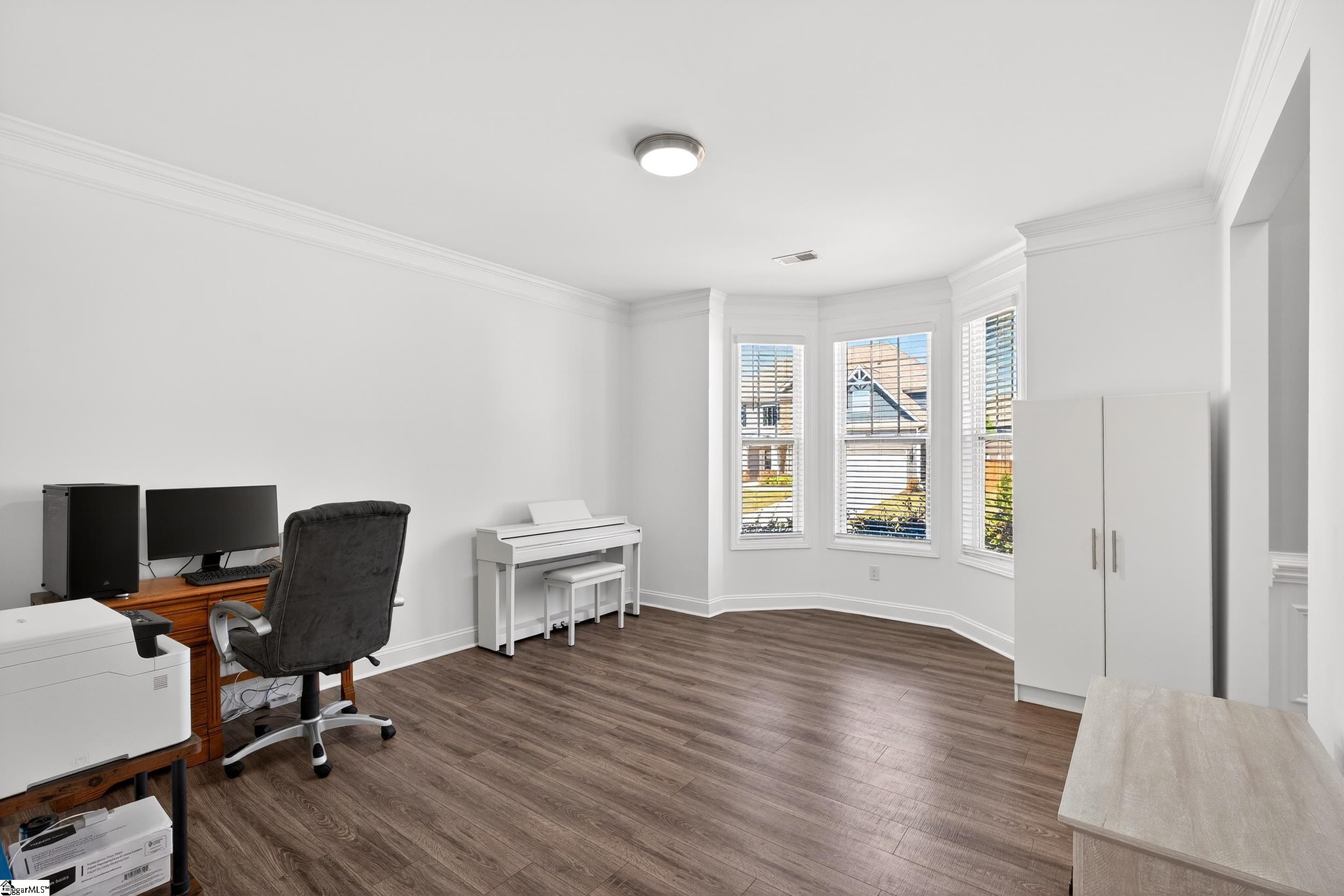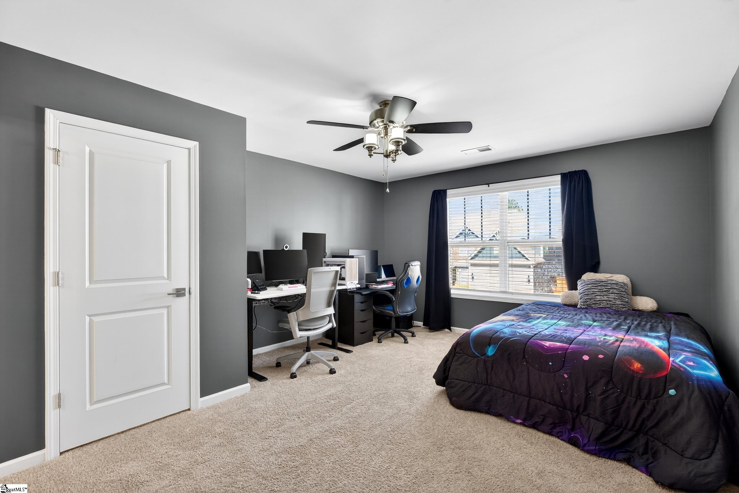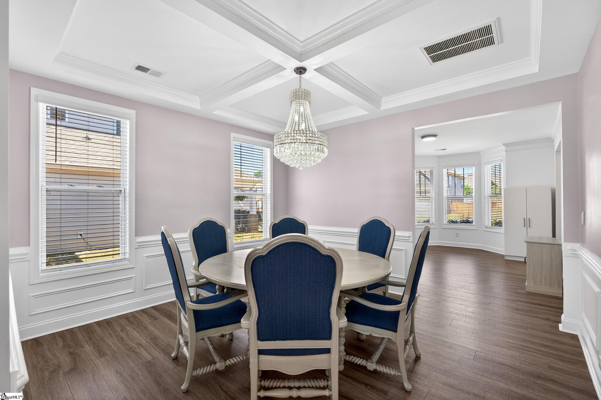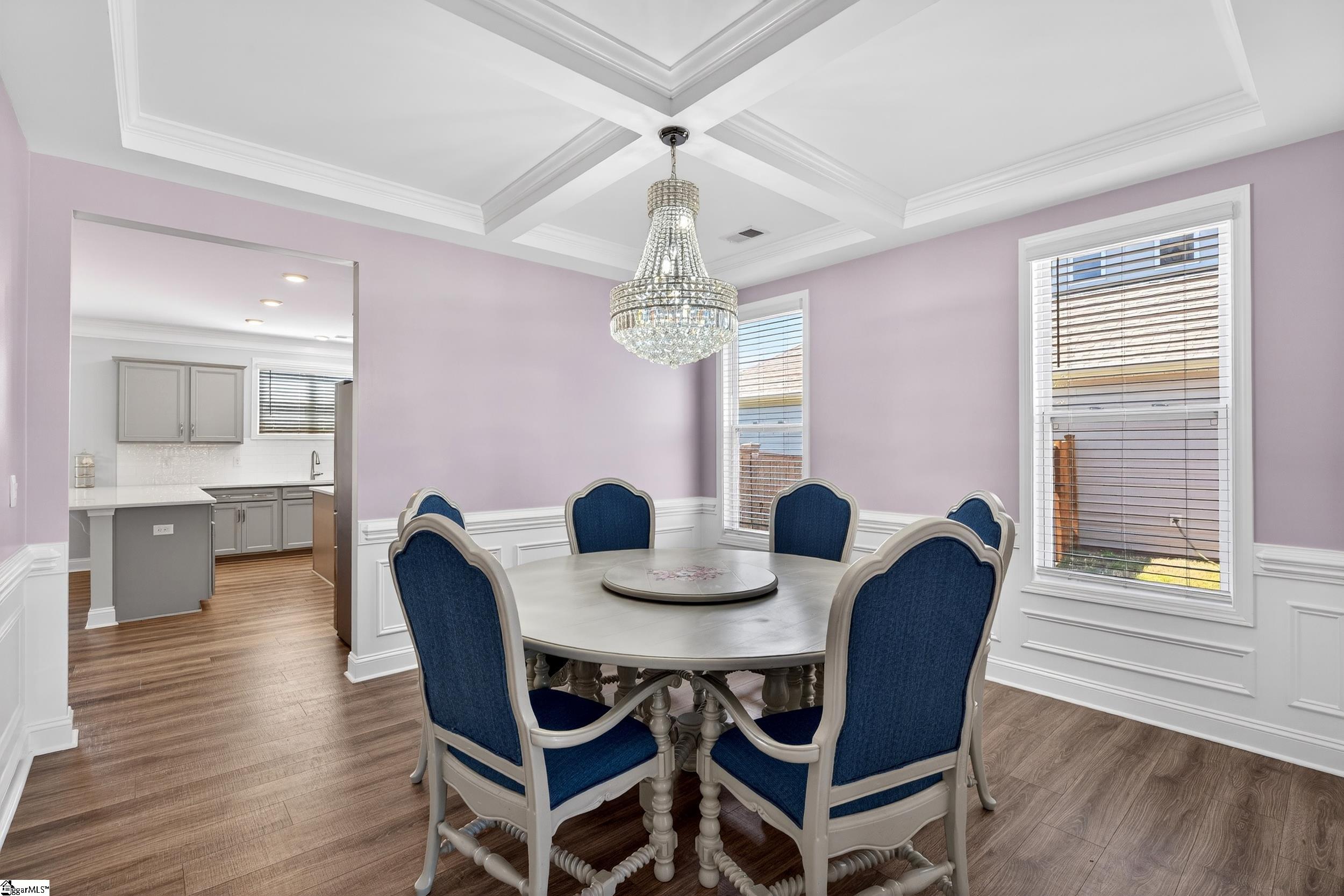 Welcome to 6030 Thicket Lane—where everyday living feels elevated and thoughtfully designed spaces create a home you’ll truly enjoy. From the moment you step inside, the home invites you to settle in. Picture slow mornings in the sunlit breakfast nook, coffee in hand, as natural light pours through the windows and the backyard comes to life. The spacious rear yard, complete with a privacy fence, provides a comfortable setting for outdoor enjoyment, pets, or simply unwinding in your own space. The main level blends function with style. A dedicated home office framed by elegant bowed windows creates a bright, inspiring place to work or relax. Nearby, the formal dining room makes a lasting impression with its coffered ceiling, wainscoting, and chair rail detailing—creating a refined backdrop for gatherings. Throughout the main living areas, durable wide-plank luxury vinyl plank flooring offers both style and everyday durability. At the heart of the home, the open living area features a coffered ceiling and a gas log fireplace with a custom decorative surround—bringing warmth and architectural interest to the space. Thoughtfully integrated into this area is a custom wall safe, offering discreet, built-in security without sacrificing style. The kitchen is designed for both efficiency and functionality, featuring abundant counter space, quartz surfaces, and a layout that flows seamlessly into bar seating—ideal for casual meals or conversation while cooking. A premium Electrolux double oven with a five-burner gas cooktop, built-in microwave, sink, and walk-in pantry complete this well-appointed space. A whole-home water filtration system and tankless water heater add modern convenience, while updated lighting, a statement chandelier, and ceiling fans create a cohesive, polished feel throughout. Upstairs, the layout continues to deliver comfort and privacy. The primary suite is a peaceful retreat, entered through double doors and filled with natural light. The en-suite bath includes a soaking tub, separate shower, and dual vanity, while the expansive walk-in closet provides exceptional storage and organization. Two additional bedrooms share a thoughtfully designed Jack-and-Jill bath with a double vanity, and the fourth bedroom enjoys its own private full bath. A centrally located laundry room and thoughtful upgrades like enhanced closet lighting, accent walls, and HDMI wiring add ease to everyday living. Additional storage has been carefully designed to maximize both space and utility. Beneath the stairs, a finished storage area houses a custom security safe—providing a secure and easily accessible solution for valuables while maintaining a clean, organized look. Step outside and enjoy an extended living space designed for year-round enjoyment. The oversized patio offers both covered and open areas, ideal for everything from shaded afternoons to sunny weekends. An extended driveway pad provides additional flexibility for parking or recreation. Set within the Pine Valley community in Boiling Springs, residents enjoy access to shared amenities including a covered gathering area with picnic tables, playgrounds, a community pool, and pickleball courts—creating opportunities to connect and enjoy the neighborhood. With its blend of refined finishes, smart design, and distinctive features like integrated security elements and thoughtful storage solutions, 6030 Thicket Lane stands apart as a home that balances comfort, style, and everyday functionality.