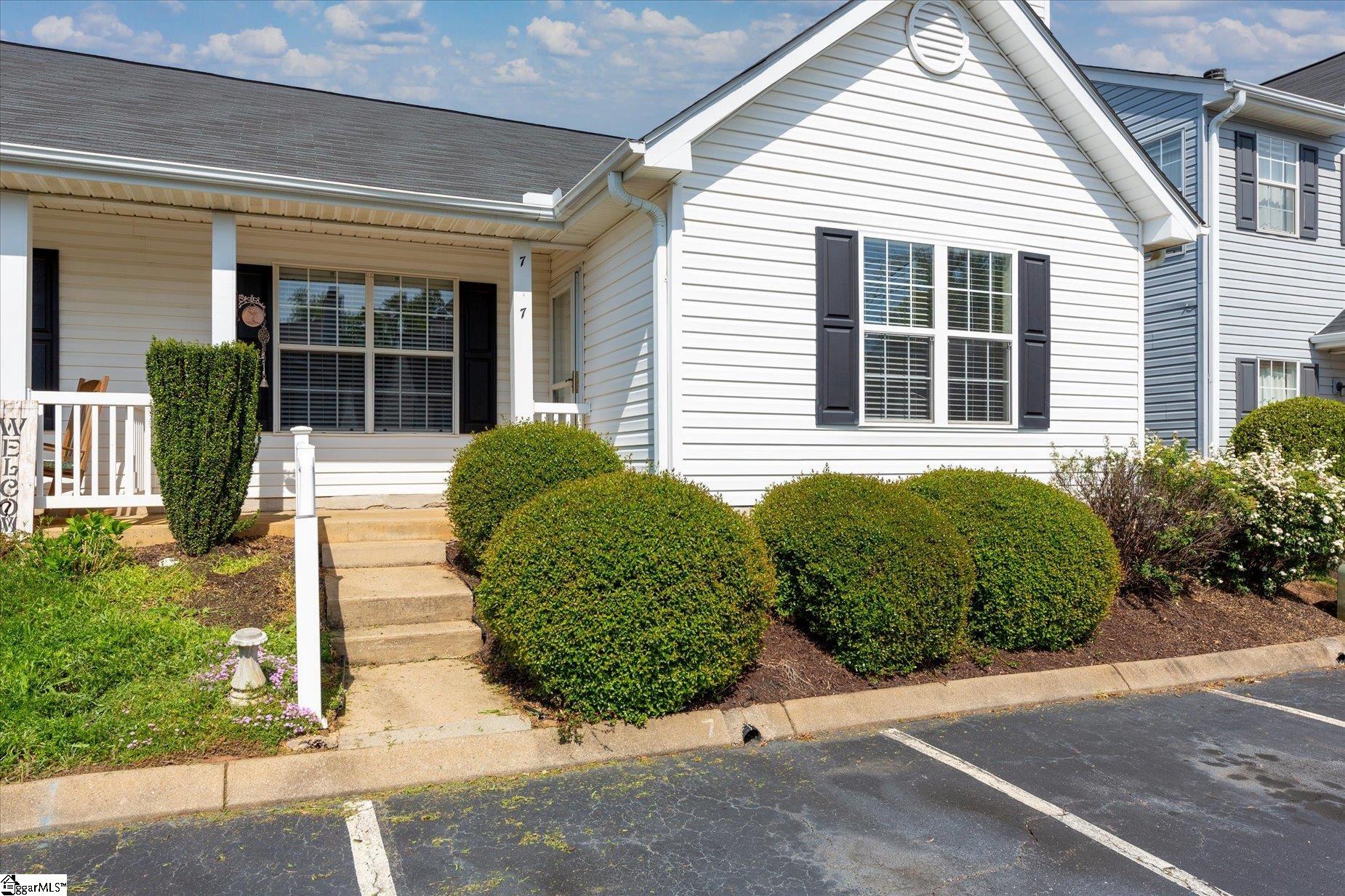 Welcome to 7 Hammett Grove Ln, an exceptionally well-located, single-story townhome in the heart of Hammett Farms, where convenience and simplicity come together. This thoughtfully designed 2-bedroom, 2-bath home features a highly functional layout with dual ensuite bedrooms, offering ideal flexibility for guests, roommates, or private work-from-home setups. The single-level living makes everyday life easy, whether you’re looking to downsize without compromise or purchase your first home in a prime location. The living spaces flow seamlessly, leading to a screened-in back porch, perfect for enjoying your morning coffee or unwinding in the evenings with a bit of privacy and fresh air. Positioned just minutes (and even walking distance) from Riverside High School, this home also places you right in the middle of one of the Upstate’s most convenient corridors. From Lowe’s Foods and local coffee spots to restaurants, shopping, and quick access to major thoroughfares, everything you need is right at your fingertips. Additional highlights include two dedicated parking spaces and low-maintenance living in an established community. Whether you’re seeking easy, single-level living or an opportunity to get into a strong and established area of the Upstate, this home delivers both value and location.