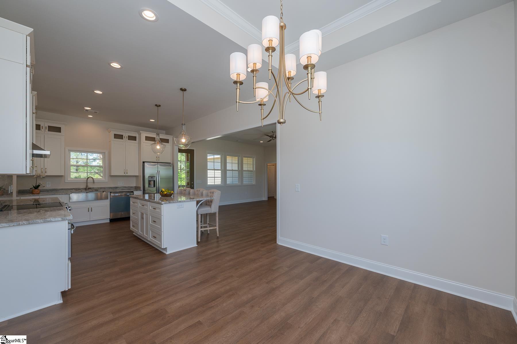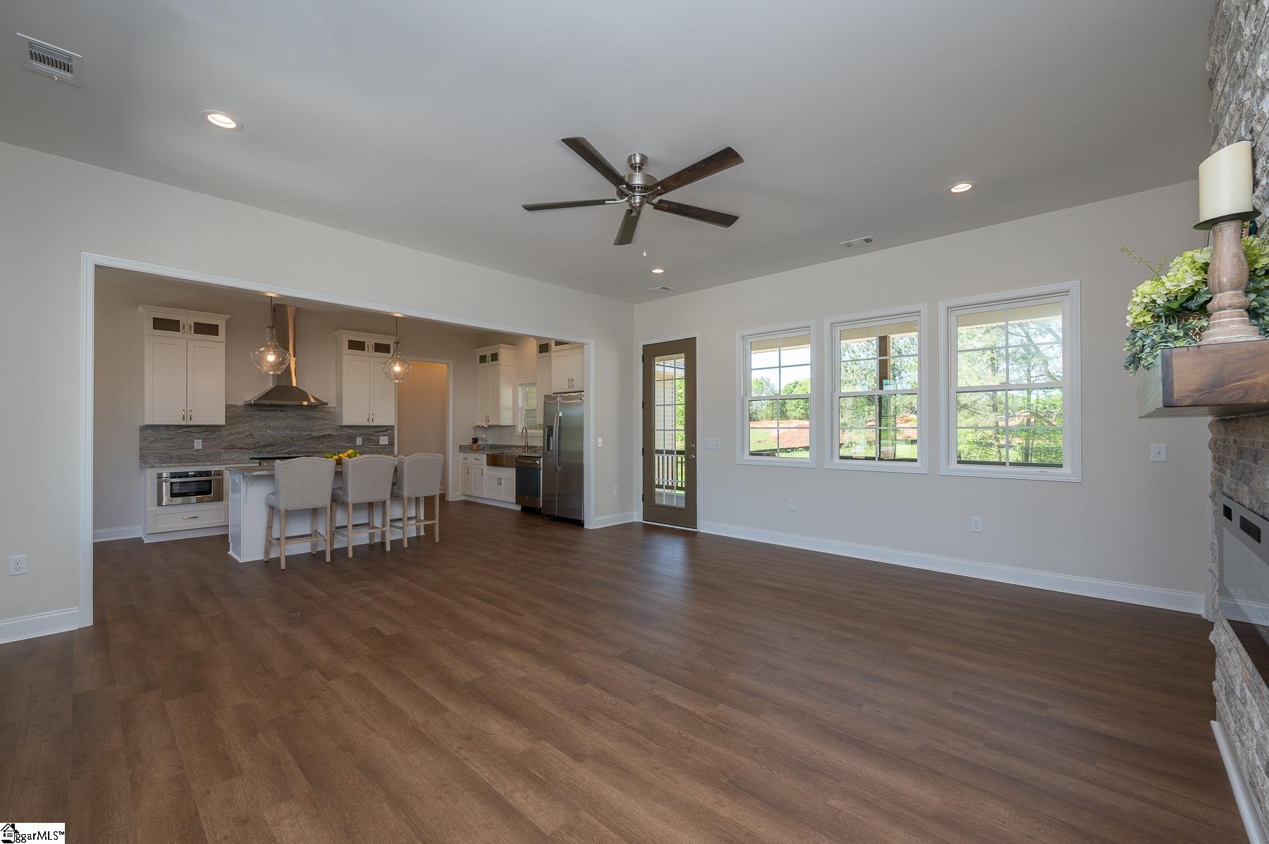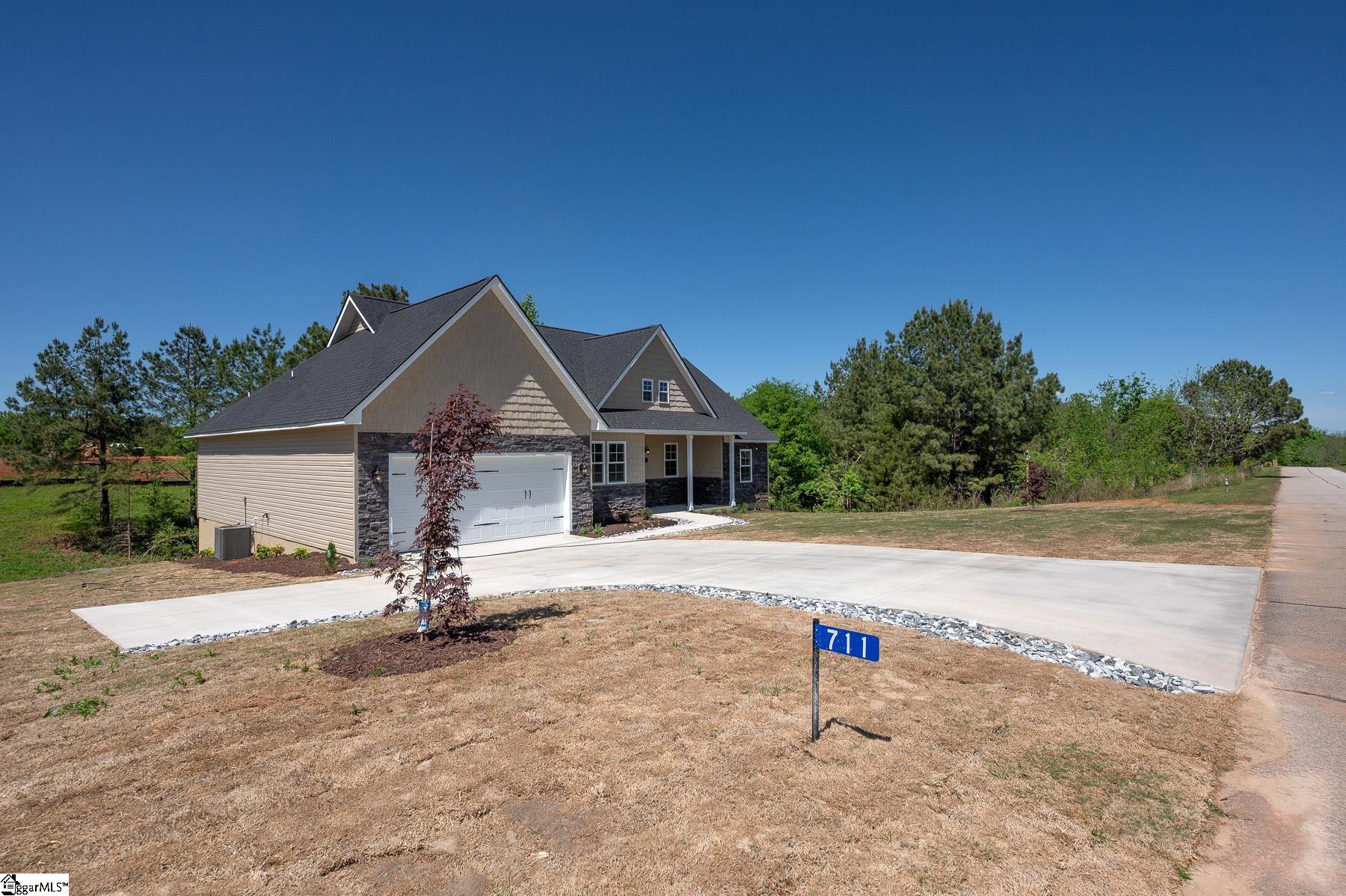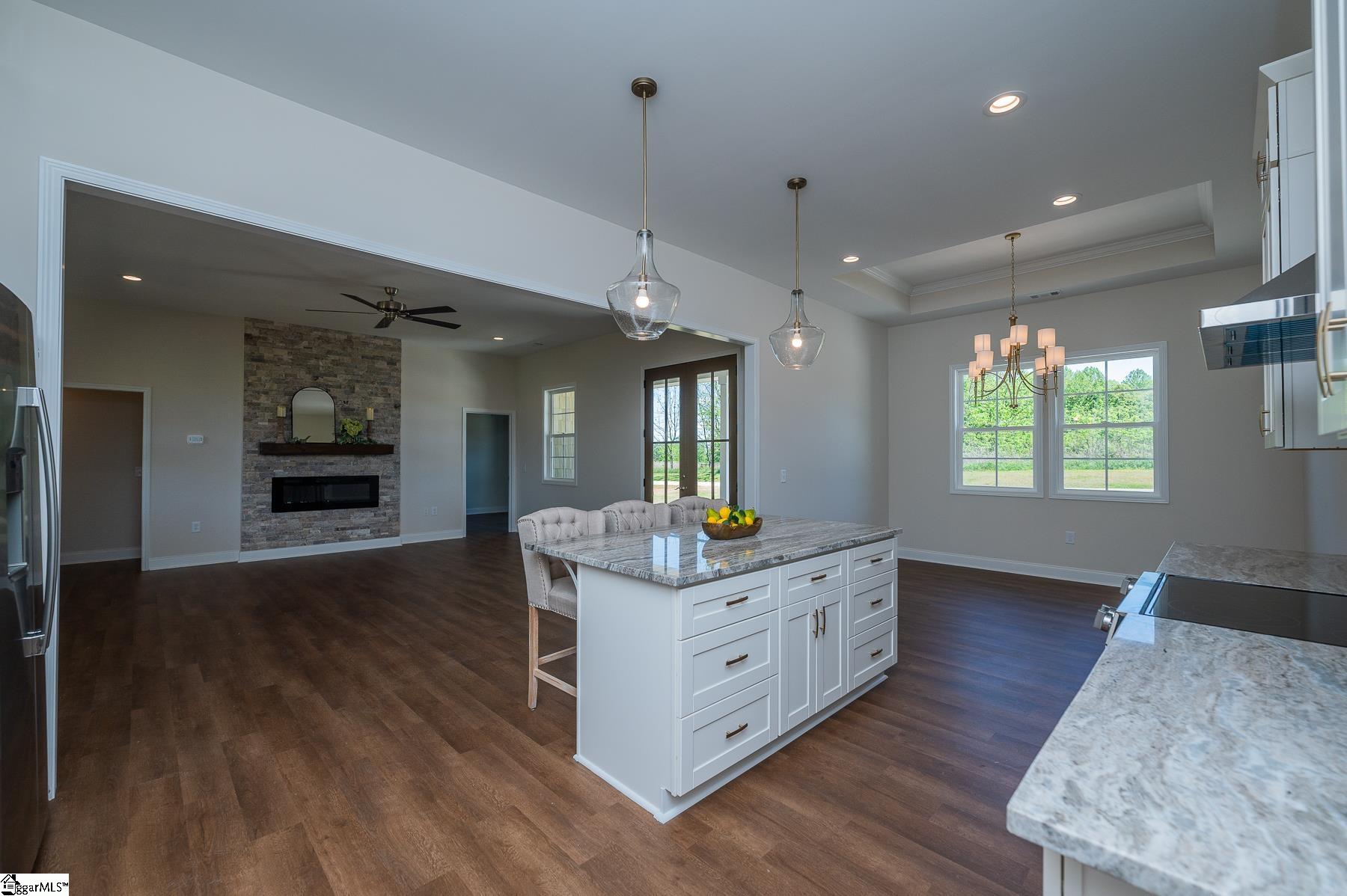 Custom New Construction with High-End Finishes & Exceptional Detail This beautifully built 3-bedroom, 2-bath home offers a perfect blend of craftsmanship, style, and functionality. Featuring 10-foot ceilings throughout the home, the layout feels open, spacious, and filled with natural light. The open-concept living area showcases a stone fireplace and flows seamlessly into the designer kitchen, complete with granite countertops, custom cabinetry, stainless steel appliances, a large island, and custom light fixtures—ideal for both everyday living and entertaining. A separate office with a board and batten accent wall provides a dedicated and stylish workspace. The primary suite is a true retreat, offering a spa-like bath with a tile walk-in shower, soaking tub, double vanity with granite tops, and a spacious walk-in closet. Granite countertops are featured throughout the home for a cohesive, high-end finish. Additional features include: Luxury vinyl plank flooring throughout main living areas Laundry room with utility sink Split bedroom floor plan for added privacy Quality craftsmanship and upgraded finishes throughout The 2-car garage is oversized with 11-foot ceilings and an 8-foot tall door opening, perfect for larger vehicles or additional storage. Exterior highlights include attractive stone work on the front elevation, enhancing curb appeal, and a covered back porch with ceiling fans, ideal for relaxing or entertaining while enjoying the private, scenic setting. This home delivers modern finishes, thoughtful design, and lasting value—move-in ready.
