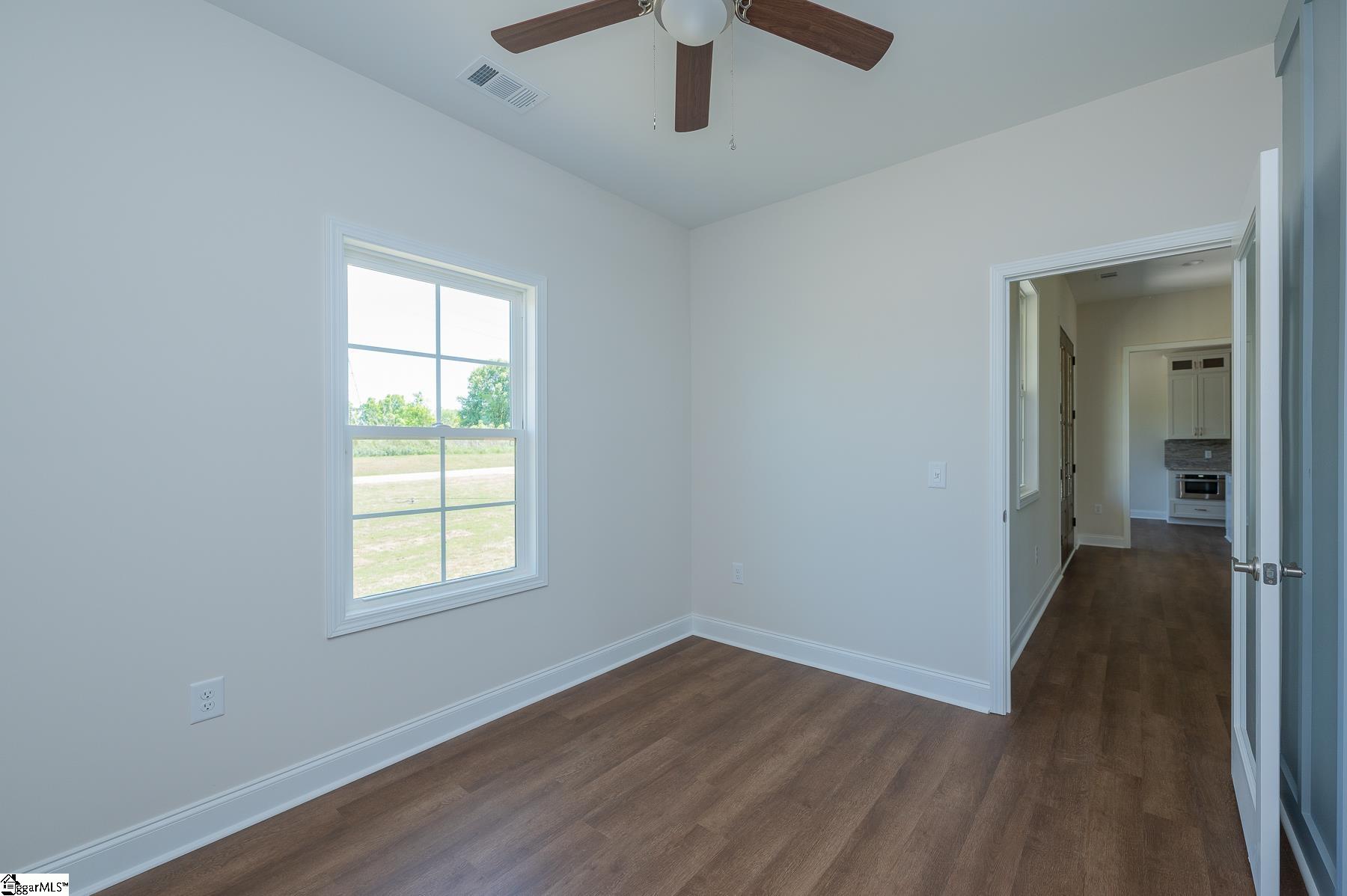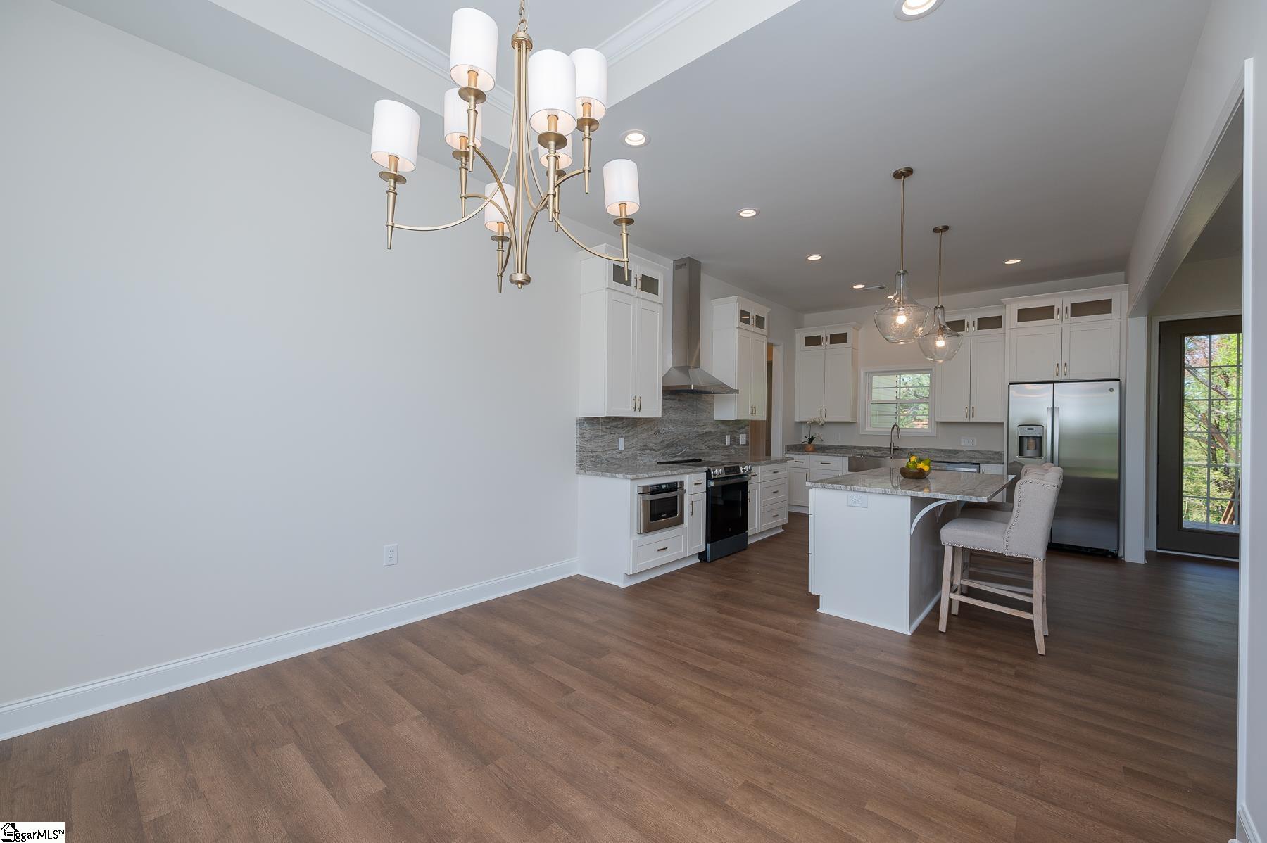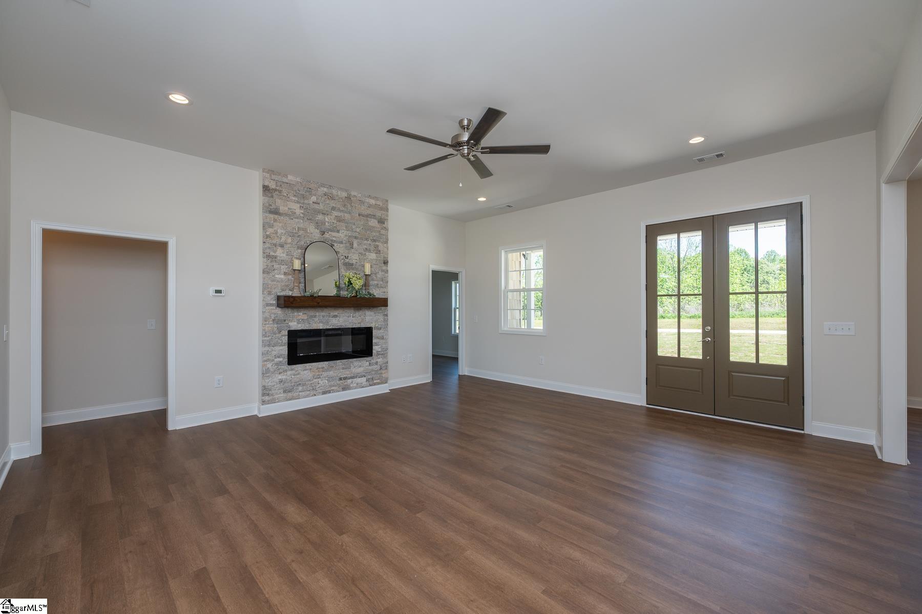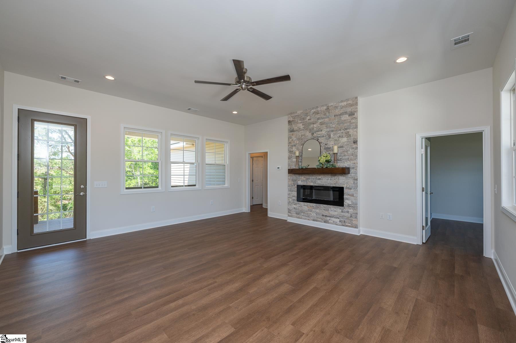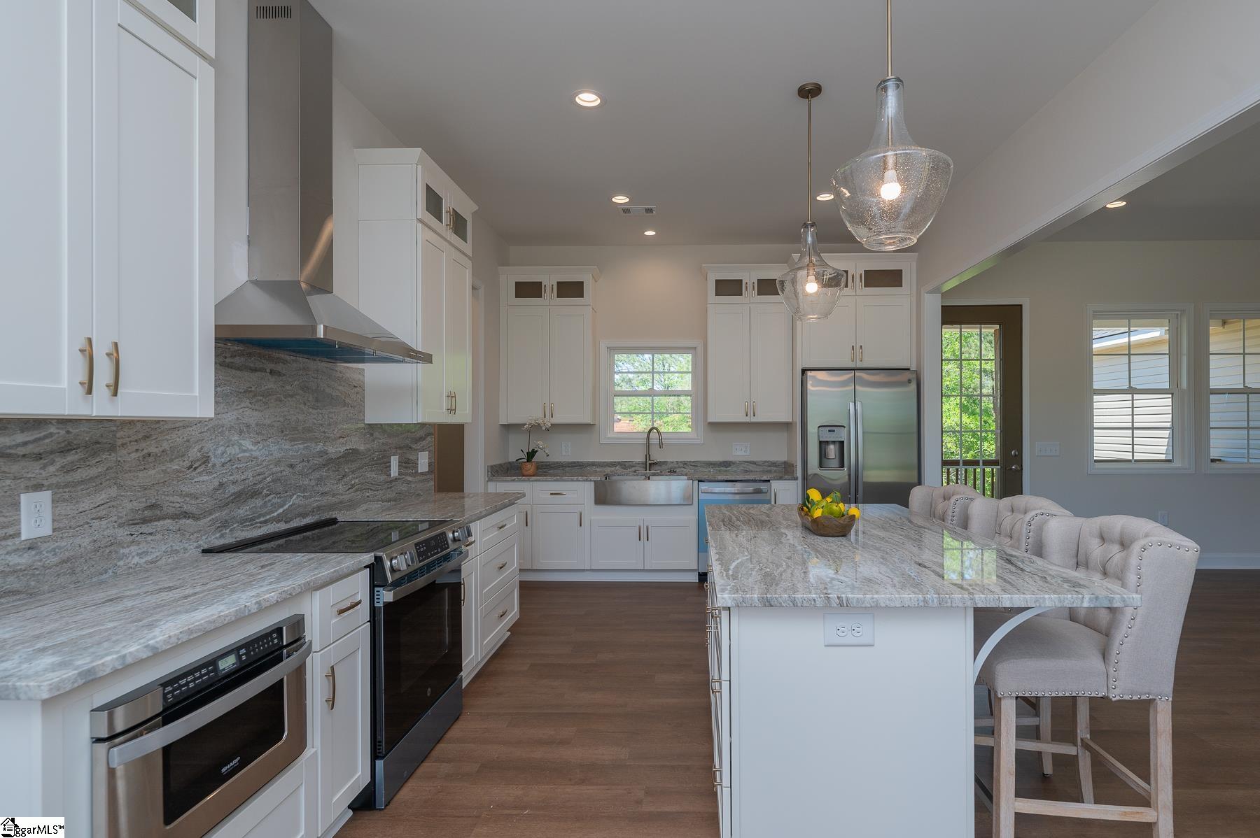 Custom New Construction with High-End Finishes & Exceptional Detail This beautifully built 3-bedroom, 2-bath home offers a perfect blend of craftsmanship, style, and functionality. Featuring 10-foot ceilings throughout the home, the layout feels open, spacious, and filled with natural light. The open-concept living area showcases a stone fireplace and flows seamlessly into the designer kitchen, complete with granite countertops, custom cabinetry, stainless steel appliances, a large island, and custom light fixtures—ideal for both everyday living and entertaining. A separate office with a board and batten accent wall provides a dedicated and stylish workspace. The primary suite is a true retreat, offering a spa-like bath with a tile walk-in shower, soaking tub, double vanity with granite tops, and a spacious walk-in closet. Granite countertops are featured throughout the home for a cohesive, high-end finish. Additional features include: Luxury vinyl plank flooring throughout main living areas Laundry room with utility sink Split bedroom floor plan for added privacy Quality craftsmanship and upgraded finishes throughout The 2-car garage is oversized with 11-foot ceilings and an 8-foot tall door opening, perfect for larger vehicles or additional storage. Exterior highlights include attractive stone work on the front elevation, enhancing curb appeal, and a covered back porch with ceiling fans, ideal for relaxing or entertaining while enjoying the private, scenic setting. This home delivers modern finishes, thoughtful design, and lasting value—move-in ready.
