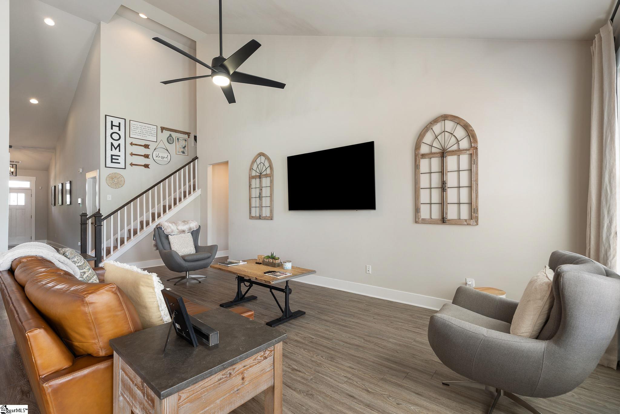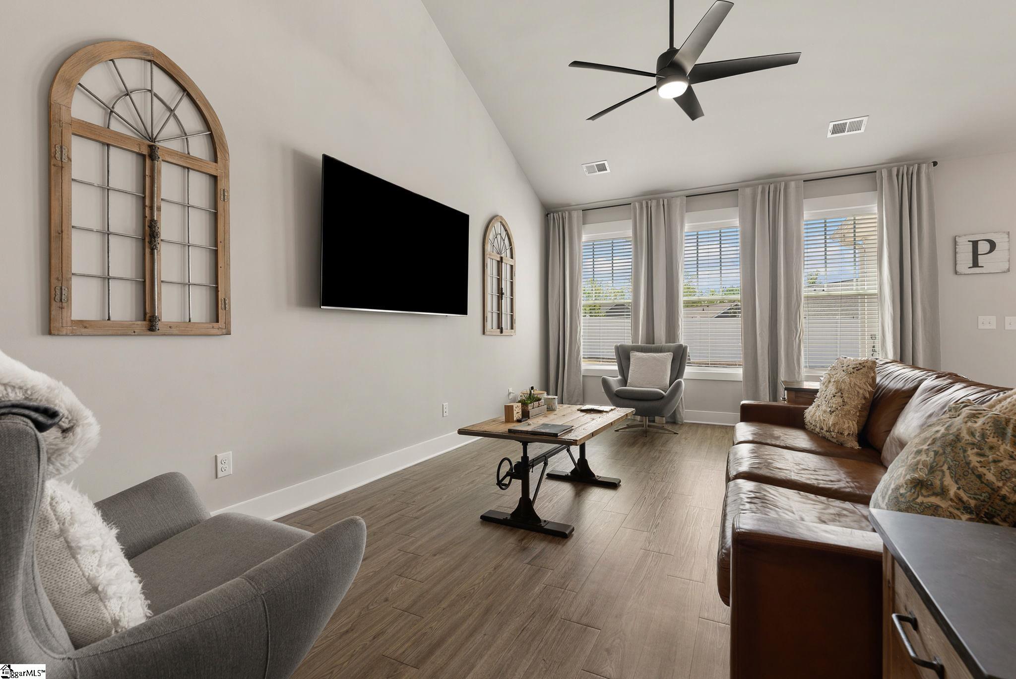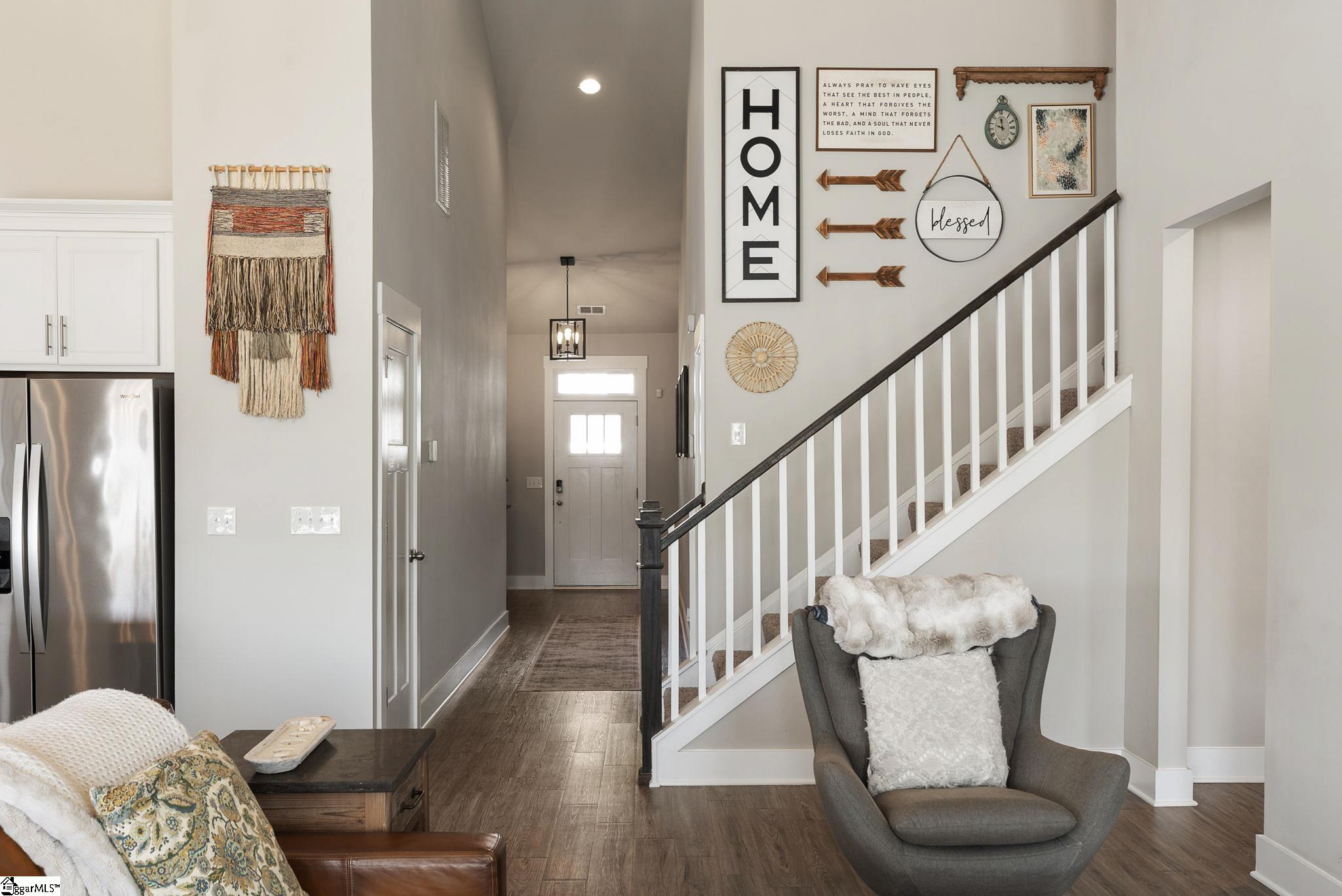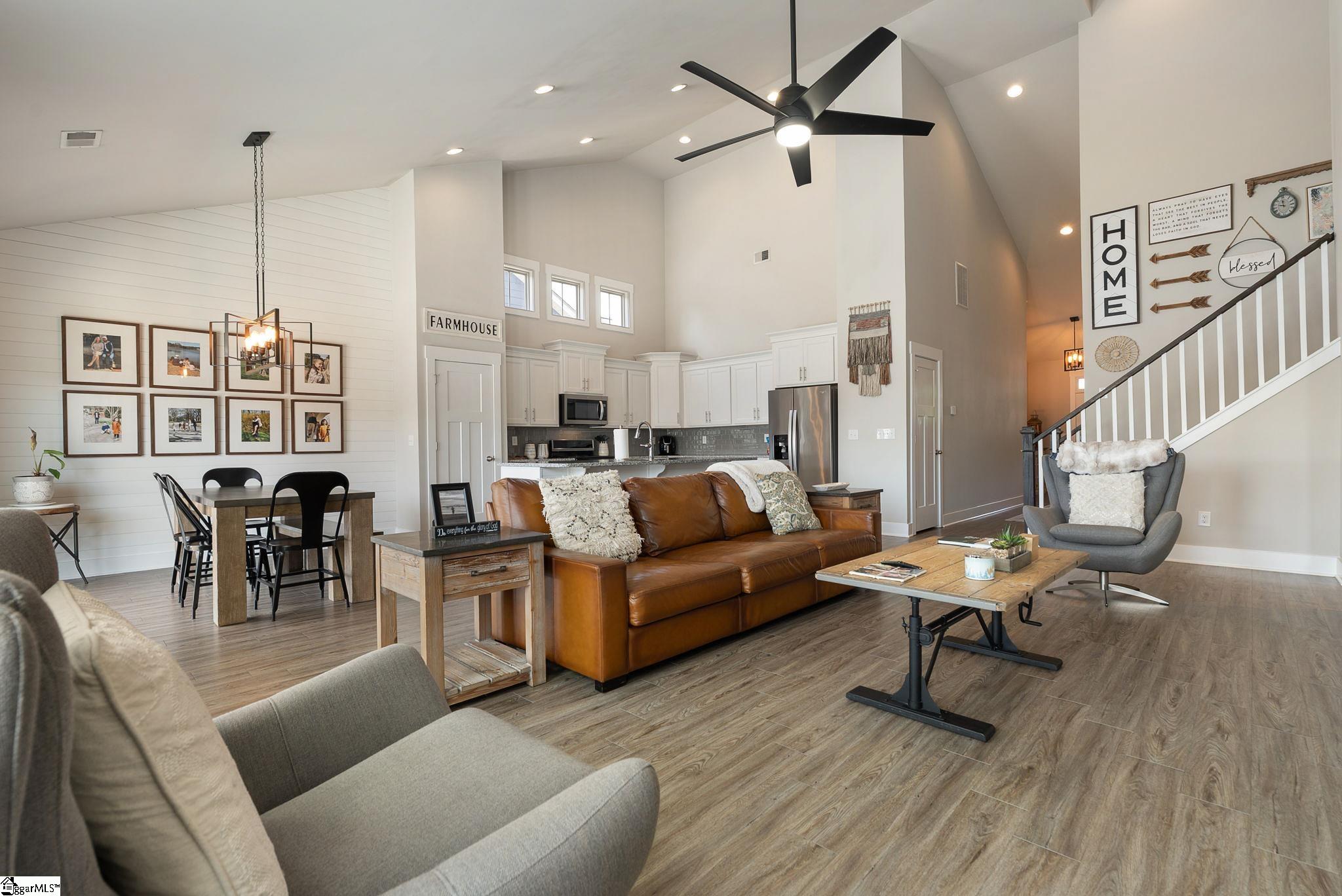 Welcome to 809 Lockhurst Dr., a stunning residence nestled in the desirable Coventry subdivision of Simpsonville. This beautiful four-bedroom, two-bathroom home perfectly blends modern elegance with everyday functionality. Inside, the open floor plan is defined by high vaulted ceilings and abundant natural light, creating an airy, spacious atmosphere. The heart of the home is the gourmet kitchen, which boasts a large central island, granite countertops, sleek stainless steel appliances, and plentiful cabinetry for all your storage needs. The thoughtful layout places the primary suite on the main floor alongside two additional bedrooms, ensuring ease of access and privacy. The primary suite offers a convenient main-level retreat, highlighted by an ensuite bathroom that features a double vanity, a large-format tile shower, and a generous walk-in closet. For added convenience, a dedicated walk-in laundry room and a two-car garage—perfect for extra storage—are also located on the main level. Upstairs, a versatile loft serves as a flexible space that can easily function as a fourth bedroom or a dynamic bonus room. Outdoor living is truly elevated here; a glass slider off the kitchen leads to a private oasis featuring a large fenced backyard, a covered patio, and an outdoor firepit. As a special bonus, the hot tub conveys with the home, offering the ultimate spot for relaxation. Residents also enjoy access to the community pool and a location that puts you moments away from the vibrant energy of Main Street Simpsonville, where local favorites like Sidewall Pizza, Houni’s Italian Ice, and boutique shops await.