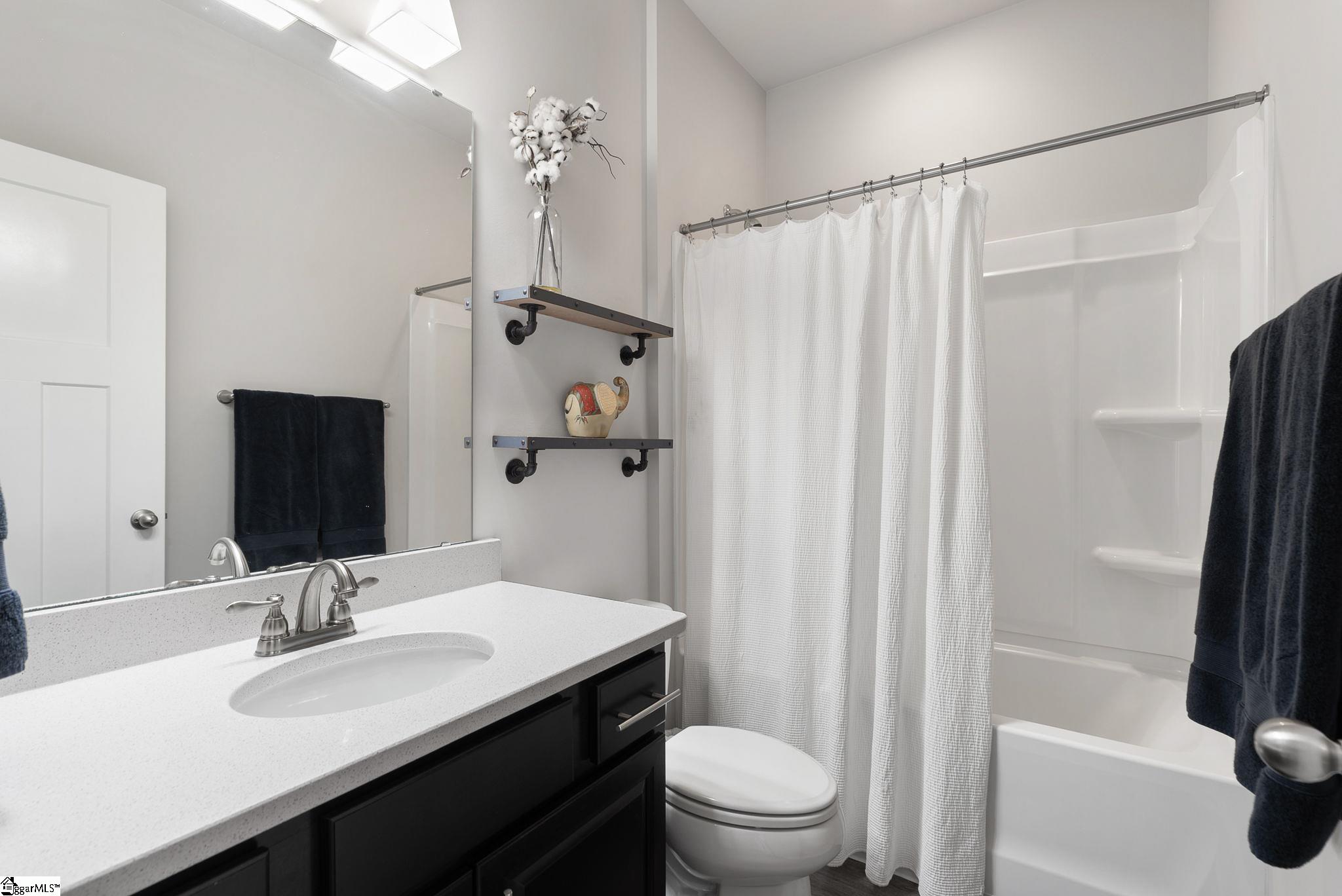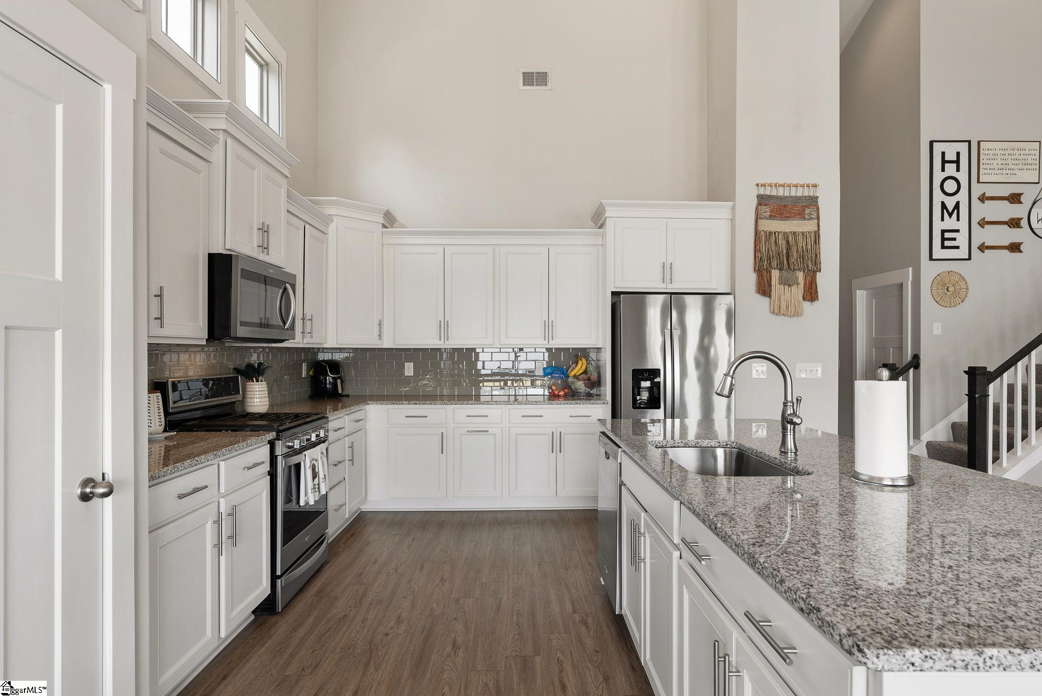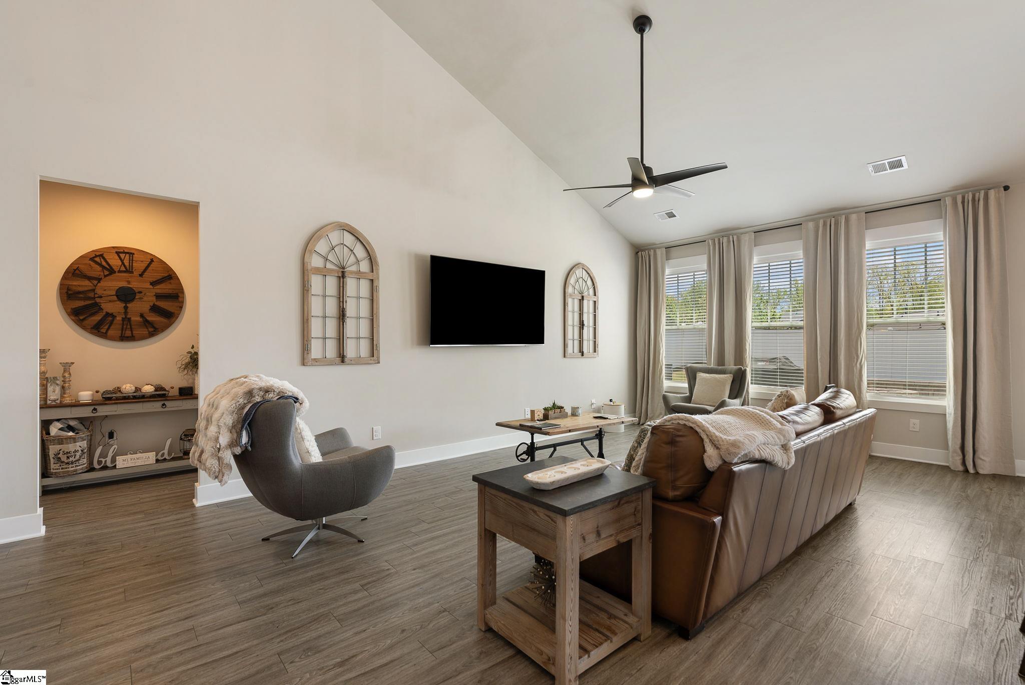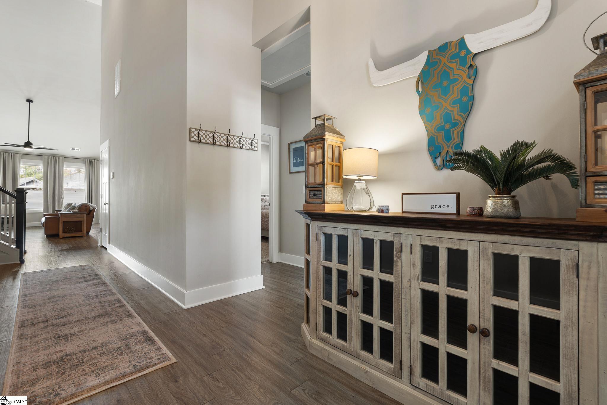 Welcome to 809 Lockhurst Dr., a stunning residence nestled in the desirable Coventry subdivision of Simpsonville. This beautiful four-bedroom, two-bathroom home perfectly blends modern elegance with everyday functionality. Inside, the open floor plan is defined by high vaulted ceilings and abundant natural light, creating an airy, spacious atmosphere. The heart of the home is the gourmet kitchen, which boasts a large central island, granite countertops, sleek stainless steel appliances, and plentiful cabinetry for all your storage needs. The thoughtful layout places the primary suite on the main floor alongside two additional bedrooms, ensuring ease of access and privacy. The primary suite offers a convenient main-level retreat, highlighted by an ensuite bathroom that features a double vanity, a large-format tile shower, and a generous walk-in closet. For added convenience, a dedicated walk-in laundry room and a two-car garage—perfect for extra storage—are also located on the main level. Upstairs, a versatile loft serves as a flexible space that can easily function as a fourth bedroom or a dynamic bonus room. Outdoor living is truly elevated here; a glass slider off the kitchen leads to a private oasis featuring a large fenced backyard, a covered patio, and an outdoor firepit. As a special bonus, the hot tub conveys with the home, offering the ultimate spot for relaxation. Residents also enjoy access to the community pool and a location that puts you moments away from the vibrant energy of Main Street Simpsonville, where local favorites like Sidewall Pizza, Houni’s Italian Ice, and boutique shops await.