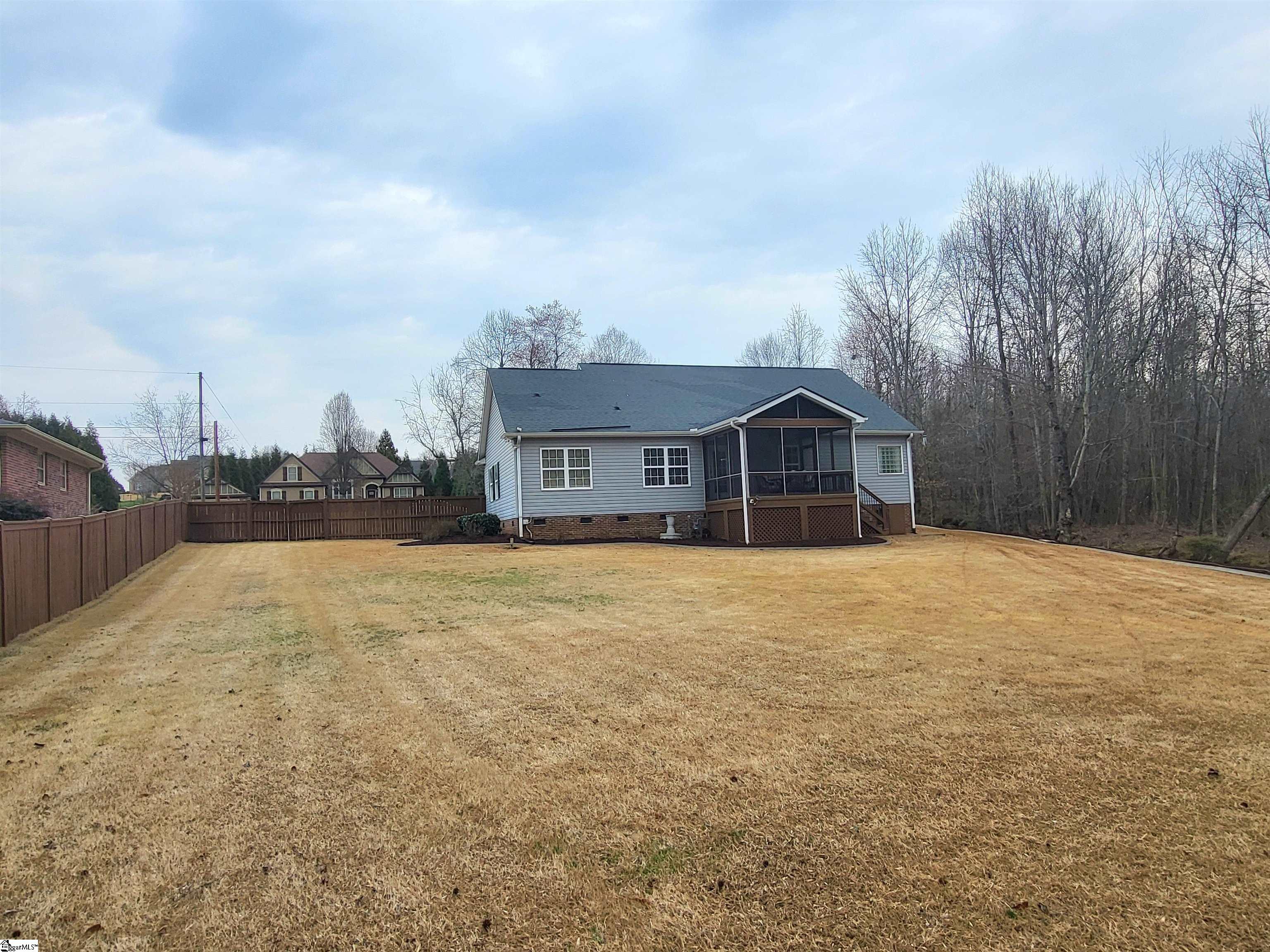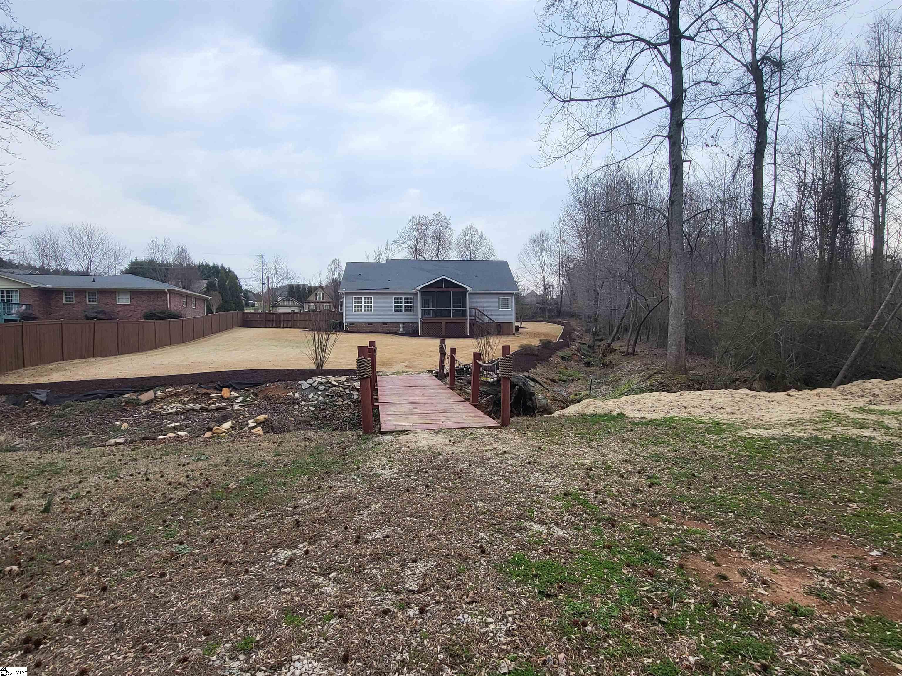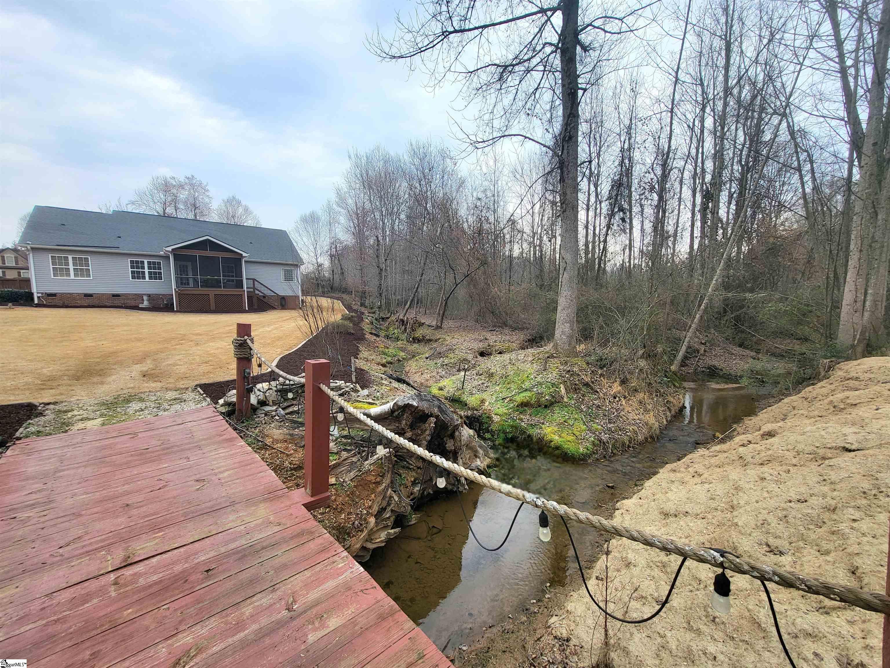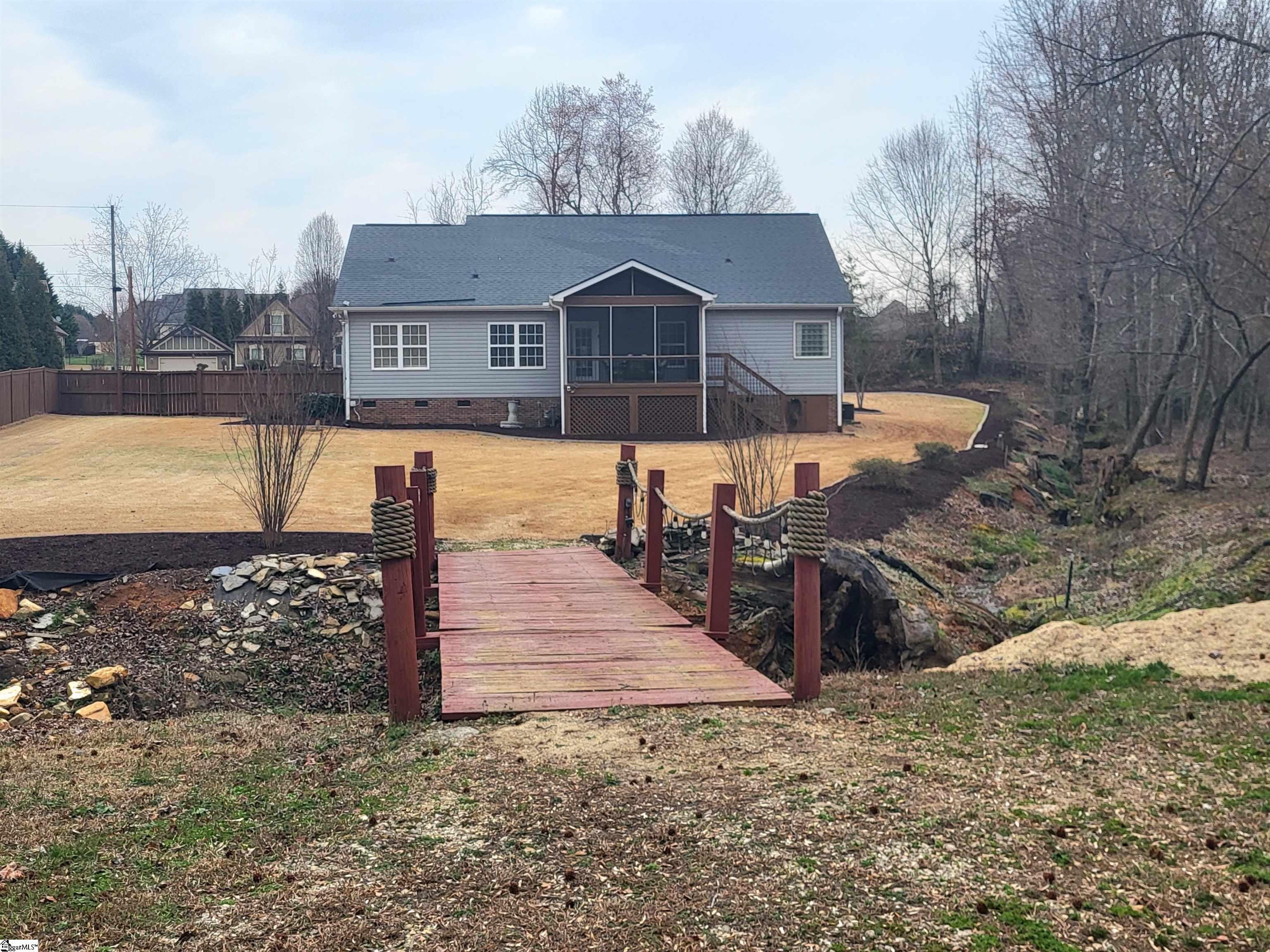 This is a fantastic home with so much to offer! Situated on .67 acre with a lovely, flowing creek and bridge to the rear of the property and has a shed for extra storage. The bridge can support mowers, golf carts and ATVs. The lawn has a full sprinkler system in the front and back! You’ll love the natural surroundings and woods bordering the home. The interior offers beautiful floors throughout, a split and open floor plan, solid countertops, stainless appliances, vaulted and trey ceilings, a gas fireplace, an awesome screened porch overlooking the backyard, a great primary suite with a super huge walk-in closet, a walk-in tiled shower and a pretty claw-foot tub. Well-maintained and one sweet home! Just outside the city of Greer and conveniently located! This home will not last on the open market so act fast!