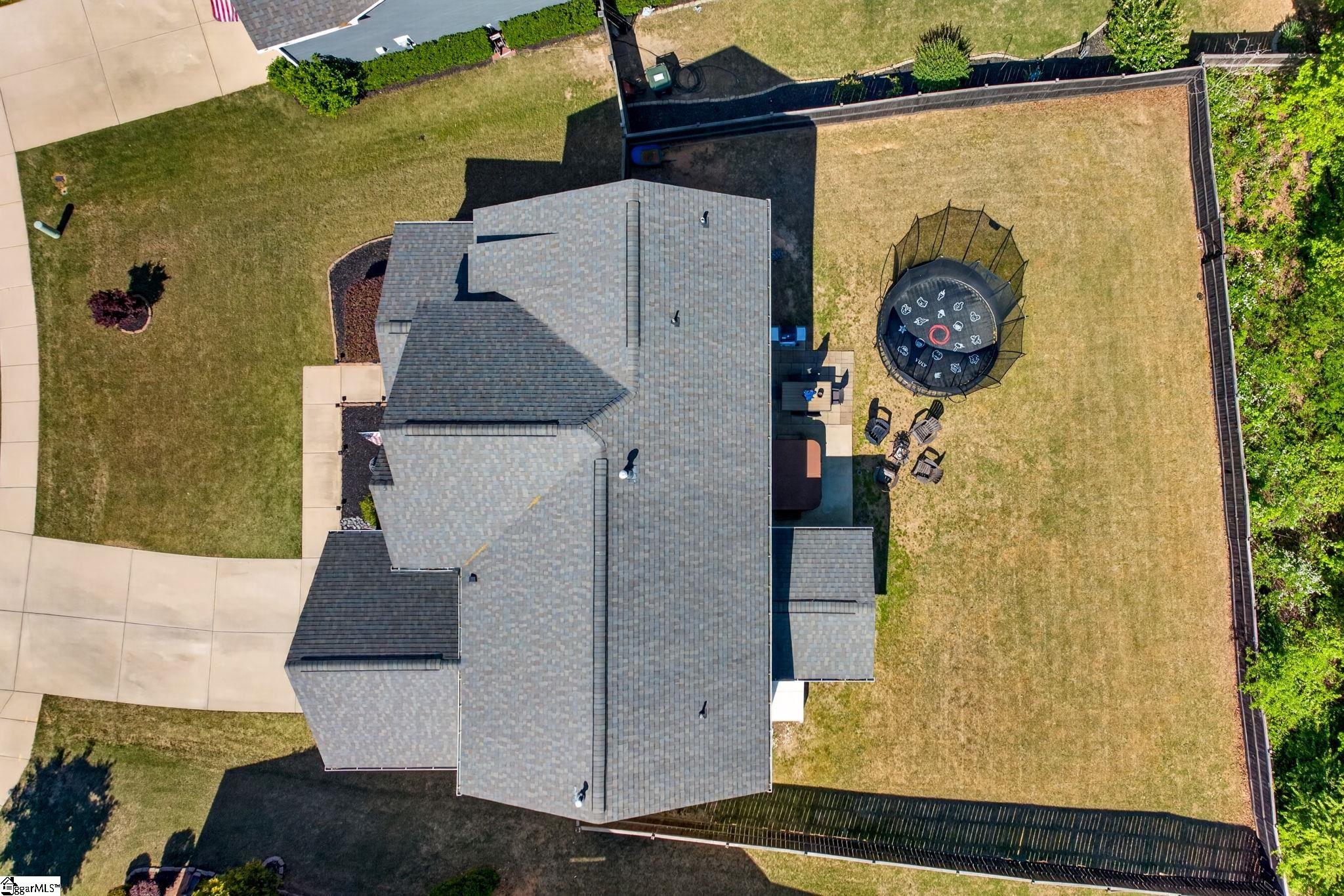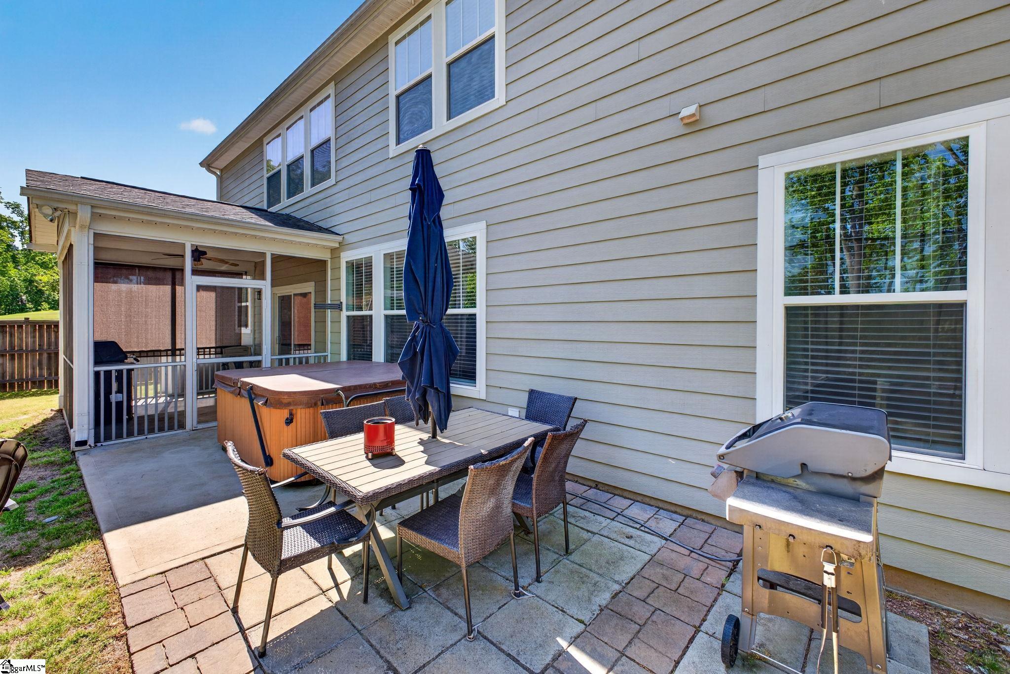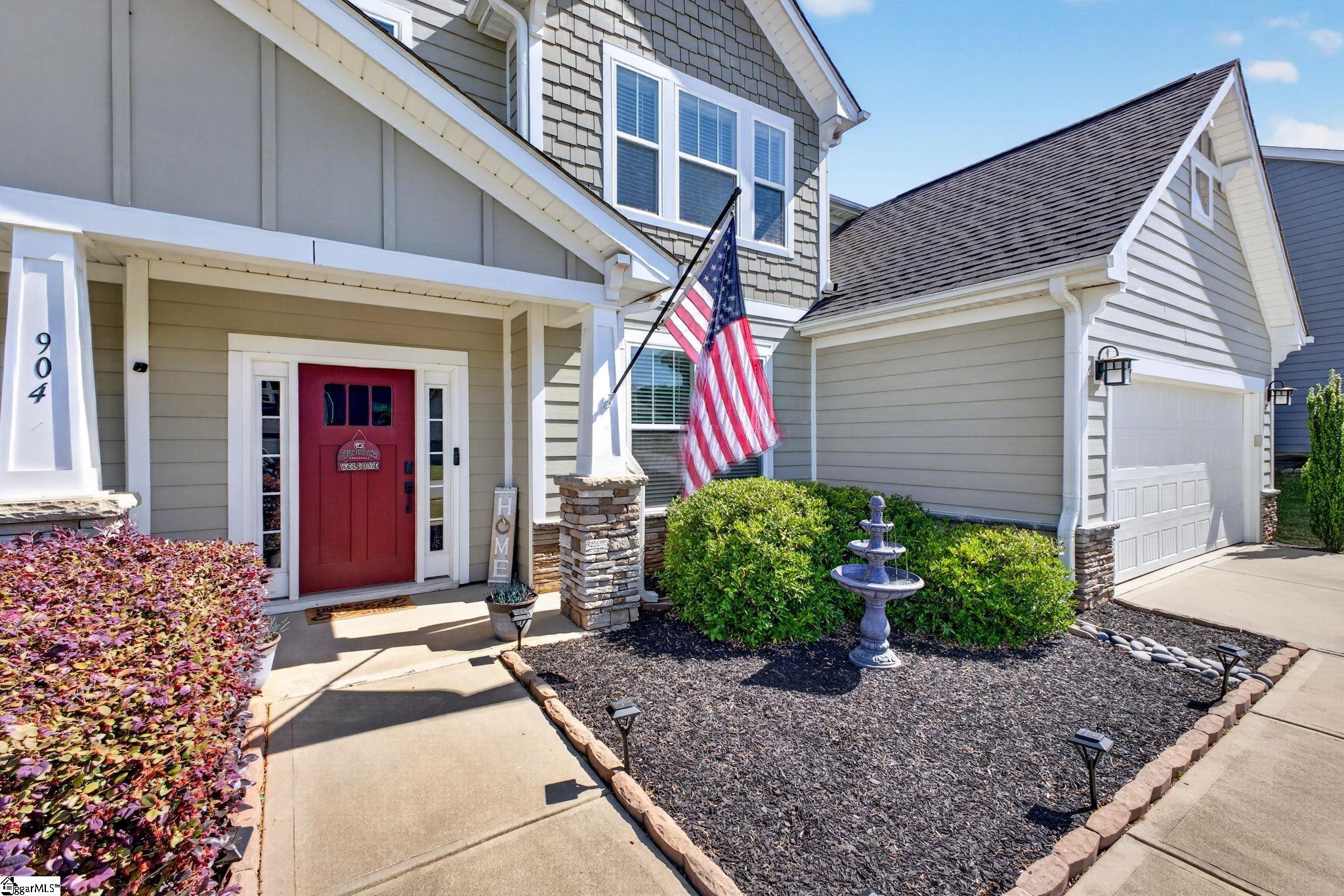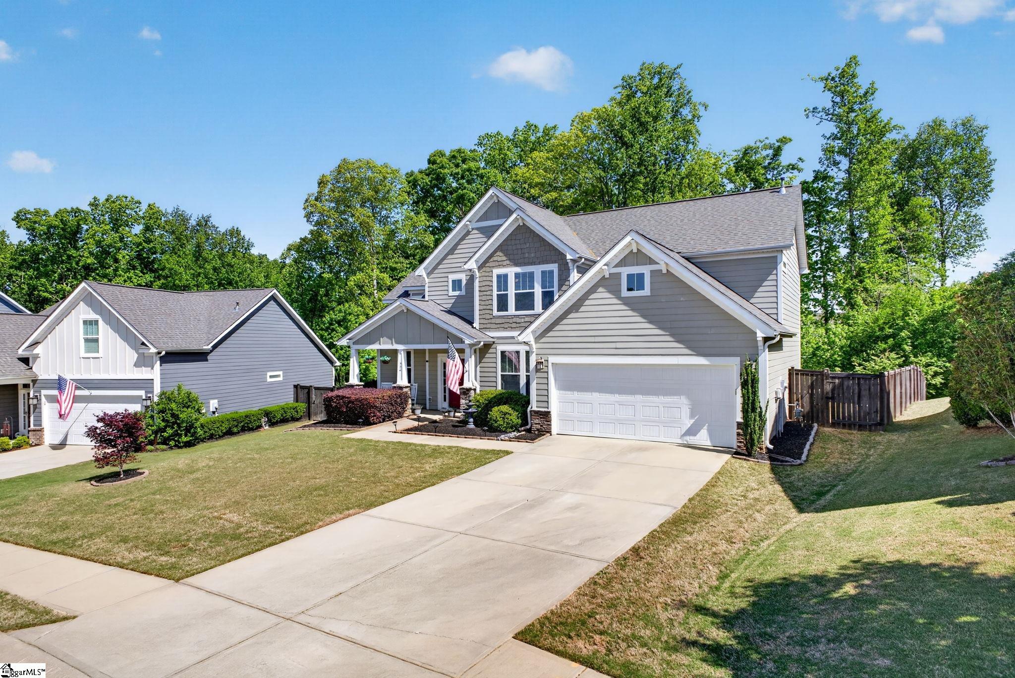 Located in the charming Coventry community just two miles from downtown Simpsonville, this beautiful craftsman-style home offers over 2,600 square feet of modern living space on nearly a half-acre lot. This property features a striking hardboard and stone exterior with a welcoming front porch and an extended paved driveway leading to a home fully equipped for comfort and security, including a 9.6 kW dual-fuel generator with a dedicated home connection. The main level is designed with an open-concept flow, beginning with an oversized foyer. The chef-inspired kitchen has premium granite countertops, a large center island, and upgraded staggered cabinetry. This space flows into the breakfast area and a formal dining room. A bedroom and full bathroom are also located on the main floor, offering an ideal setup for an in-law suite, guest retreat, or office! Upstairs, the expansive primary suite features tray ceilings, a gigantic walk-in closet, and a private bathroom with dual vanities and a tiled shower with a built-in seat. The second level also includes two additional guest bedrooms and a versatile loft that has been professionally transformed into a state-of-the-art home theater, perfect for cinematic movie nights. Outdoor living is truly exceptional on this property. Step out onto the private screened porch to find a backyard oasis that includes a luxury hot tub, a high-end natural gas grill with a permanent connection, and a dedicated play area featuring a premium springless trampoline and low-maintenance rubber mulch. The fenced backyard offers ultimate privacy, with the property line extending into the lush wooded area. Residents of Coventry enjoy neighborhood amenities including a community pool!