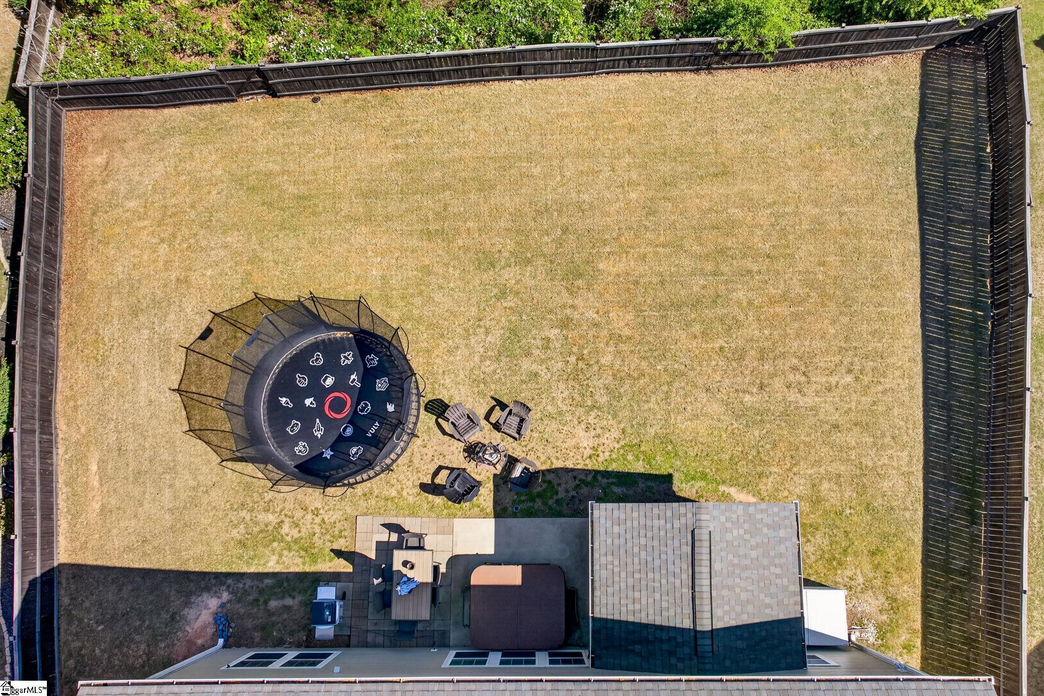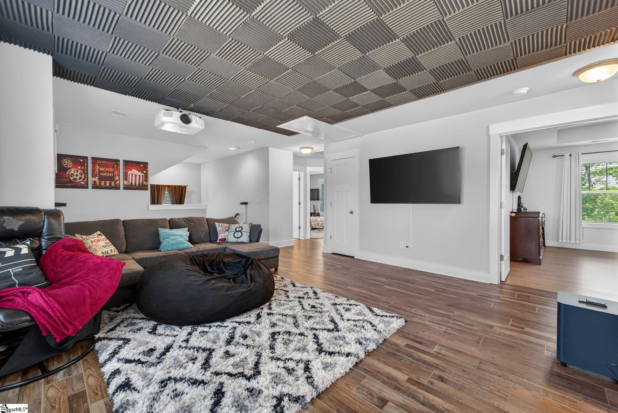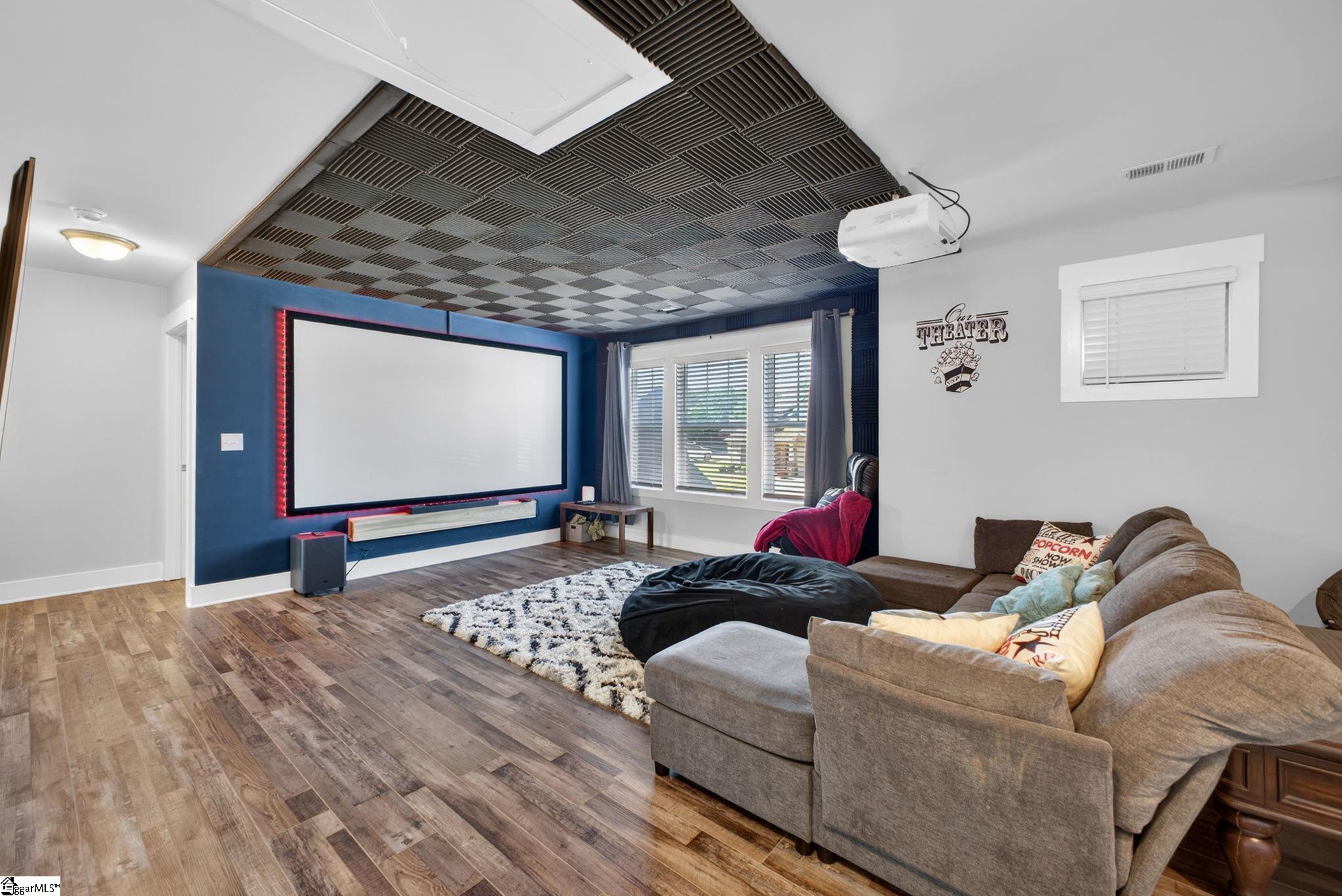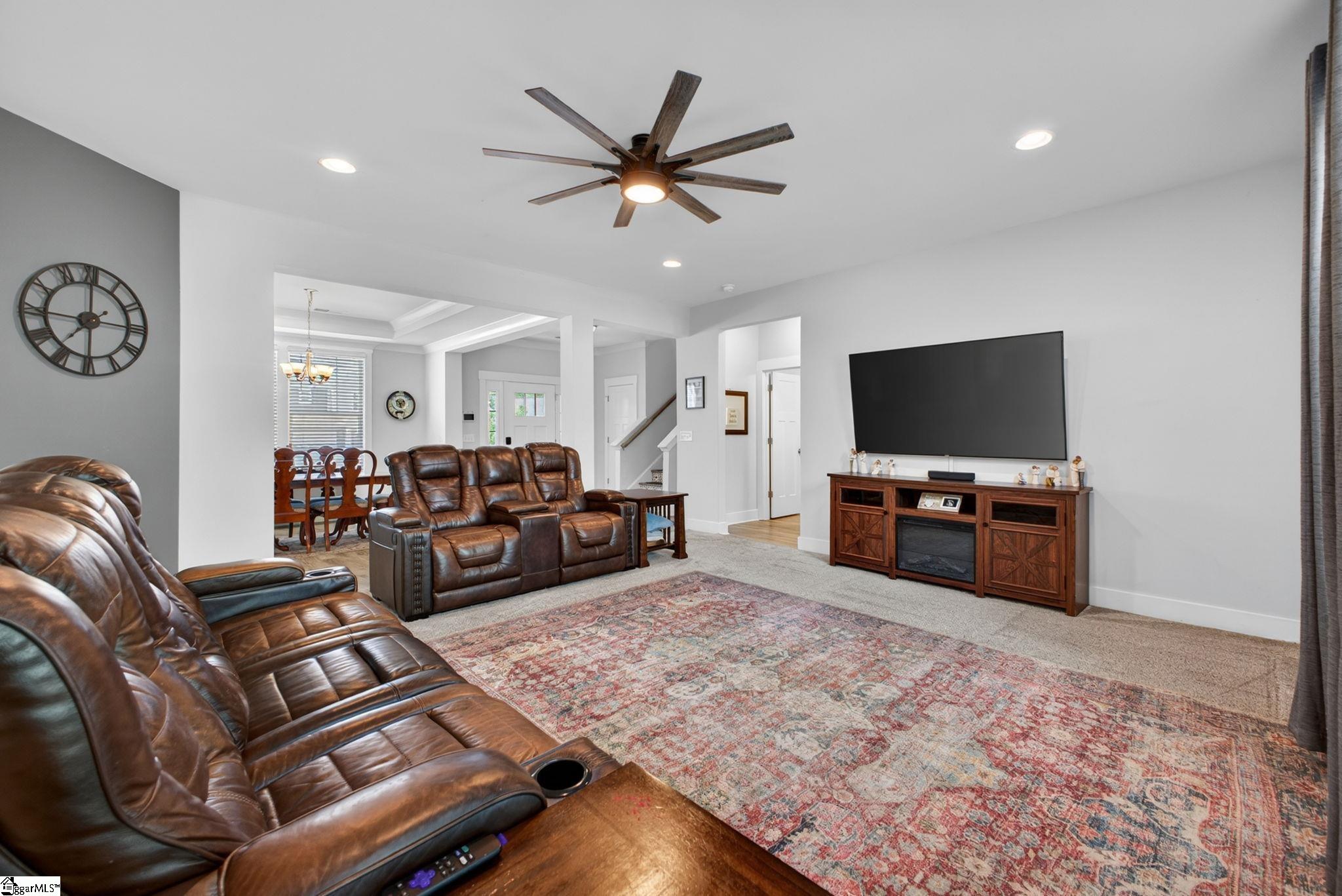 Located in the charming Coventry community just two miles from downtown Simpsonville, this beautiful craftsman-style home offers over 2,600 square feet of modern living space on nearly a half-acre lot. This property features a striking hardboard and stone exterior with a welcoming front porch and an extended paved driveway leading to a home fully equipped for comfort and security, including a 9.6 kW dual-fuel generator with a dedicated home connection. The main level is designed with an open-concept flow, beginning with an oversized foyer. The chef-inspired kitchen has premium granite countertops, a large center island, and upgraded staggered cabinetry. This space flows into the breakfast area and a formal dining room. A bedroom and full bathroom are also located on the main floor, offering an ideal setup for an in-law suite, guest retreat, or office! Upstairs, the expansive primary suite features tray ceilings, a gigantic walk-in closet, and a private bathroom with dual vanities and a tiled shower with a built-in seat. The second level also includes two additional guest bedrooms and a versatile loft that has been professionally transformed into a state-of-the-art home theater, perfect for cinematic movie nights. Outdoor living is truly exceptional on this property. Step out onto the private screened porch to find a backyard oasis that includes a luxury hot tub, a high-end natural gas grill with a permanent connection, and a dedicated play area featuring a premium springless trampoline and low-maintenance rubber mulch. The fenced backyard offers ultimate privacy, with the property line extending into the lush wooded area. Residents of Coventry enjoy neighborhood amenities including a community pool!