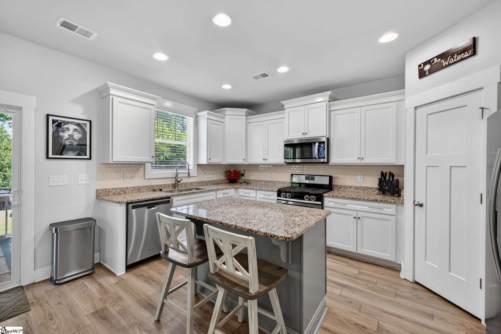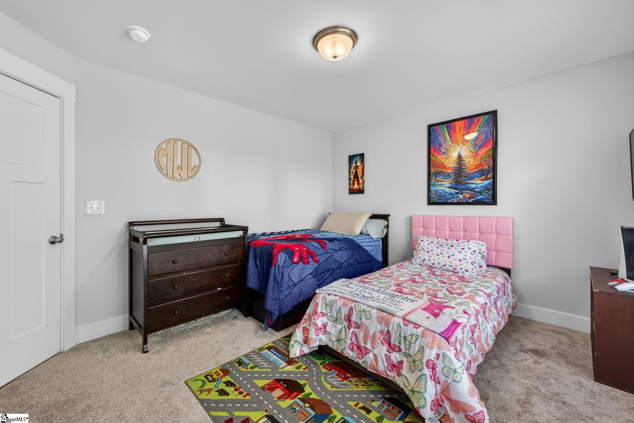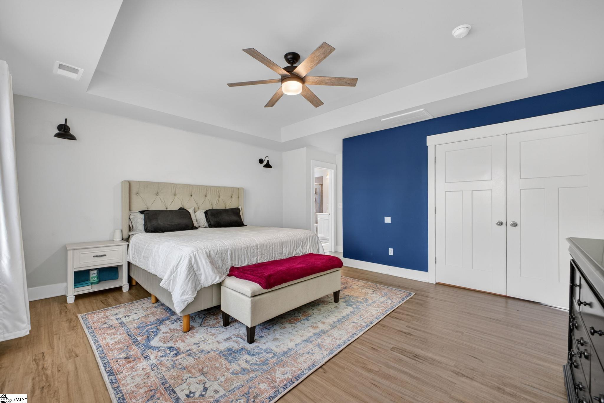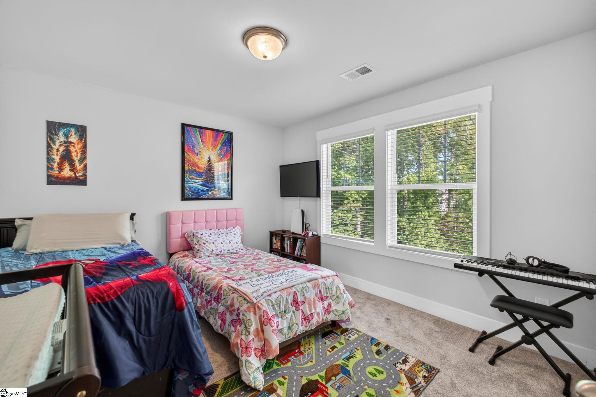 Located in the charming Coventry community just two miles from downtown Simpsonville, this beautiful craftsman-style home offers over 2,600 square feet of modern living space on nearly a half-acre lot. This property features a striking hardboard and stone exterior with a welcoming front porch and an extended paved driveway leading to a home fully equipped for comfort and security, including a 9.6 kW dual-fuel generator with a dedicated home connection. The main level is designed with an open-concept flow, beginning with an oversized foyer. The chef-inspired kitchen has premium granite countertops, a large center island, and upgraded staggered cabinetry. This space flows into the breakfast area and a formal dining room. A bedroom and full bathroom are also located on the main floor, offering an ideal setup for an in-law suite, guest retreat, or office! Upstairs, the expansive primary suite features tray ceilings, a gigantic walk-in closet, and a private bathroom with dual vanities and a tiled shower with a built-in seat. The second level also includes two additional guest bedrooms and a versatile loft that has been professionally transformed into a state-of-the-art home theater, perfect for cinematic movie nights. Outdoor living is truly exceptional on this property. Step out onto the private screened porch to find a backyard oasis that includes a luxury hot tub, a high-end natural gas grill with a permanent connection, and a dedicated play area featuring a premium springless trampoline and low-maintenance rubber mulch. The fenced backyard offers ultimate privacy, with the property line extending into the lush wooded area. Residents of Coventry enjoy neighborhood amenities including a community pool!